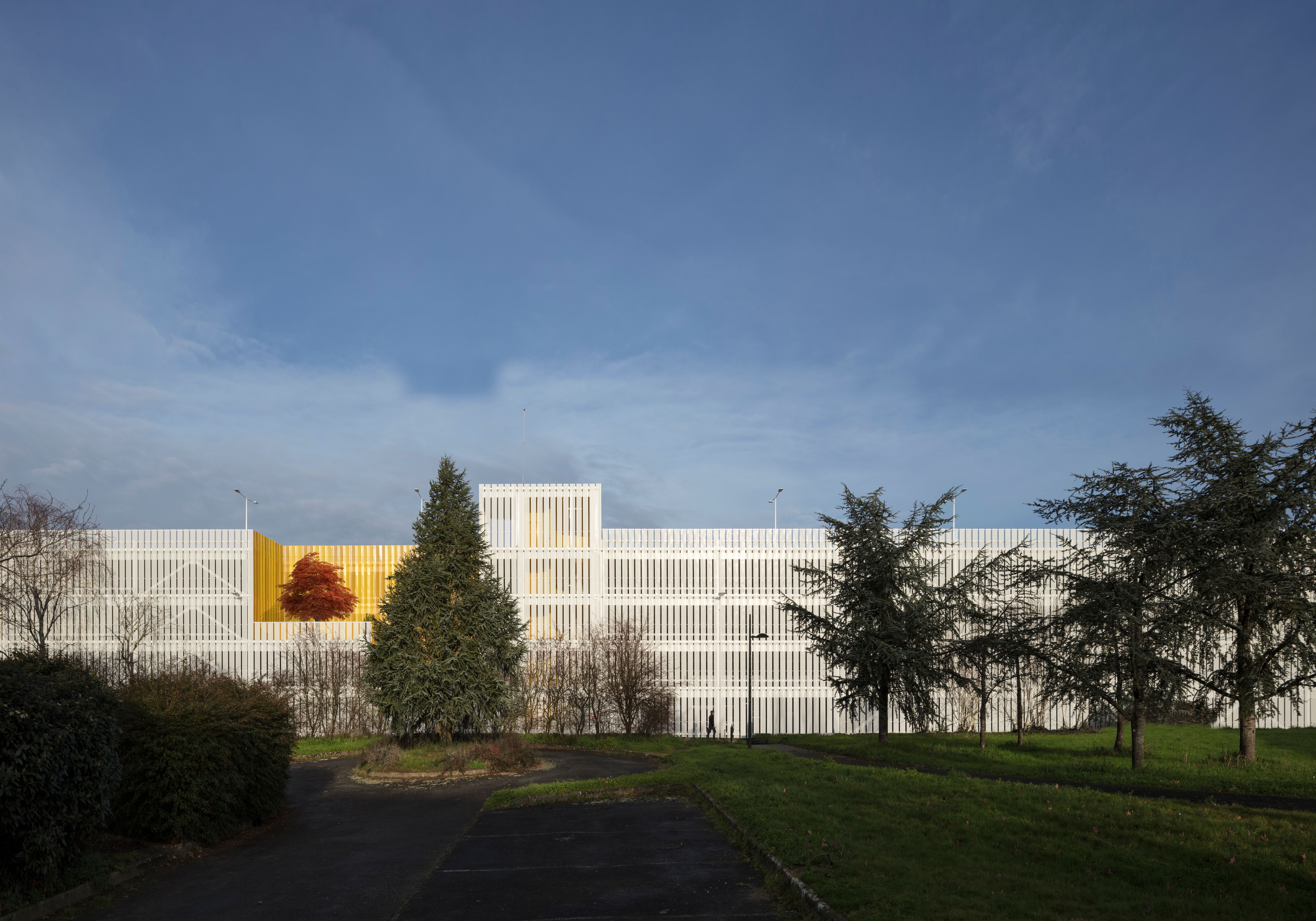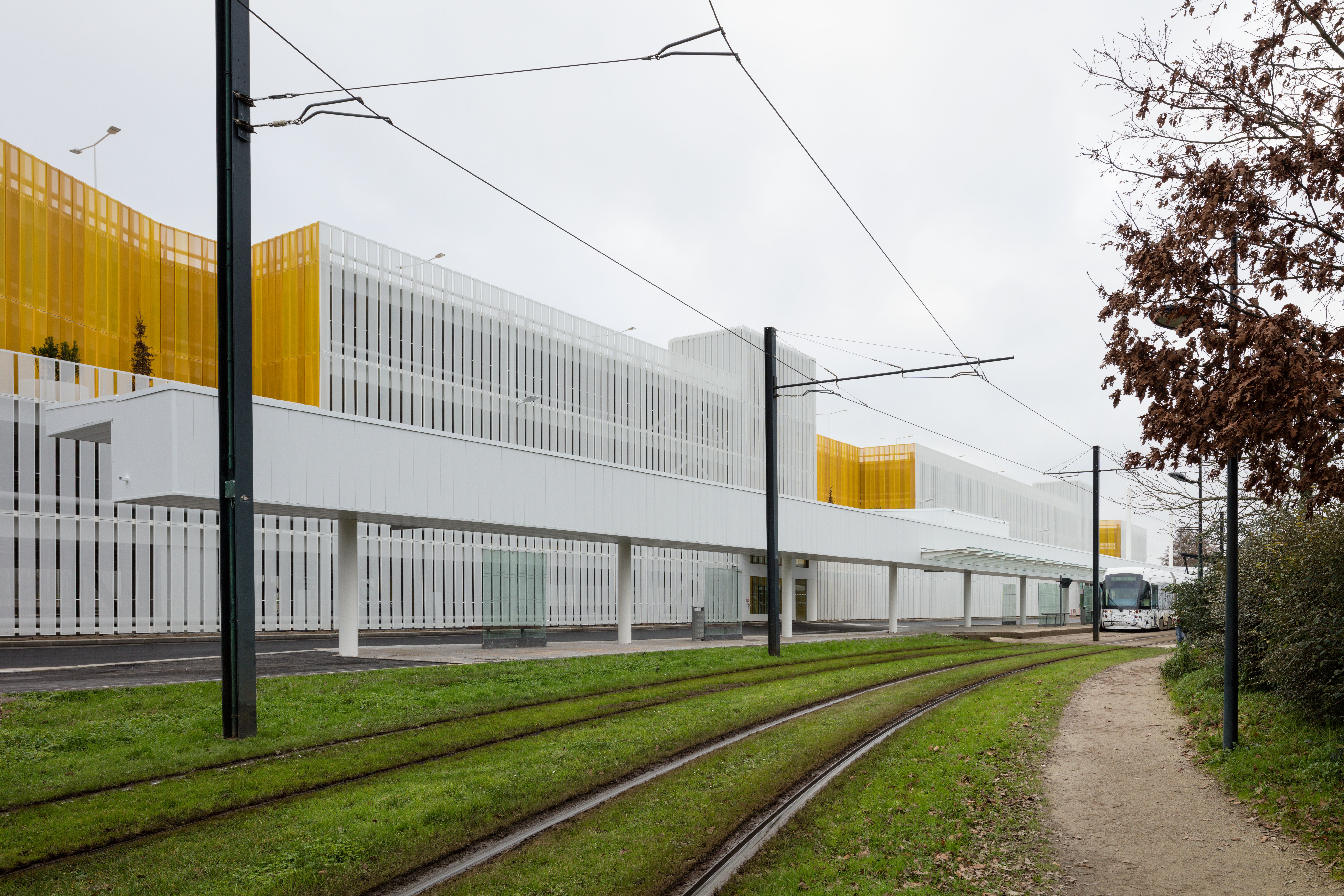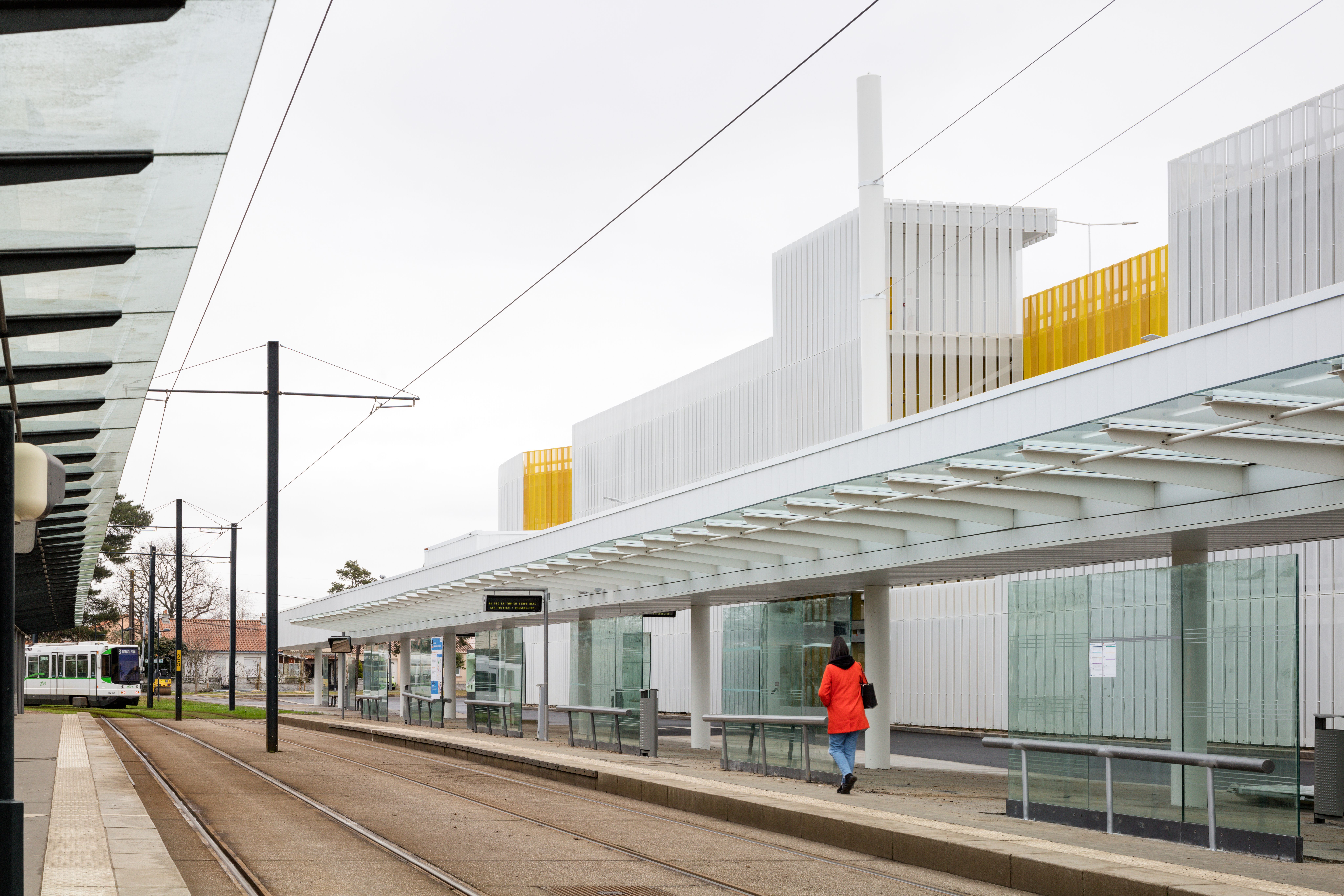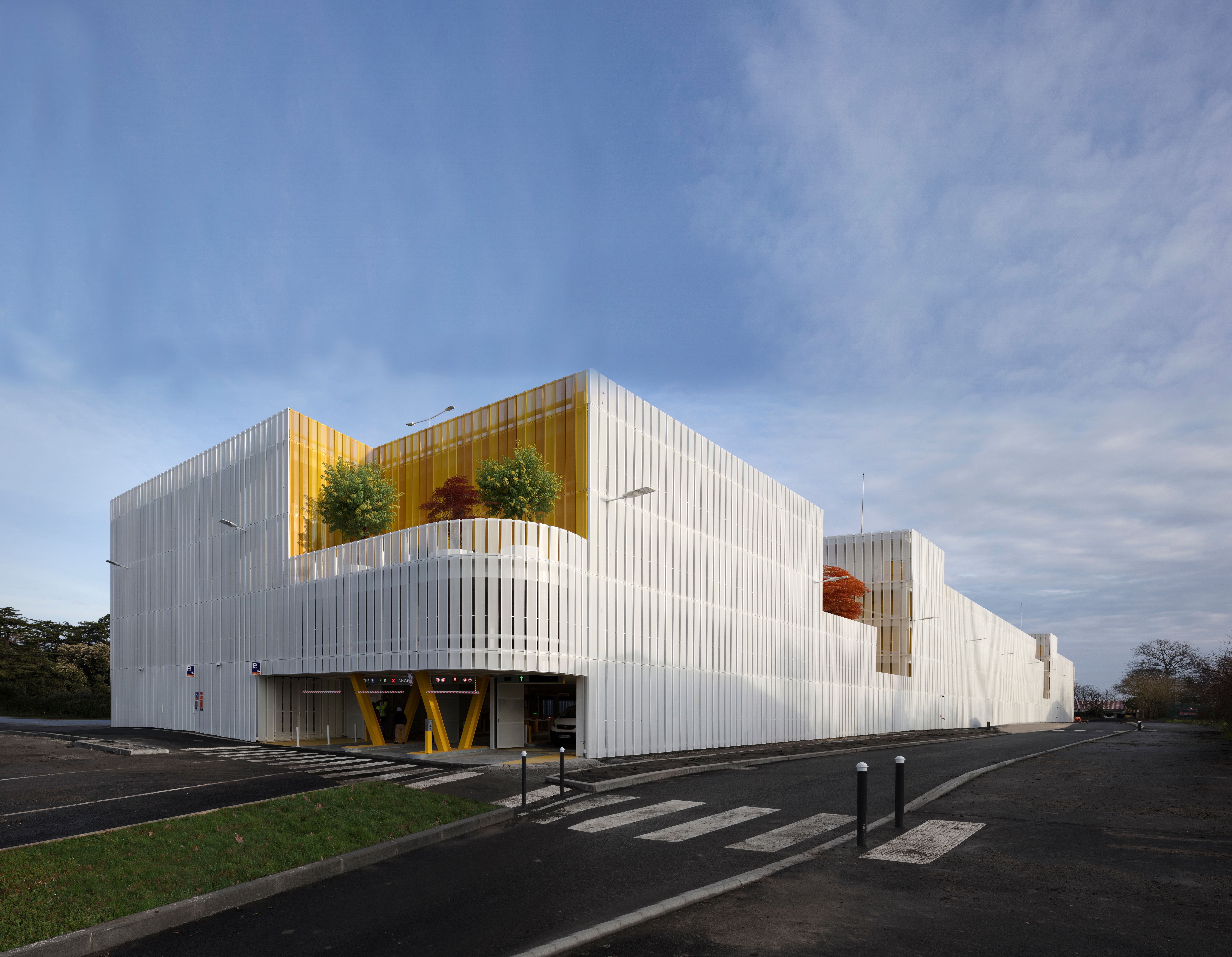 The new terminus of tramway line 3 is being built at the Neustrie site. Located close to Nantes' ring road, it connects the urban periphery with the city centers within the agglomeration of Nantes. It is part of a context that is still developing and changing where urbanity and natural landscape mix. The groves of trees on Rue de la Neustrie frame the view of the site. It is experienced as an open and permeable space that allows direct pedestrian access and continuity from the college, the neighboring sports facilities and suburban areas. The new complex must blend harmoniously into this environment while preserving the existing landscape. As well as increasing parking capacity, the aim is to ensure pedestrian safety and comfort, simplify connections between modes of transport, and reduce distances from bus and tramway platforms. Identical materials and a strong, clear and simple geometry create a coherent overall image: the general structure is covered with a "skin" consisting of white vertical blades painted with expanded metal, which goes beyond the role of natural ventilation, giving a light and elegant image and requiring no maintenance. The vibration of the façade is amplified on the terrace level, whose green leaf color reinforces the green presence. The building, like the castle, will be transformed into a new urban landmark and an architectural quality benchmark on a landscape scale.