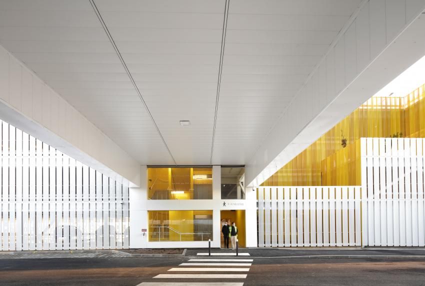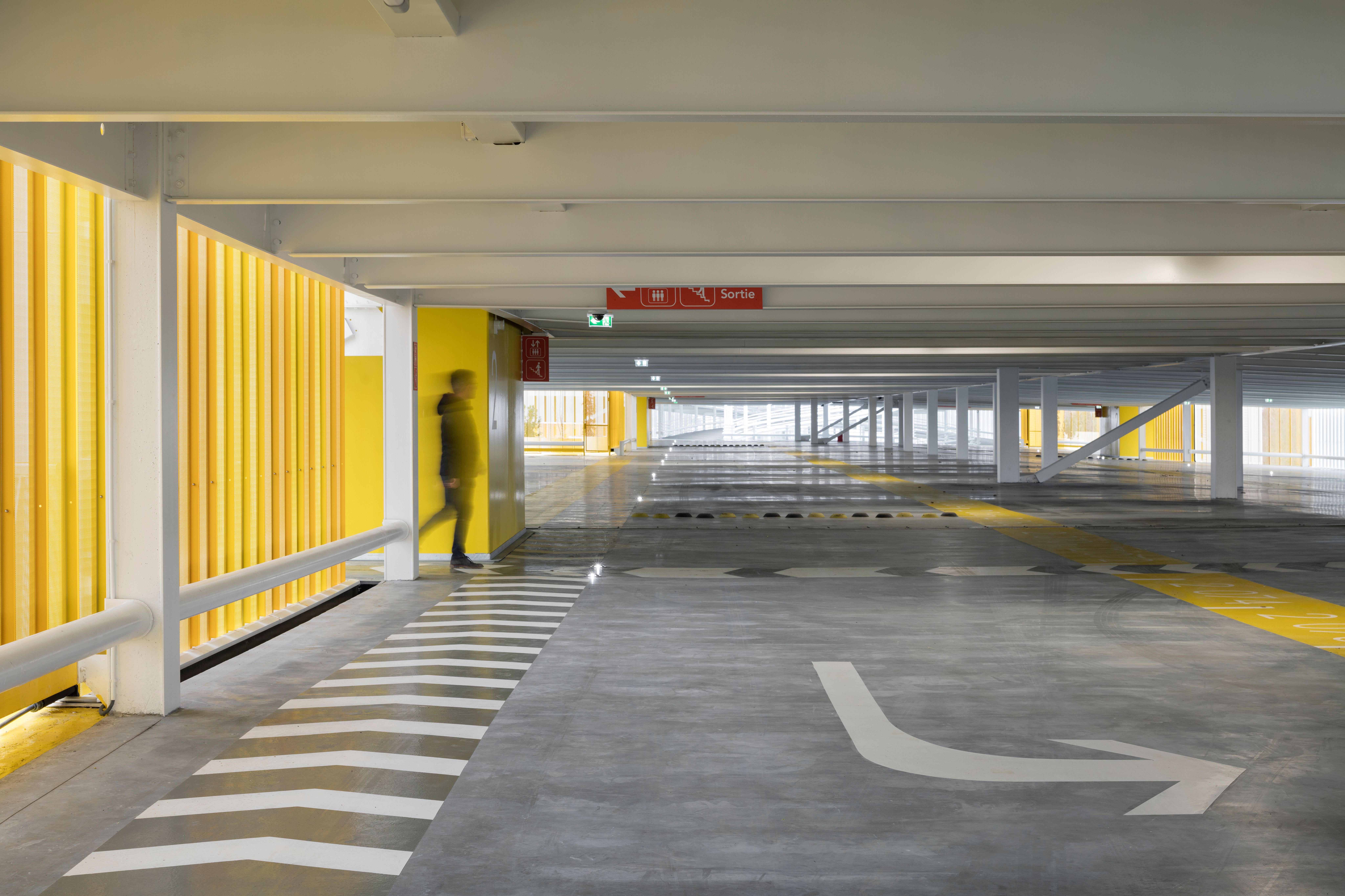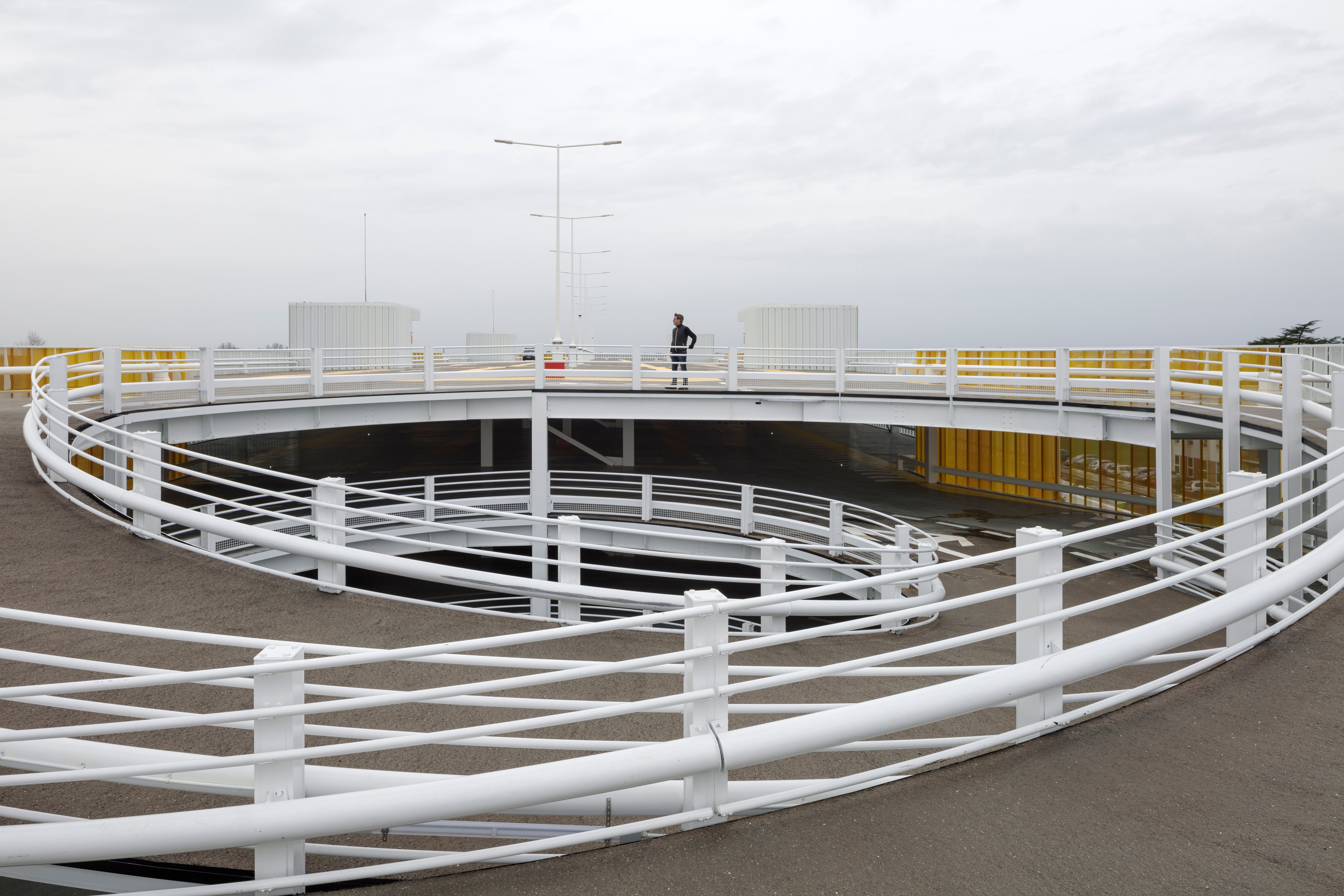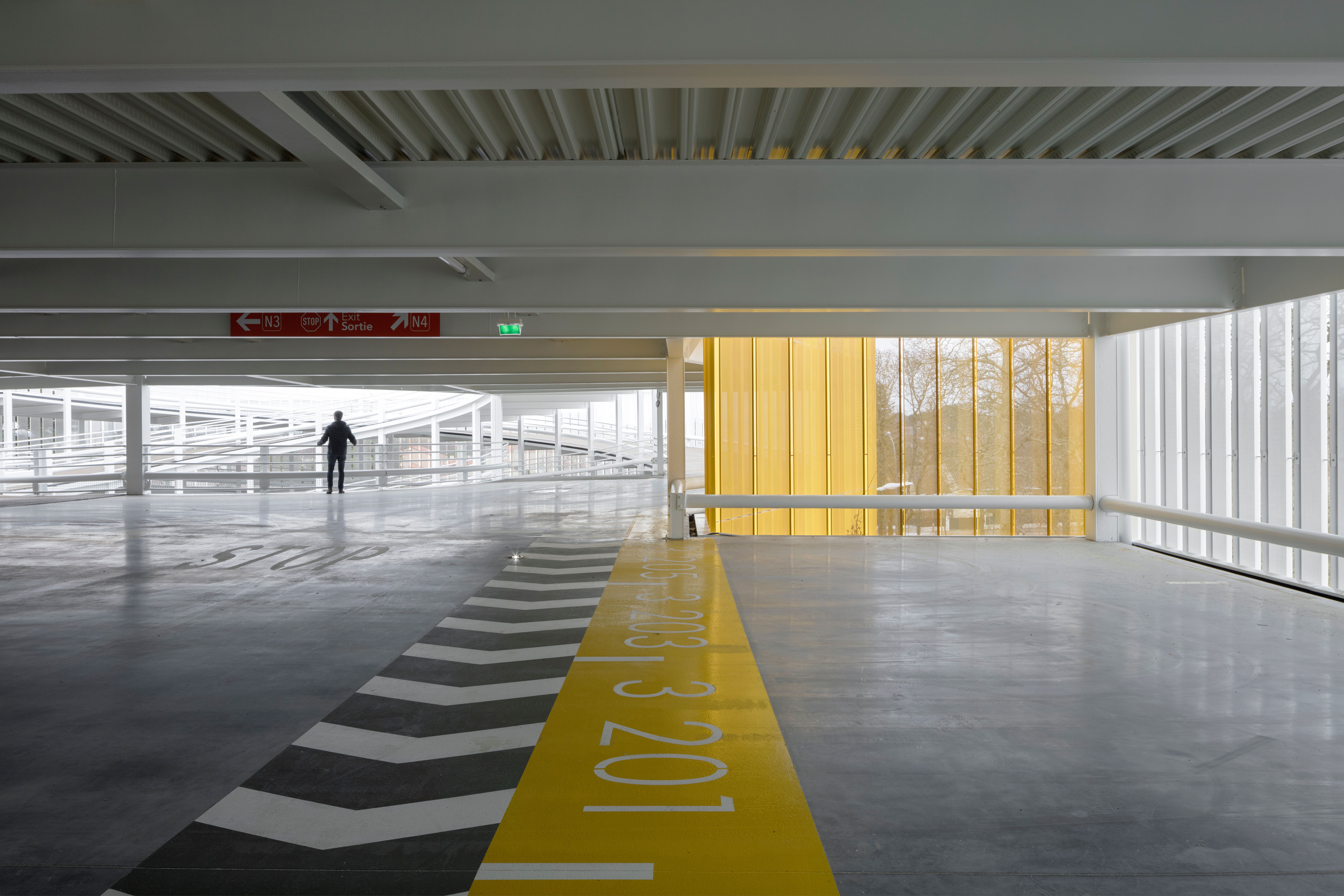 The new terminus of tramway line 3 is being built at the Neustrie site. Located close to Nantes' ring road, it connects the urban periphery with the city centers within the agglomeration of Nantes. It is part of a context that is still developing and changing where urbanity and natural landscape mix. The groves of trees on Rue de la Neustrie frame the view of the site. It is experienced as an open and permeable space that allows direct pedestrian access and continuity from the college, the neighboring sports facilities and suburban areas. The new complex must blend harmoniously into this environment while preserving the existing landscape. As well as increasing parking capacity, the aim is to ensure pedestrian safety and comfort, simplify connections between modes of transport, and reduce distances from bus and tramway platforms. Identical materials and a strong, clear and simple geometry create a coherent overall image: the general structure is covered with a "skin" consisting of white vertical blades painted with expanded metal, which goes beyond the role of natural ventilation, giving a light and elegant image and requiring no maintenance. The vibration of the façade is amplified on the terrace level, whose green leaf color reinforces the green presence. The building, like the castle, will be transformed into a new urban landmark and an architectural quality benchmark on a landscape scale.