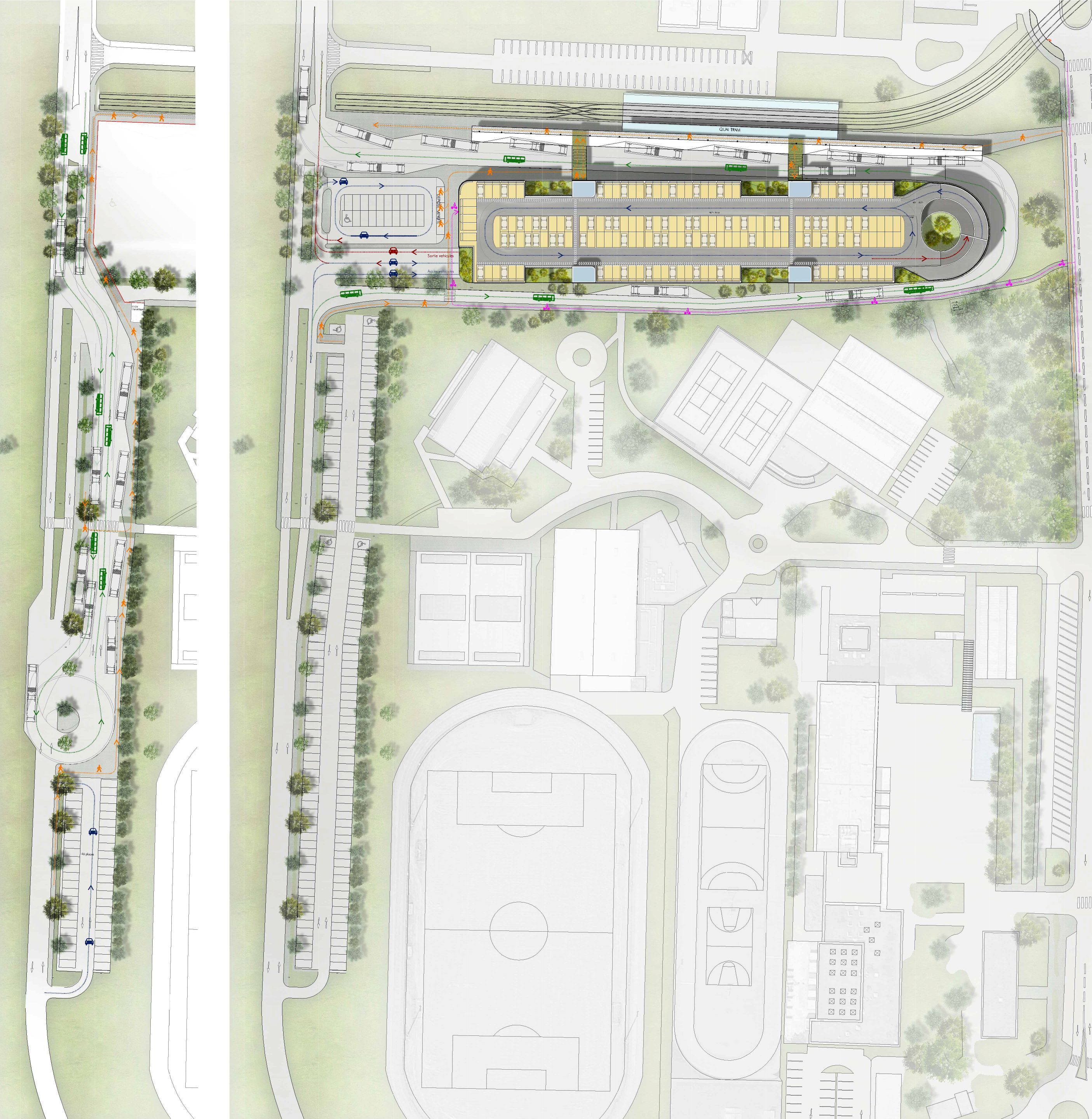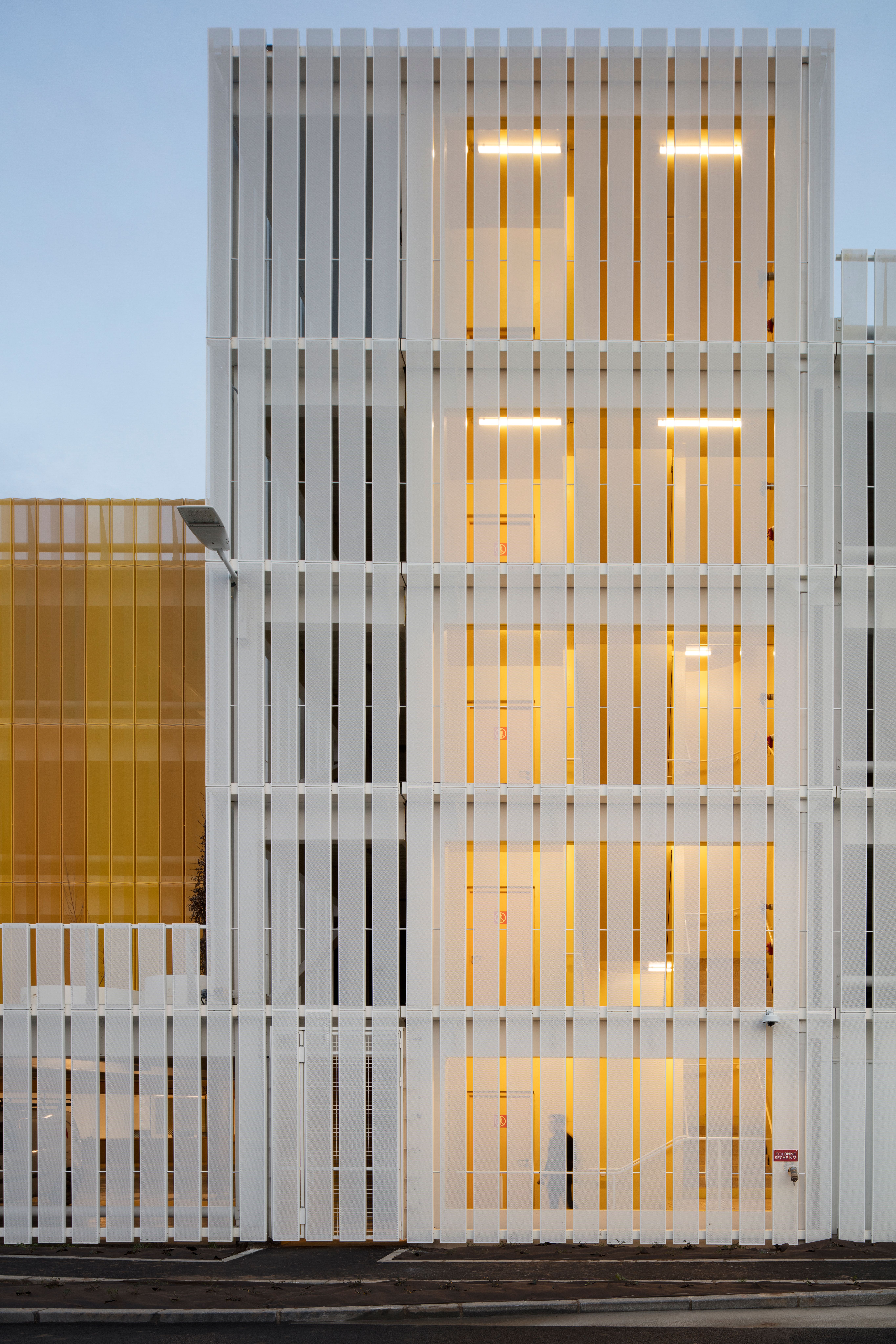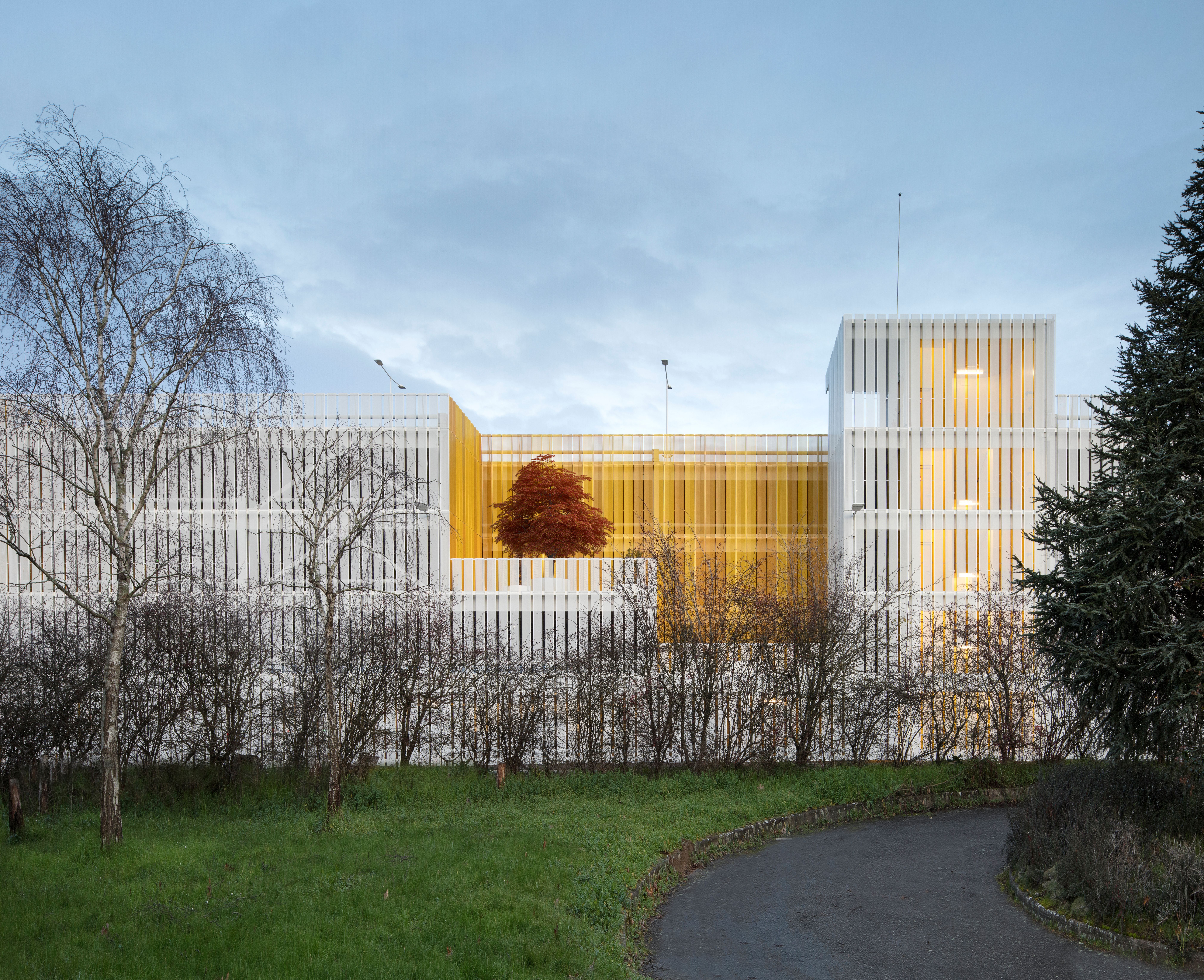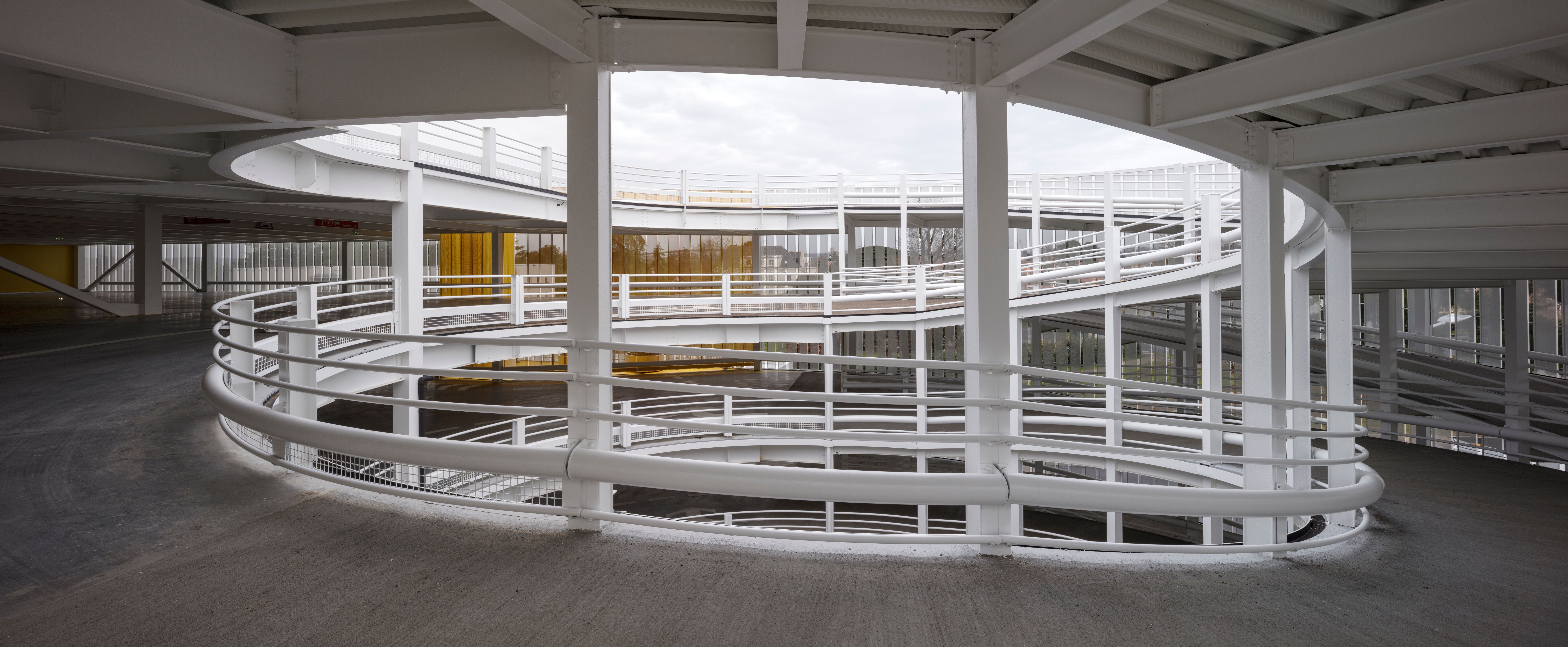 The new terminus of tramway line 3 is being built at the Neustrie site. Located close to Nantes' ring road, it connects the urban periphery with the city centers within the agglomeration of Nantes. It is part of a context that is still developing and changing where urbanity and natural landscape mix. The groves of trees on Rue de la Neustrie frame the view of the site. It is experienced as an open and permeable space that allows direct pedestrian access and continuity from the college, the neighboring sports facilities and suburban areas. The new complex must blend harmoniously into this environment while preserving the existing landscape. As well as increasing parking capacity, the aim is to ensure pedestrian safety and comfort, simplify connections between modes of transport, and reduce distances from bus and tramway platforms. Identical materials and a strong, clear and simple geometry create a coherent overall image: the general structure is covered with a "skin" consisting of white vertical blades painted with expanded metal, which goes beyond the role of natural ventilation, giving a light and elegant image and requiring no maintenance. The vibration of the façade is amplified on the terrace level, whose green leaf color reinforces the green presence. The building, like the castle, will be transformed into a new urban landmark and an architectural quality benchmark on a landscape scale.