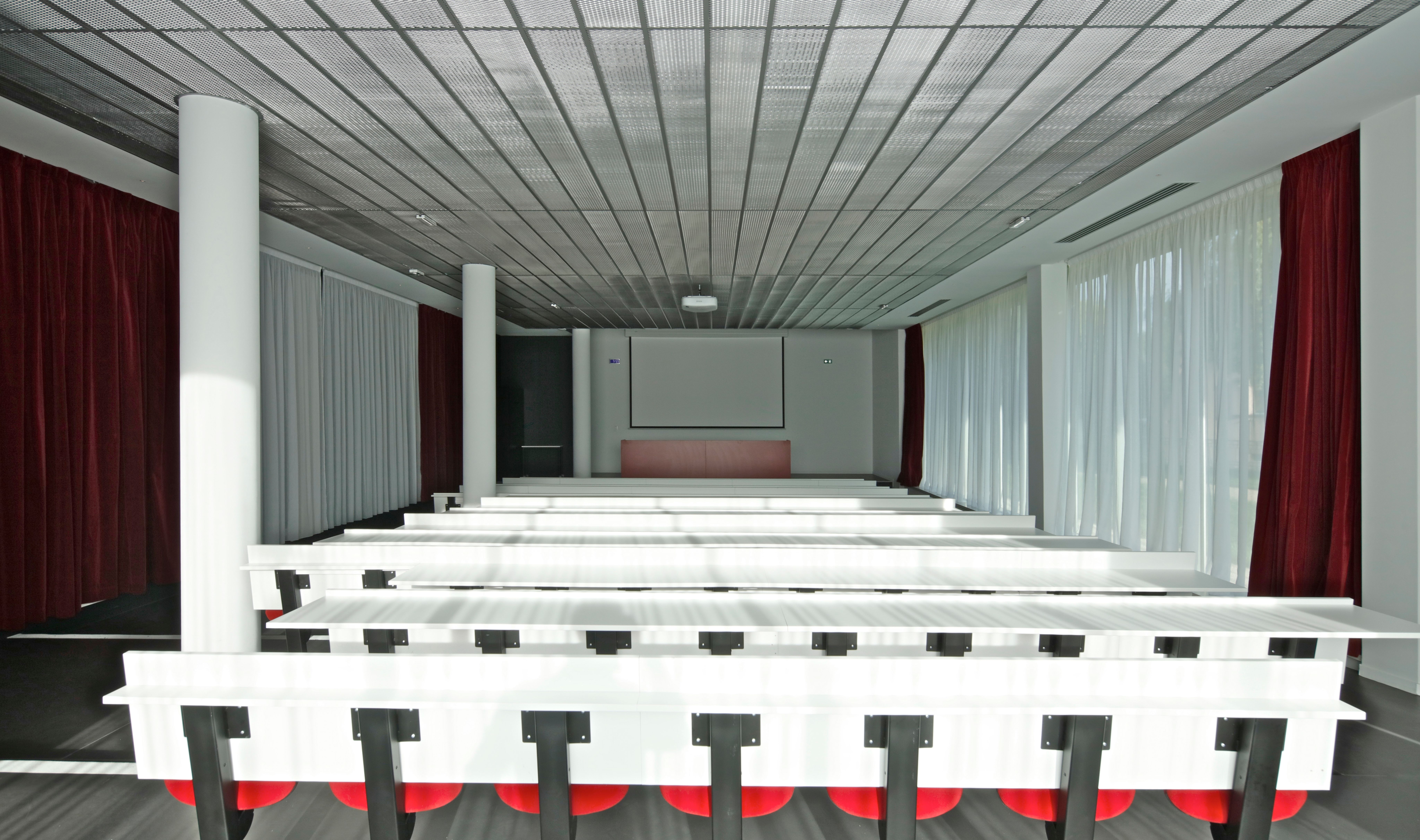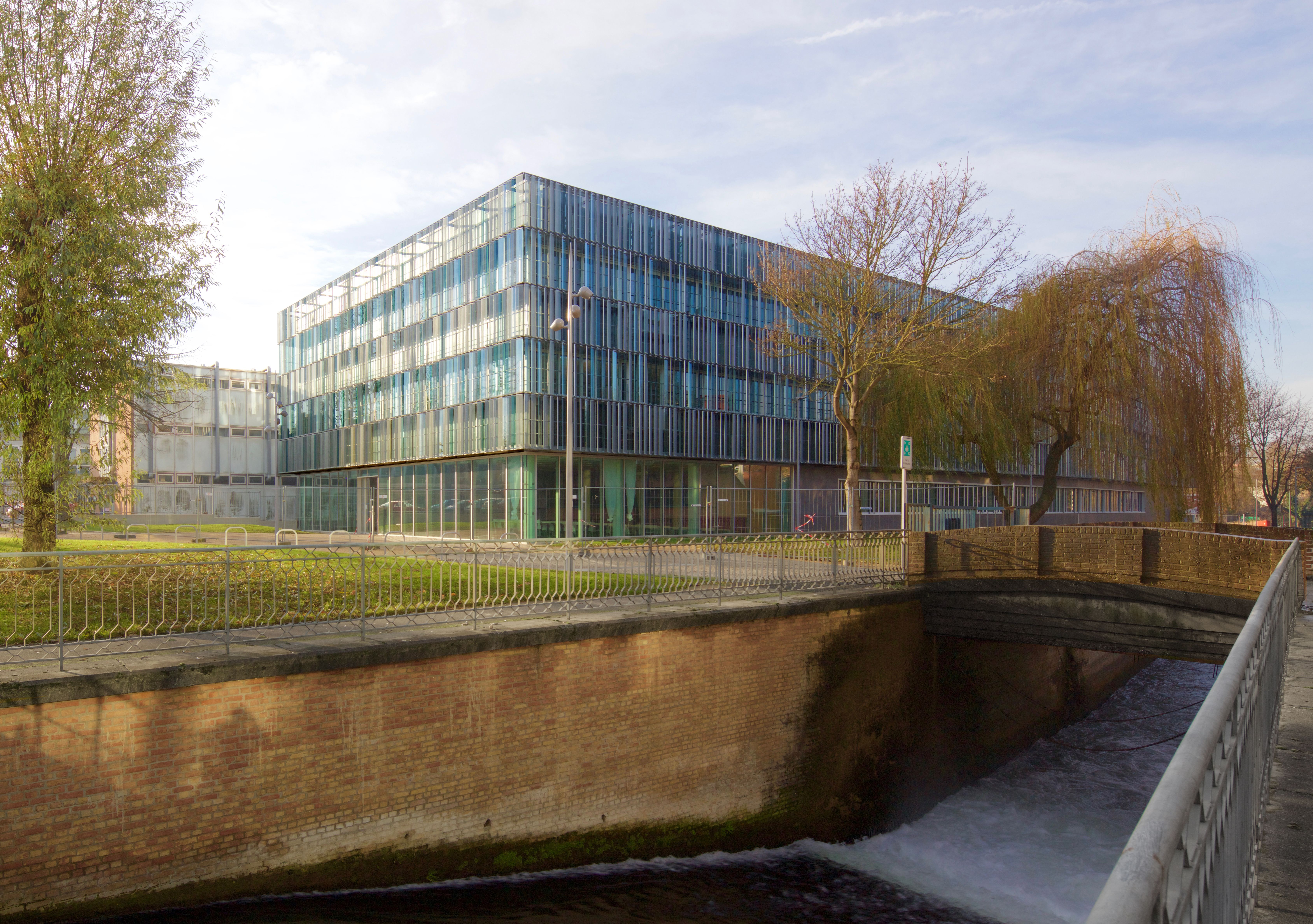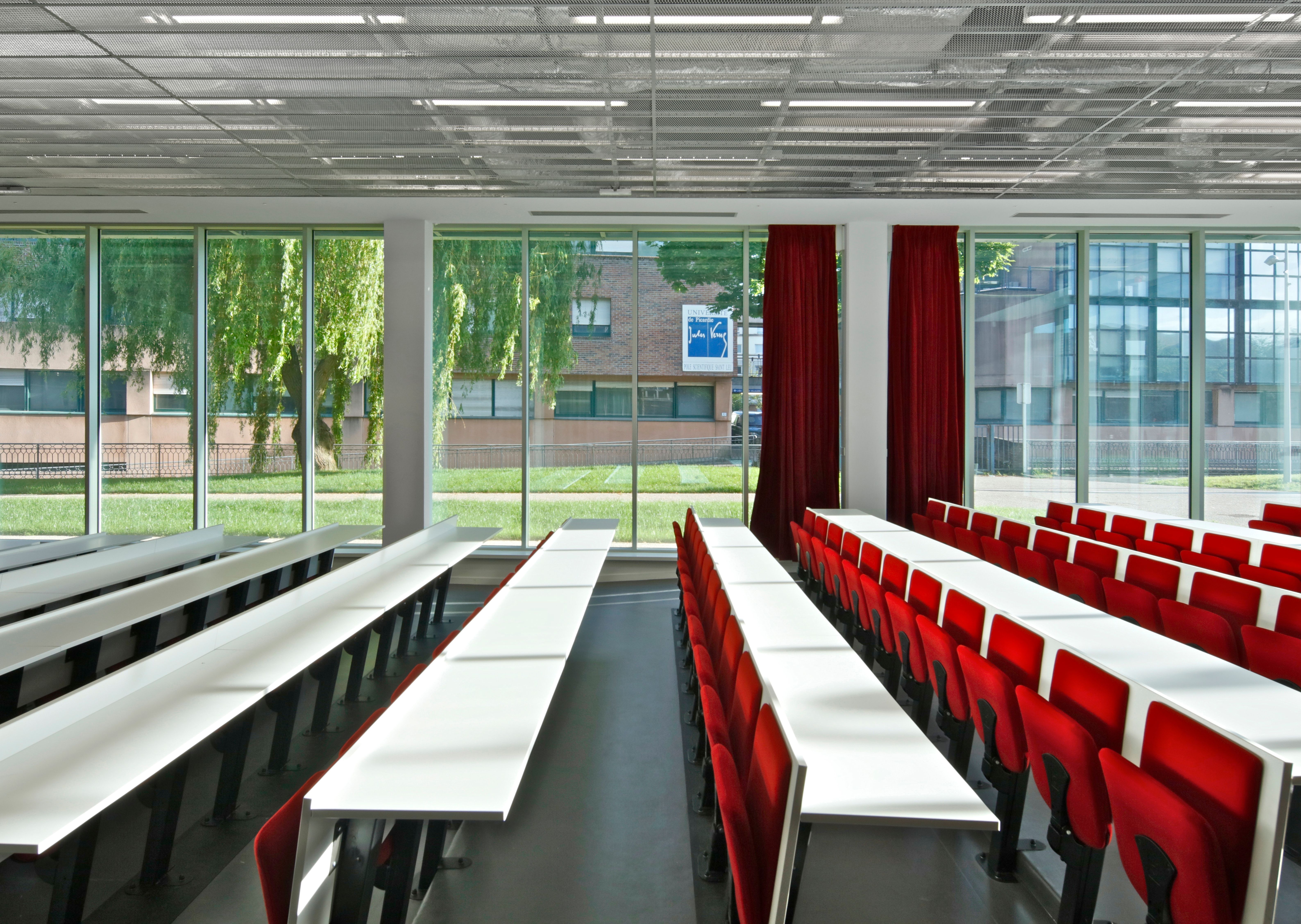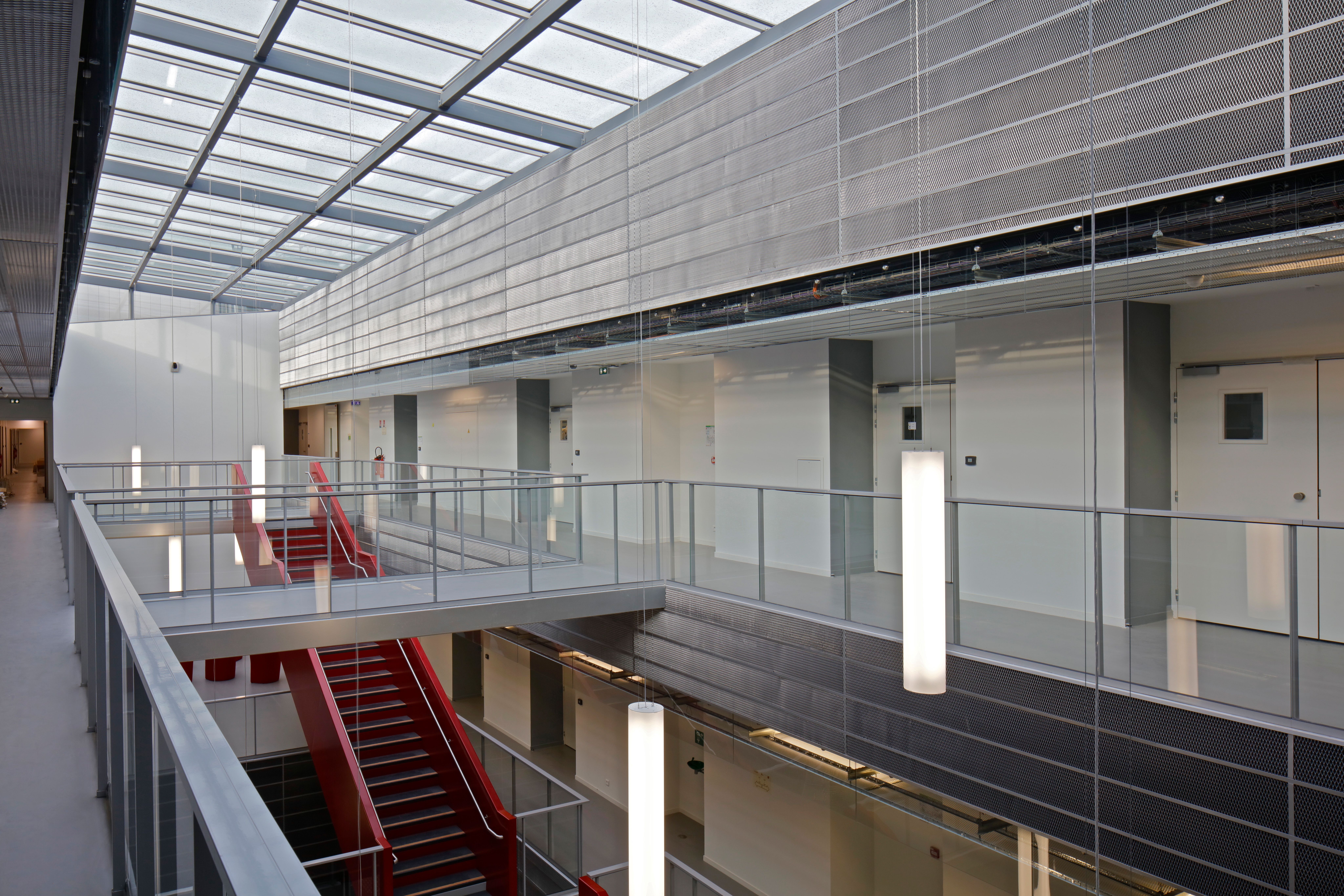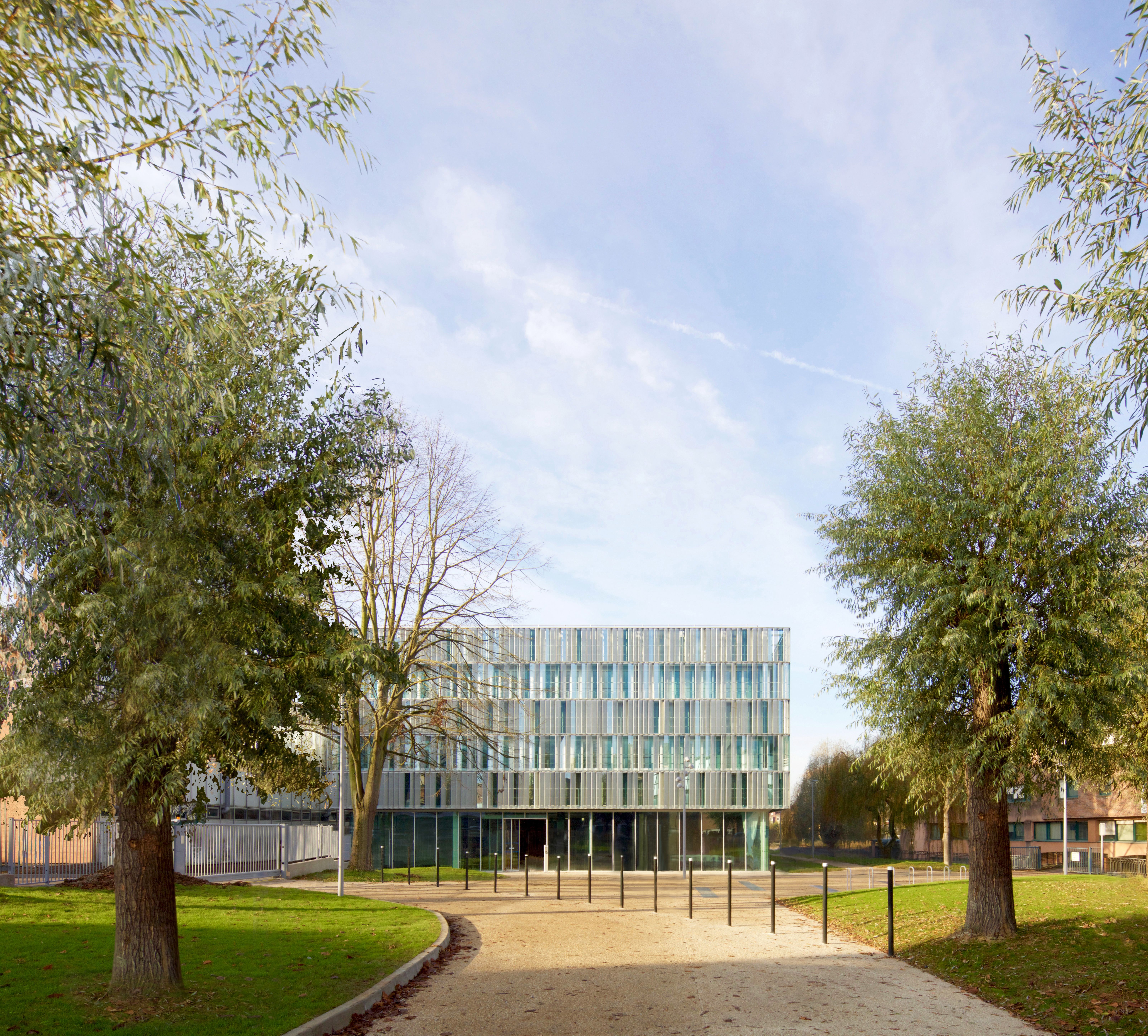 The design for the institute building responds in a material and formal manner to the features of the Saint-Leu district and the city of Amiens, which is characterised by its past as centre of the early textile industry. In harmony with its location and function as a research facility for electrochemical energy storage, this building mediates the basic ideas of research, exchange and reception with a sensitive, simple statement concerned with good use of the space. A large glazed façade marks the entrance area. As soon as they arrive in the entrance hall, visitors and researchers can make visual connections with every floor of the multi-storey atrium, thus discovering relationships between the individual research levels. The exterior façade appears as a play of vertical layers in which fixed glass sun protection lamella in aquatic colours alternate with perforated metal lamella. To acknowledge the industrial past, the materials employed are not noble or precious, but practical and durable. Anthracite-coloured polymer concrete panels in the plinth area provide a solid visual anchoring in the ground and form a point of contrast with the playful lightness of the façade.