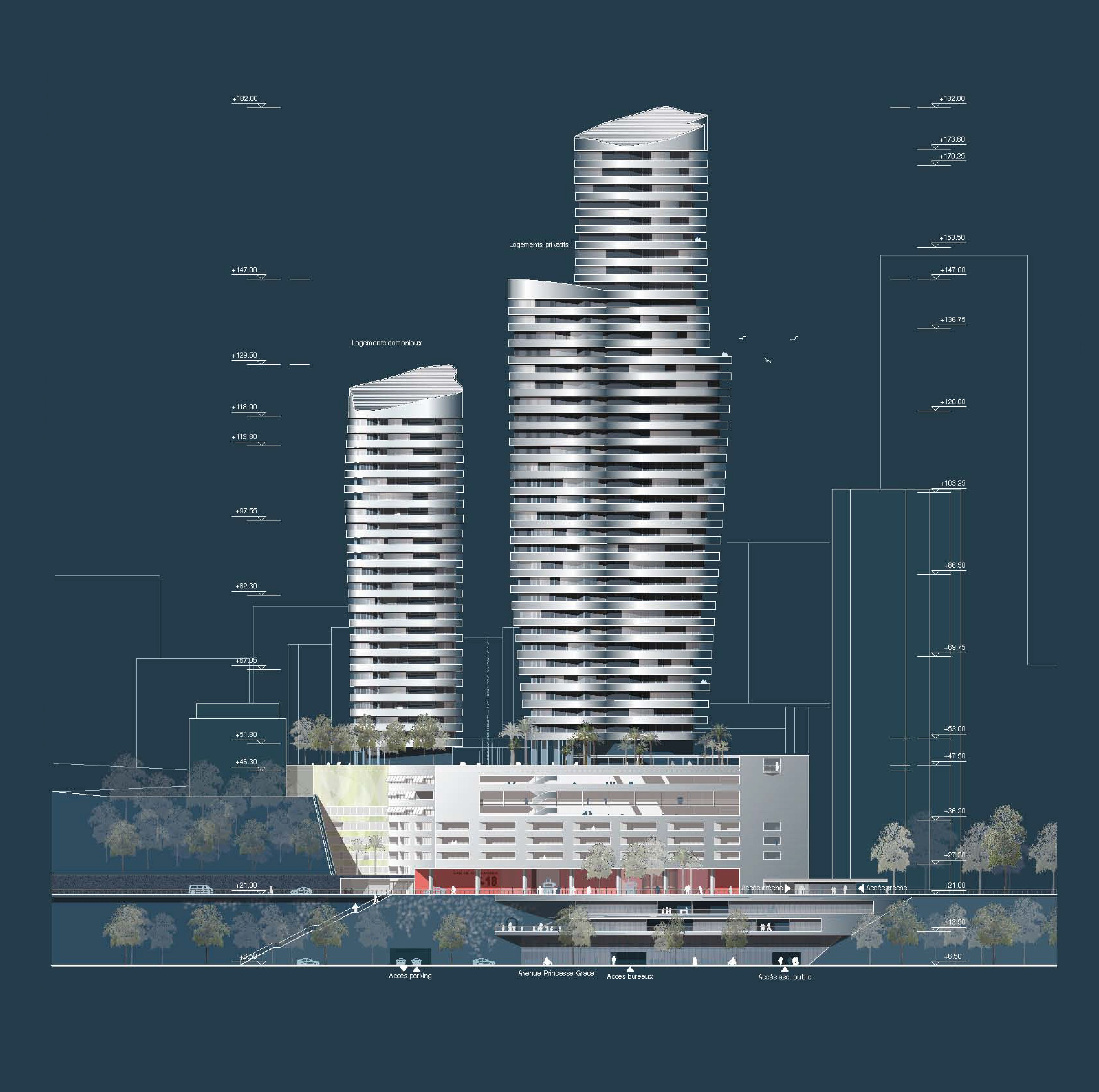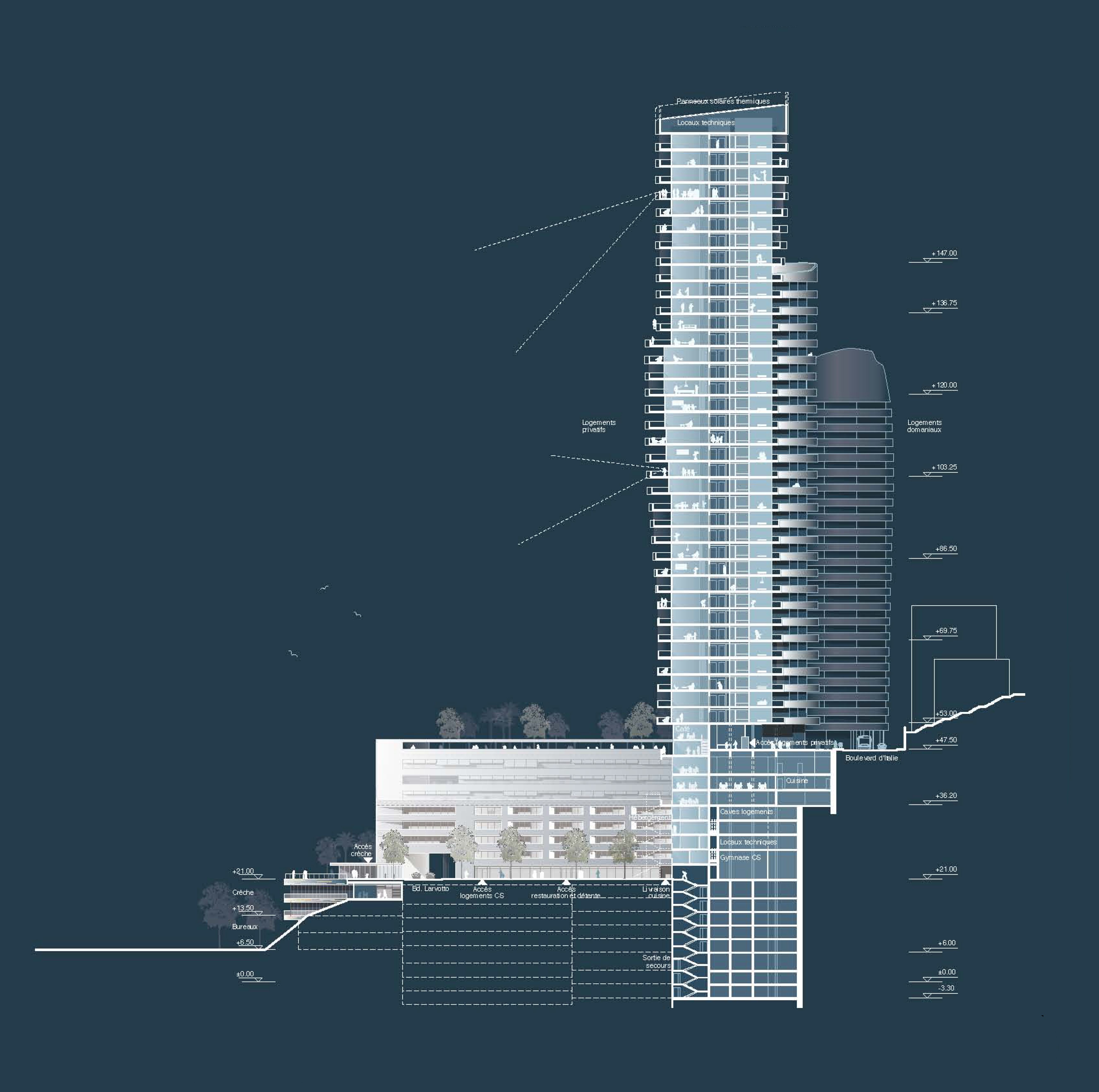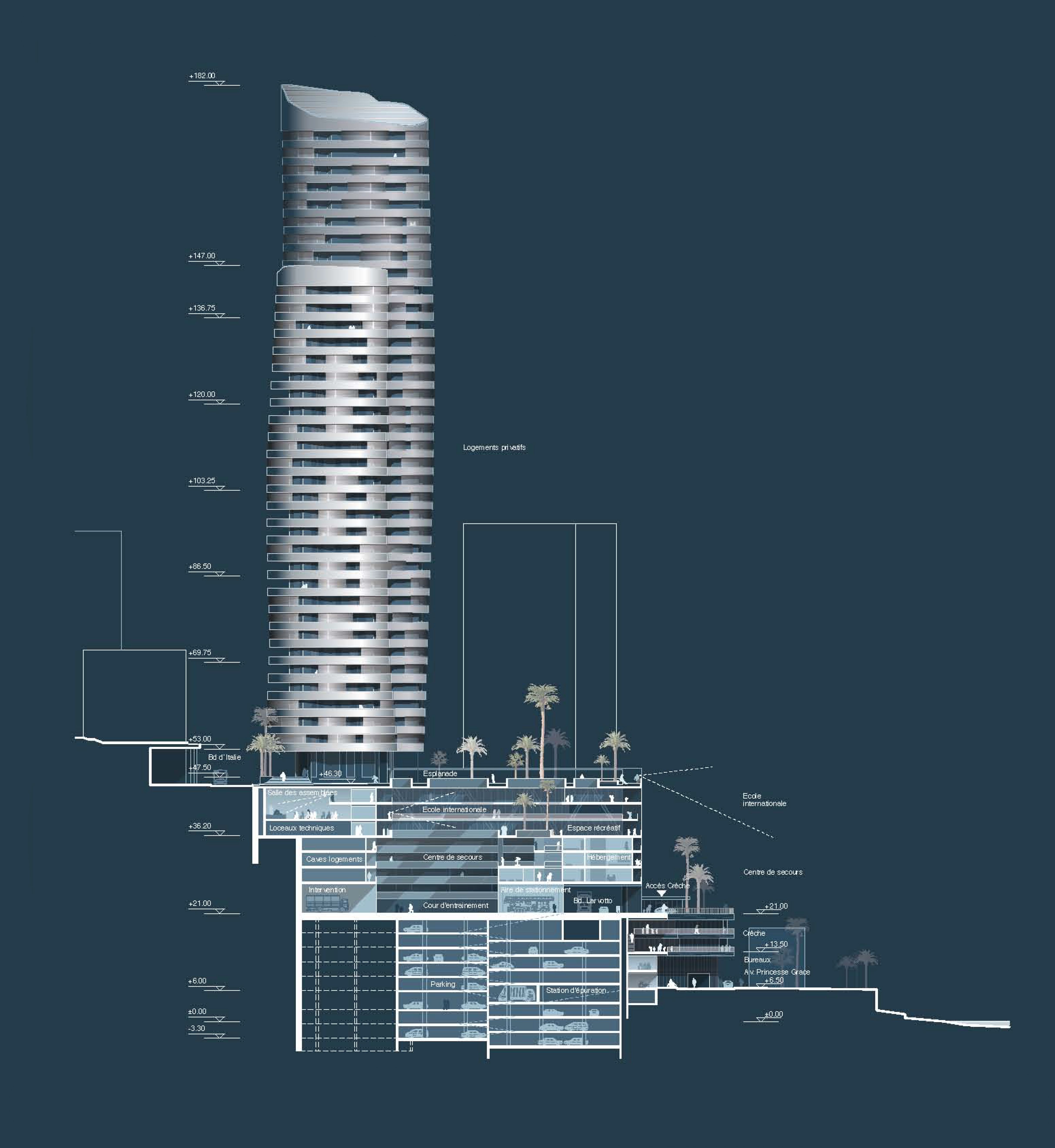 The justification for a multi-purpose programme is to respond to priority needs that are not necessarily complementary, and to this must be added the need to transcribe a project that identifies the legibility and coherence of the work. The operation includes: - a fire station with 36 lodgings and four rooms for trainees, an intervention centre with a guardhouse, firefighters' preparation rooms and a garage (five cells), as well as associated functions (in particular technical workshops, fuel storage tanks, and a manoeuvring yard), an administrative and training centre (theoretical training), a collective catering and relaxation centre, a centre for the technical functions of the fire station with specific dimensional constraints; - a nursery with 50 cots divided into four units of 10-15 children, with general services, a preparation kitchen, and adapted outdoor areas; - tertiary activity areas including a business centre of approximately 1,000 m² and 9,000 m² of high quality offices; - approximately 20,000 m² of residential premises, including 120 state-owned flats, mostly F2s and F3s (14 of which will eventually be used by the fire station) and the rest in a hotel residence including top-of-the-range flats, from studios to six rooms, as well as room service/housekeeping; - the International School of Monaco, a private educational establishment (720 students), offering a curriculum from nursery to final year; - a luxury cinema complex; - a public space with a surface area of no less than 1,500 m².