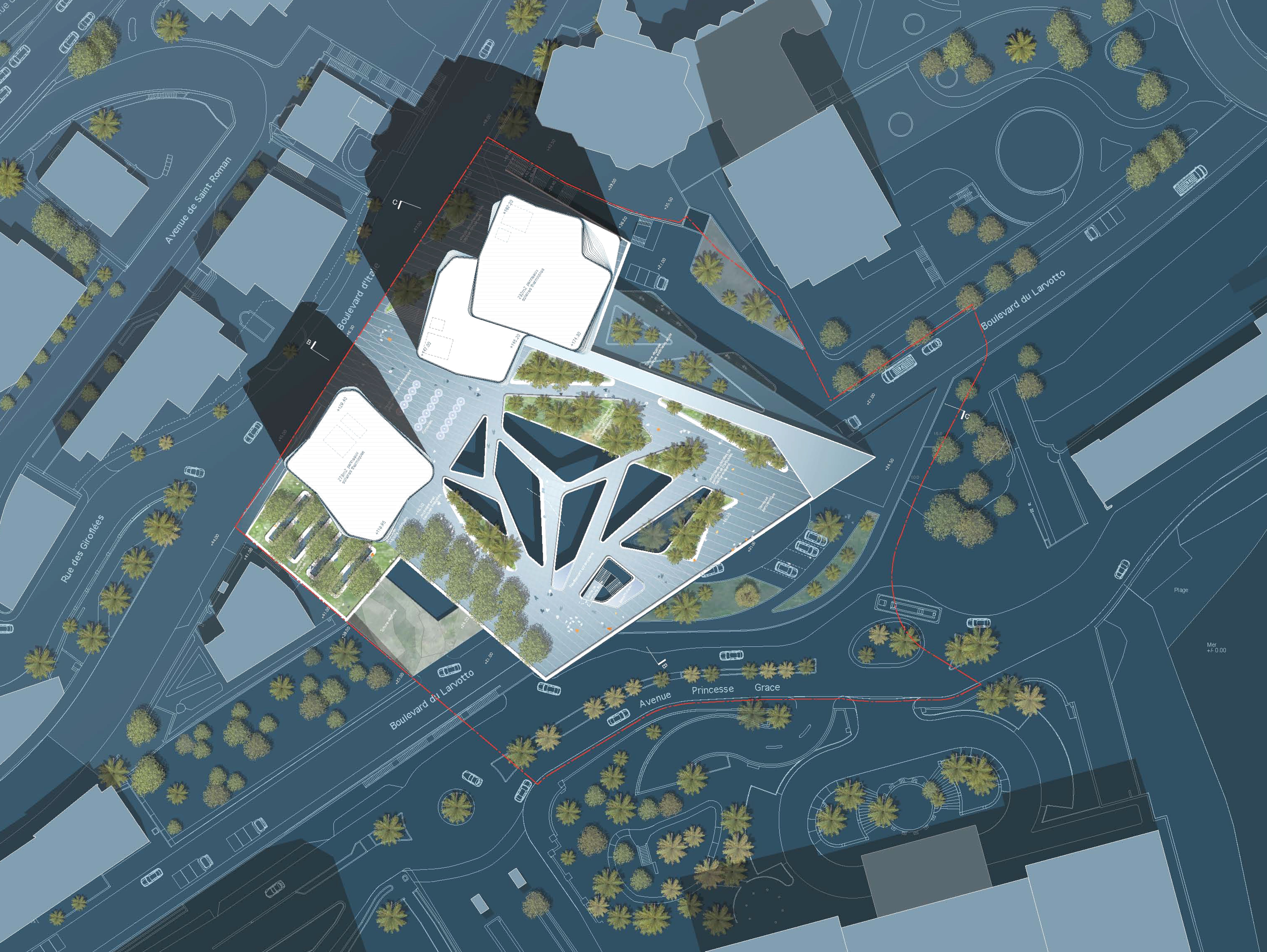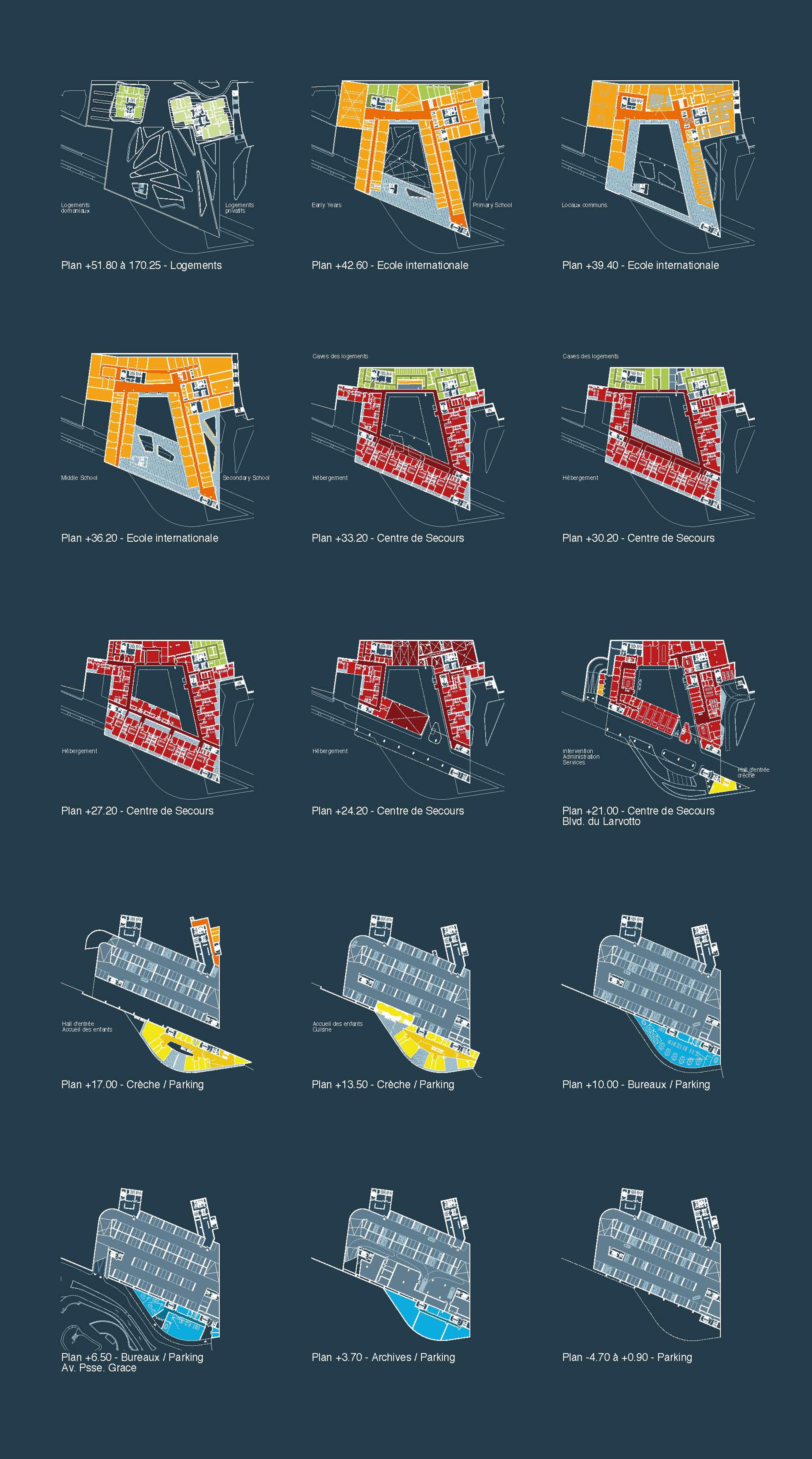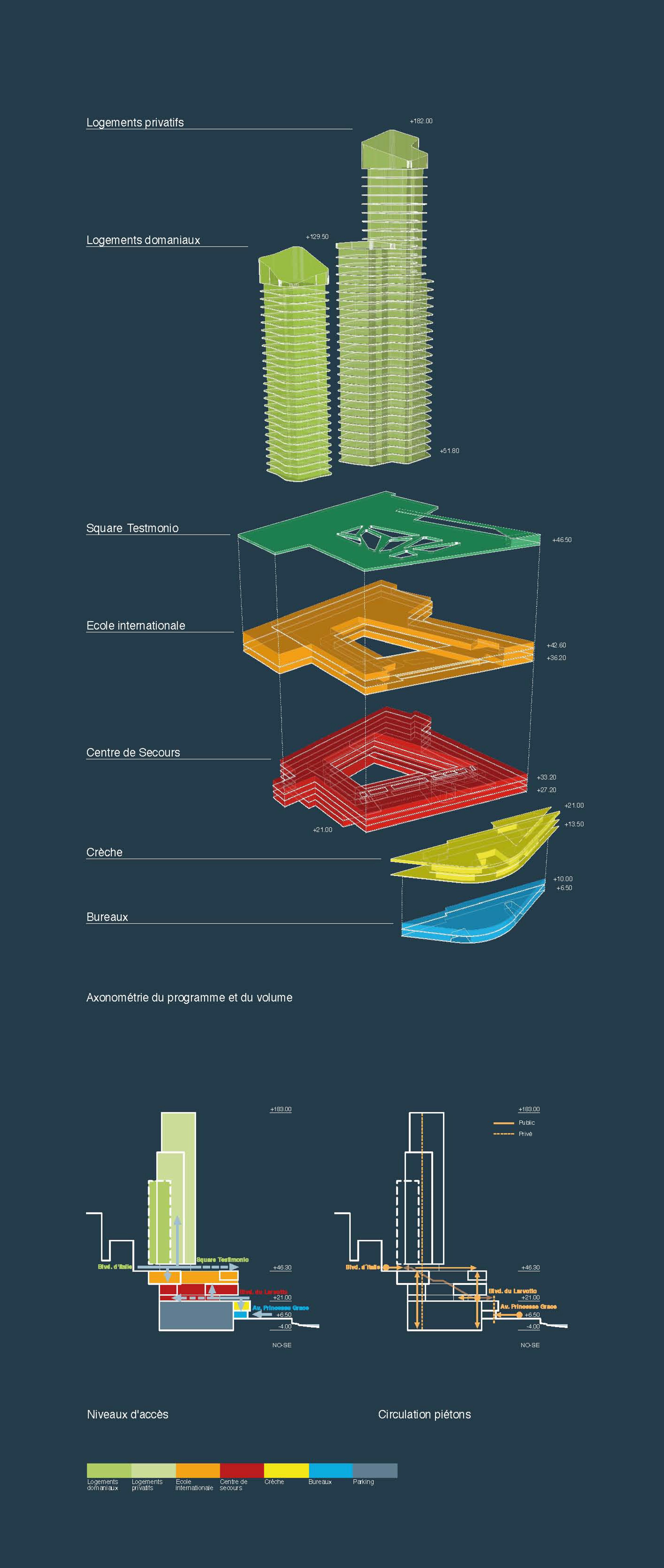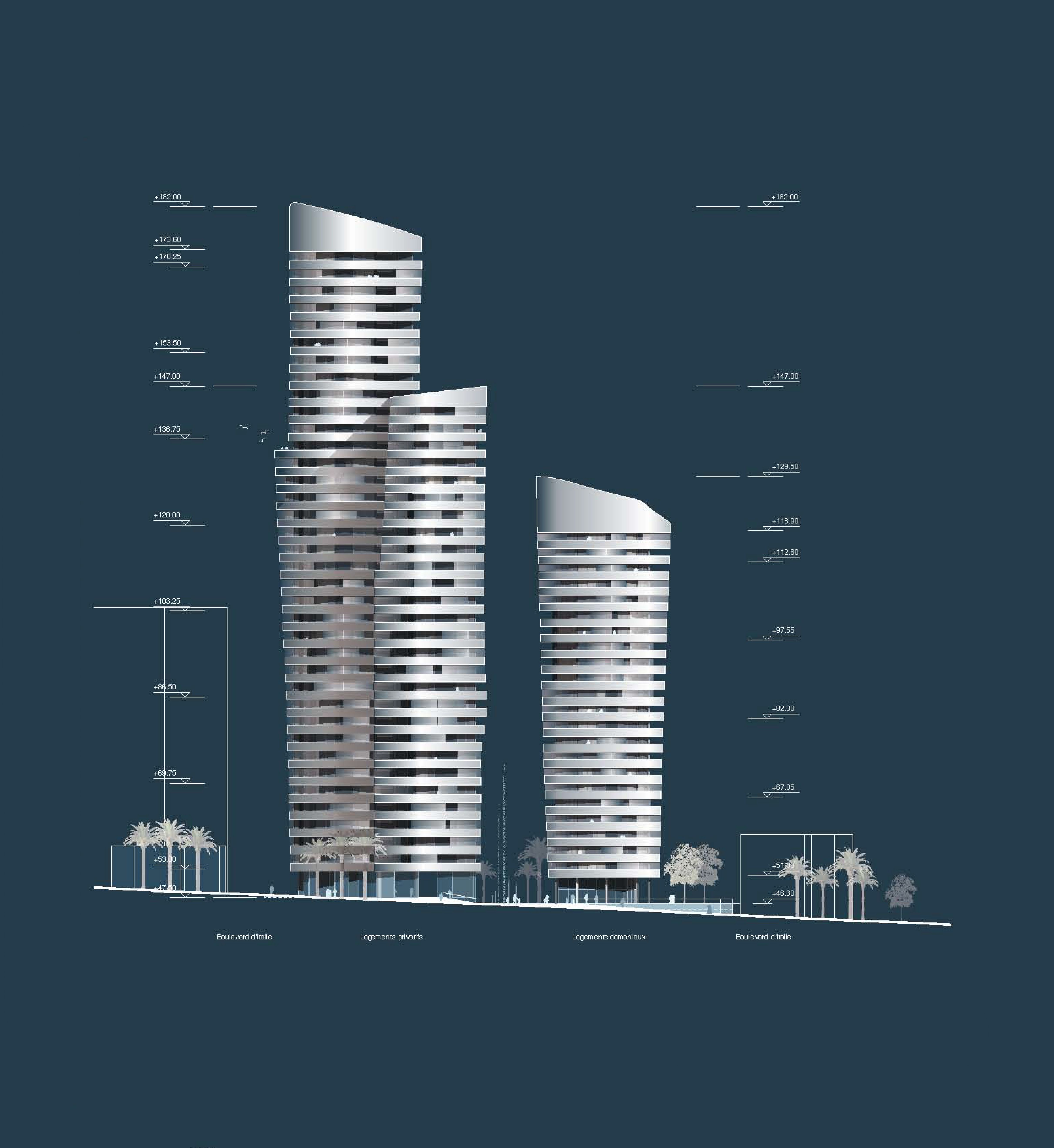 The justification for a multi-purpose programme is to respond to priority needs that are not necessarily complementary, and to this must be added the need to transcribe a project that identifies the legibility and coherence of the work. The operation includes: - a fire station with 36 lodgings and four rooms for trainees, an intervention centre with a guardhouse, firefighters' preparation rooms and a garage (five cells), as well as associated functions (in particular technical workshops, fuel storage tanks, and a manoeuvring yard), an administrative and training centre (theoretical training), a collective catering and relaxation centre, a centre for the technical functions of the fire station with specific dimensional constraints; - a nursery with 50 cots divided into four units of 10-15 children, with general services, a preparation kitchen, and adapted outdoor areas; - tertiary activity areas including a business centre of approximately 1,000 m² and 9,000 m² of high quality offices; - approximately 20,000 m² of residential premises, including 120 state-owned flats, mostly F2s and F3s (14 of which will eventually be used by the fire station) and the rest in a hotel residence including top-of-the-range flats, from studios to six rooms, as well as room service/housekeeping; - the International School of Monaco, a private educational establishment (720 students), offering a curriculum from nursery to final year; - a luxury cinema complex; - a public space with a surface area of no less than 1,500 m².