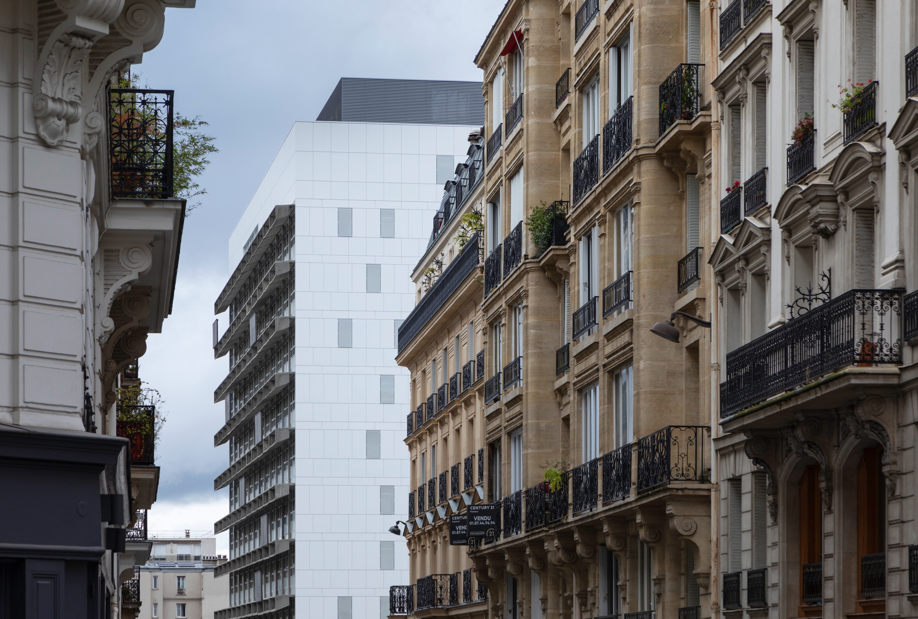 Le site Necker de la faculté de Médecine de l’Université Paris Descartes, réalisation de l’architecte André Wogenscky en 1969, est composé d’un immeuble de grande hauteur (IGH) en R+9 reposant sur un socle de deux niveaux. La réhabilitation du bâtiment Necker s’appuie sur une analyse de l’existant, une inscription dans le bâtiment d’origine et une évolution de ses fonctions. Le projet respecte l’œuvre de l’architecte André Wogenscky et les sculptures de Marta Pan. La préservation de la valeur patrimoniale de cet ouvrage fait l’objet d’une attention particulière et le site accueillera, sur une surface de 22 000m², des activités d’enseignement, d’administration, de vie étudiante et de recherche. La répartition des fonctions a été maintenue : l’enseignement dans le socle, la recherche dans la tour. Le parvis est un espace public. Le nouveau pavillon d’entrée donne accès aux amphithéâtres, la bibliothèque et le restaurant universitaire. Les surfaces exploitables ont été optimisées, en appliquant le principe établi de Wogenscky de « capacité d’évolution » de ses bâtiments. Les façades pignons Nord et Sud, auparavant aveugles, sont réinterprétées d’une manière contemporaine. La lumière naturelle entre par les percements qui y ont été créés, donnant orientation à l’intérieur et des vues vers l’extérieur. Les laboratoires et bureaux se répartissent, selon un système modulaire le long des façades est et ouest. Le module est défini par la trame constructive existante de 3.74 m de largeur et 7,3 m de profondeur. Le système modulaire et le type de construction en cloisons légères permettent d’avoir une flexibilité de l’espace. Les laboratoires sont équipés de paillasses fixes sèches le long des façades, ainsi que de paillasses en îlot. Le site a fait, par ailleurs, l’objet d’une opération de curage-désamiantage en 2014/2015. Cette opération permet, en même temps, la mise aux normes de sécurité incendie et d’accessibilité du bâtiment, et la mise à niveau des installations techniques en recherchent une efficacité énergétique.