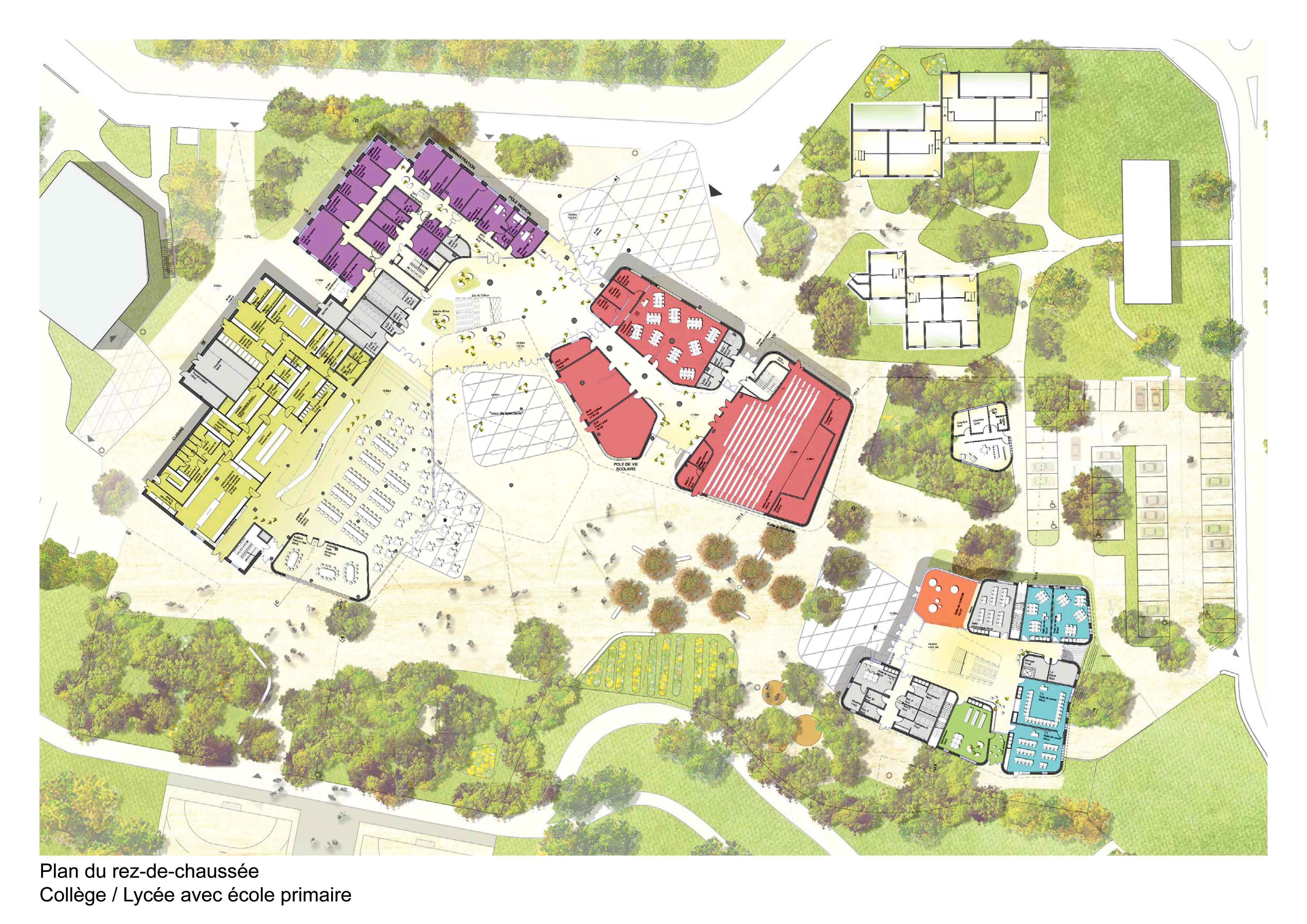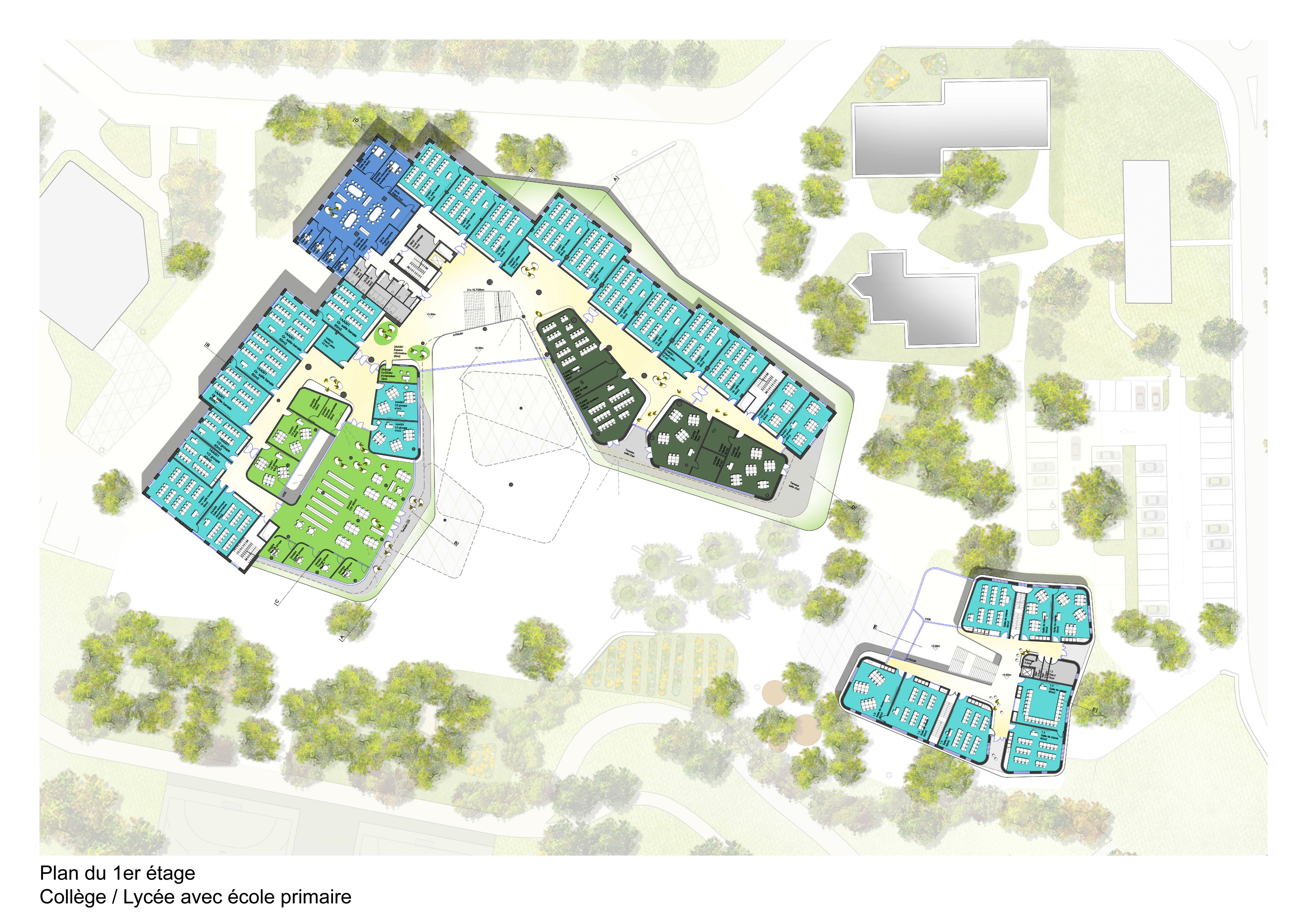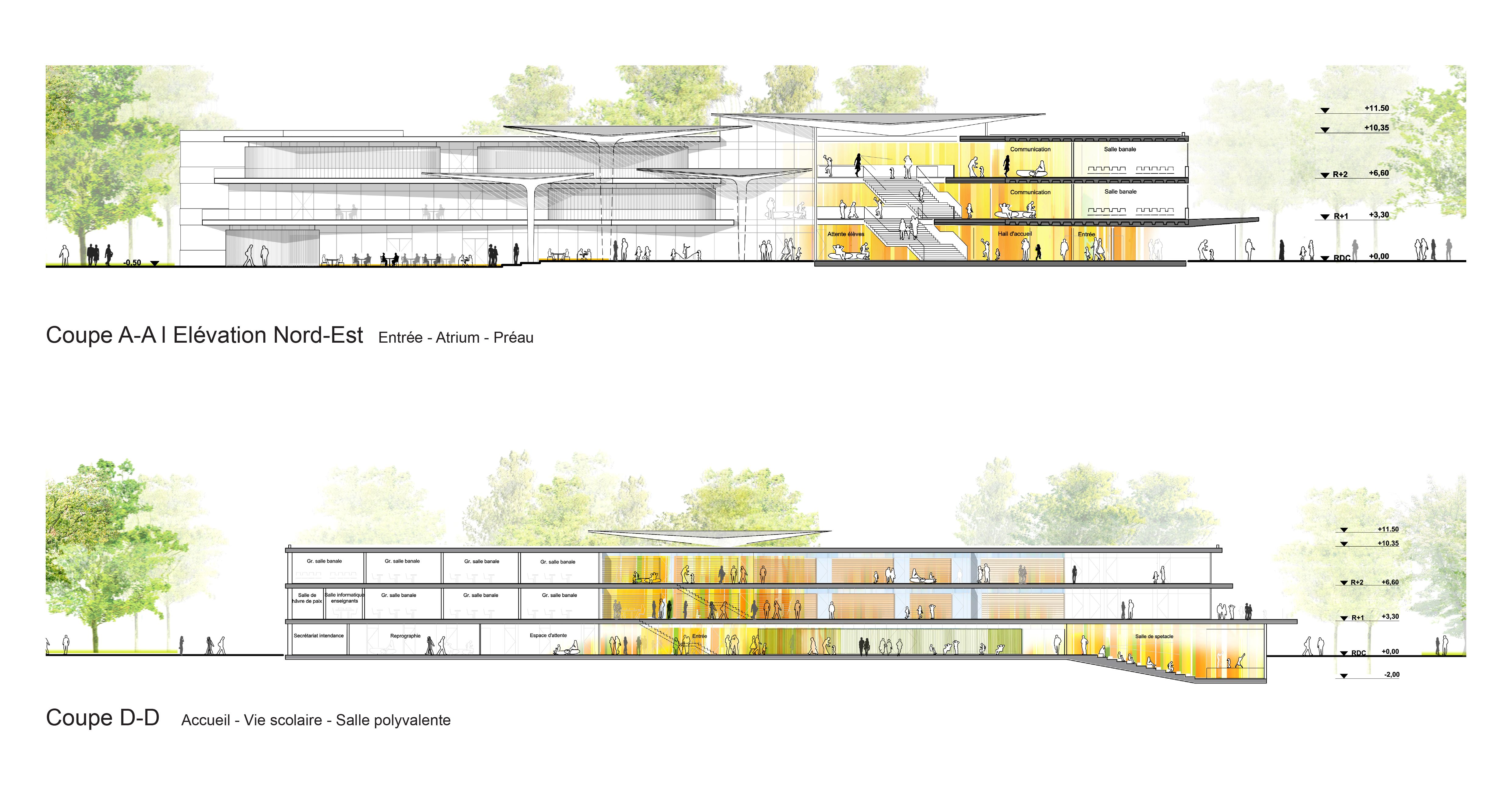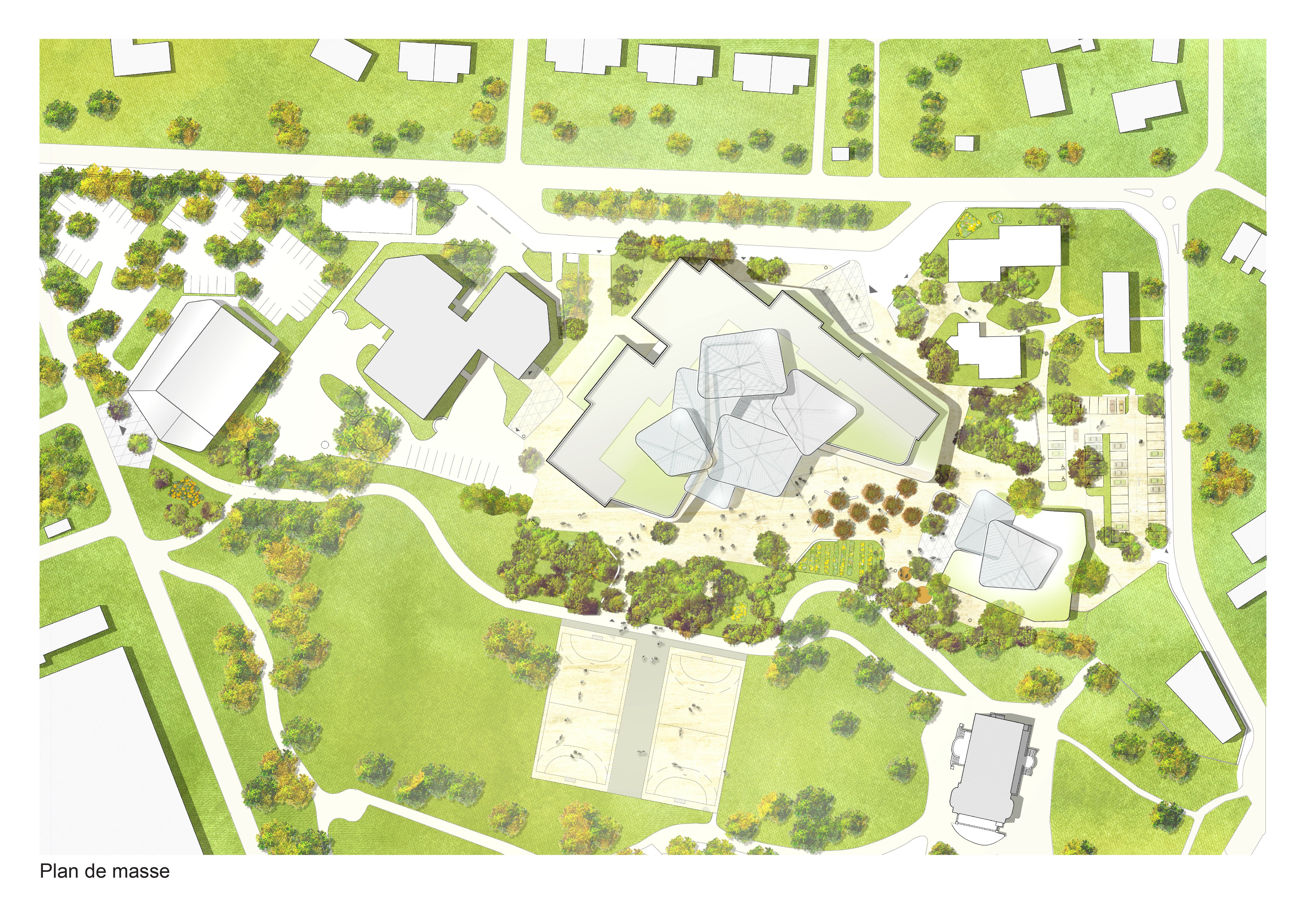Le lycée Franco-Allemand est l’aboutissement d’une politique forte entre la France et l’Allemagne. De renommée internationale, l’établissement incarne l’excellence tant littéraire que scientifique et la bi-culturalité. Les locaux qui abritent le lycée et l’école primaire ne sont plus à la hauteur de l’ambition de l’équipe pédagogique ni des effectifs des élèves en augmentation constante. Au fil du temps, des bâtiments modulaires ont été rajoutés sur le site, du provisoire est devenu définitif. Le projet est ambitieux, il vise à requalifier le bâtiment existant, concevoir l’école élémentaire en harmonie avec le site, faire du parc l’écrin du lycée Franco-Allemand, lui donner une identité formelle et spatiale qui le distinguera du collège contigu Martin Luther King. Des bâtiments, ne sont conservées que les structures. Côté accès depuis la rue, une façade urbaine est proposée, l’entrée généreuse et abritée fait pénétrer le parvis à l’intérieur du hall, elle offre une large transparence vers les cours, le préau et le parc. L’entrée de l’établissement devient accueillante, évidente. La valorisation du site naturel contribue à sensibiliser les élèves à la nature et au paysage. Le vocabulaire architectural moins rigide qu’en façade d’accès, fait référence au végétal, il trouve son aboutissement dans les structures mi-feuilles mi-parasols qui couvrent les espaces extérieurs des cours pour créer les préaux et protéger les classes de la surchauffe d’été. L’édifice proposé va alors chercher les grandes lignes du paysage pour créer des relations fines avec son environnement, tisser des tensions contribuant ainsi à renforcer sa présence et d’établir des correspondances avec le contexte existant. L’escalier principal habite l’espace de l’atrium. La fluidité dedans-dehors fait pénétrer la lumière naturelle jusqu’au cœur des étages où des jours secondaires complémentaires sont créés pour les salles de classes. L’échelle du grand paysage est ainsi matérialisée dans le hall d’entrée par de grandes parois vitrées qui cadre l’environnement. Le morcellement des différents pôles de classes côté parc amorce l’échelle à venir de l’école élémentaire située un peu plus loin. Les circulations horizontales ne sont pas des couloirs linéaires, mais des espaces dont les dilatations sont propices à la rencontre, au vivre ensemble. Généreuses pour faciliter les croisements des différentes disciplines, les circulations ouvrent sur l’extérieur par des points de vue choisis. L’école élémentaire est à l’image du lycée, maillon fort du dispositif d’enseignement, mais séparée du lycée pour d’évidentes raisons fonctionnelles. Elle se compose entre les arbres existants conservés avec respect et douceur et est organisée autour d’un espace central distributif formant atrium. L’escalier principal met en relation les deux niveaux. Le hall trouve son prolongement dans la salle de motricité qui peut être isolée. Les circulations sont baignées de lumière naturelle, elles donnent à voir le paysage, sur tous les côtés. Par respect pour l’environnement, la quasi-totalité des espaces verts est conservée. L’élémentaire se love entre les massifs boisés, la création d’un rez-de-chaussée de l’élémentaire permet de disposer les véhicules nécessaires en toute discrétion au regard des espaces plantés, le projet ne créant pas de stationnement aérien supplémentaire. Le projet du lycée et de l’école élémentaire est clairement tourné vers le parc, il est en symbiose avec lui. Par ce choix fort, le projet se hisse au niveau des ambitions pédagogiques et culturelles de l’institution. Ce travail sur l’épaisseur et l’entre-deux permet l’intégration du paysage dans les bâtiments, l’abandon de l’urbanisme de géométrie et une acuité plus "sensible" portée au contexte. Par ses ondulations et sa volumétrie, notre projet s’ancre avec force sur un territoire avec lequel il établit de subtils liens. Misant sur la matérialité et sur une toiture expressive pour capturer l’environnement, le projet offre une lecture nouvelle du lycée Franco-Allemand. A la notion d’intégration, le projet préfère celle de « résonance » plus propice à définir la stratégie déployée pour restructurer ce lycée.