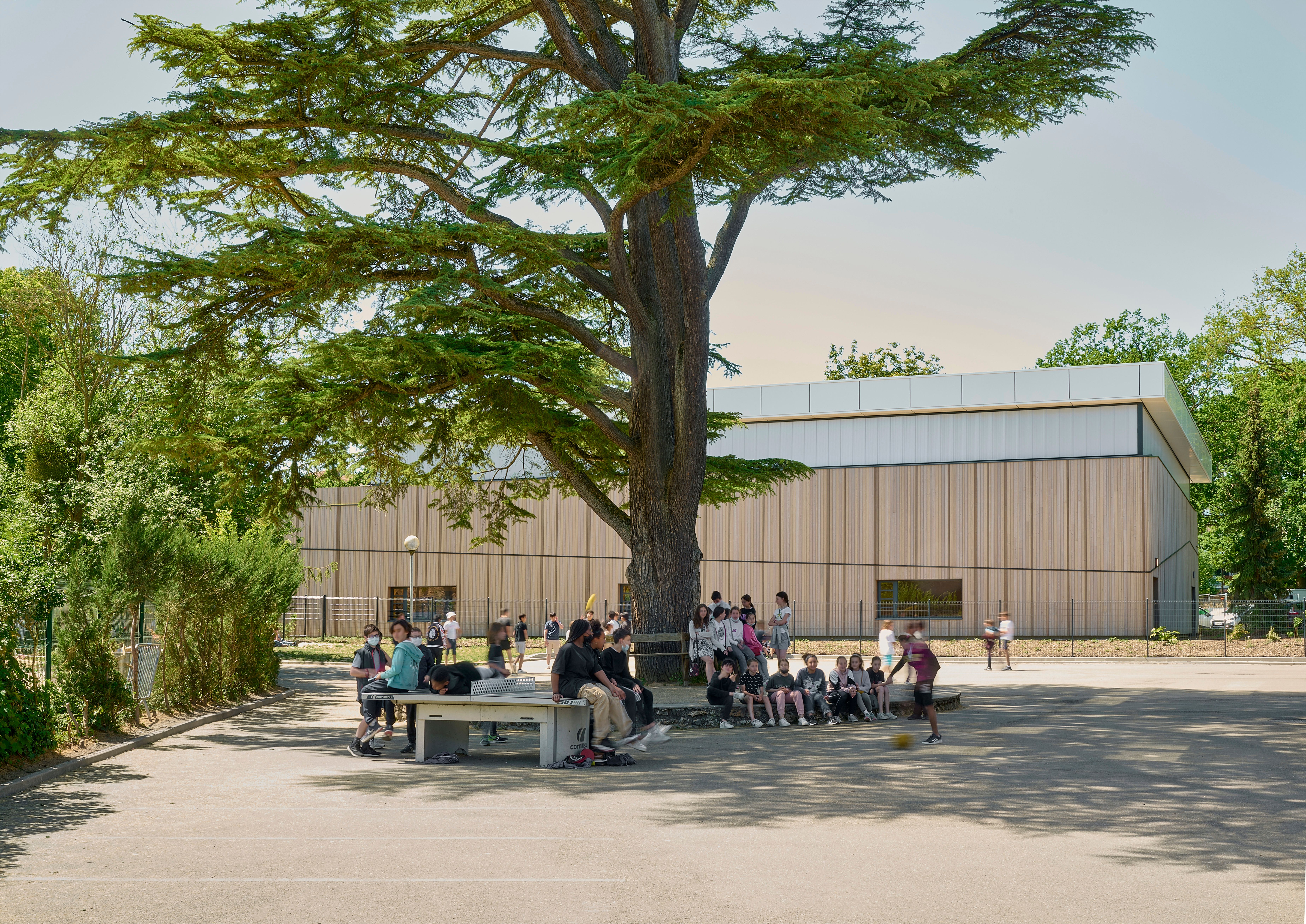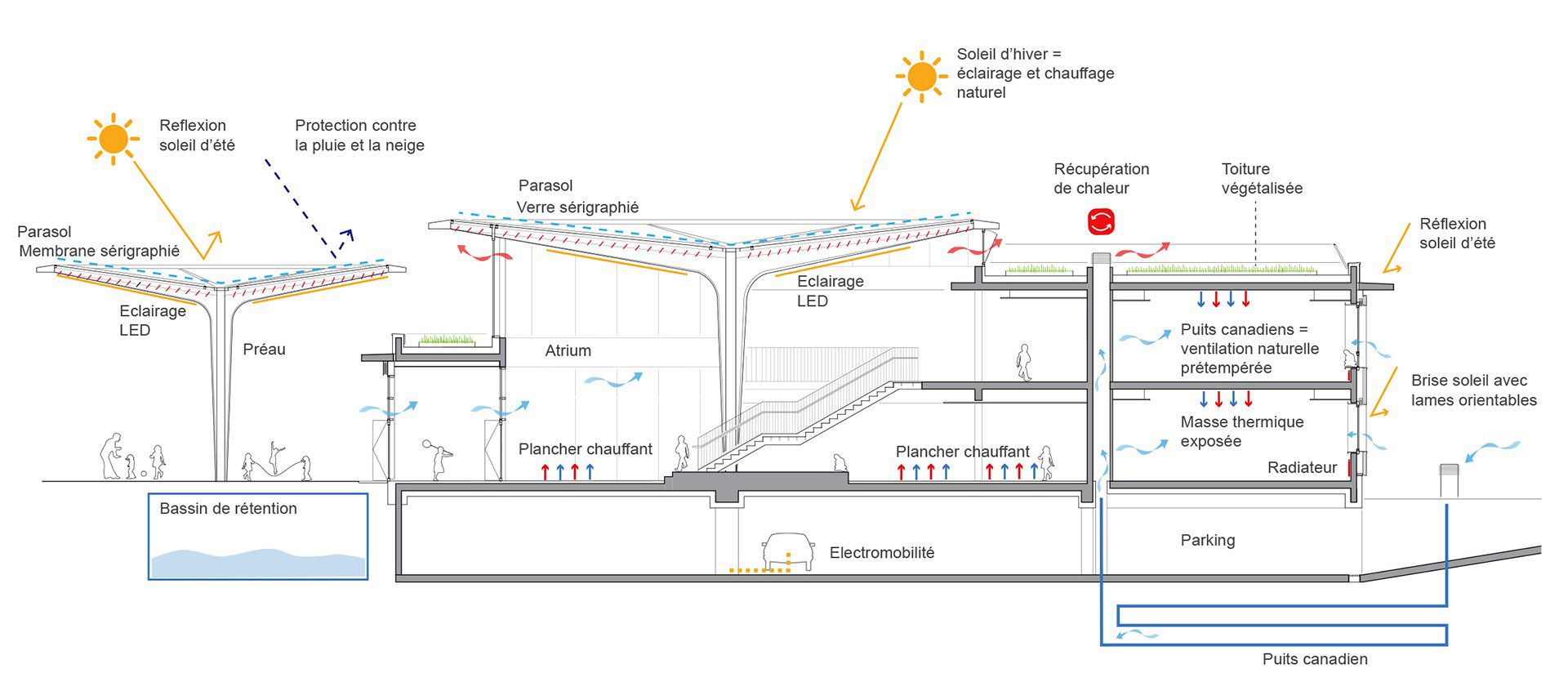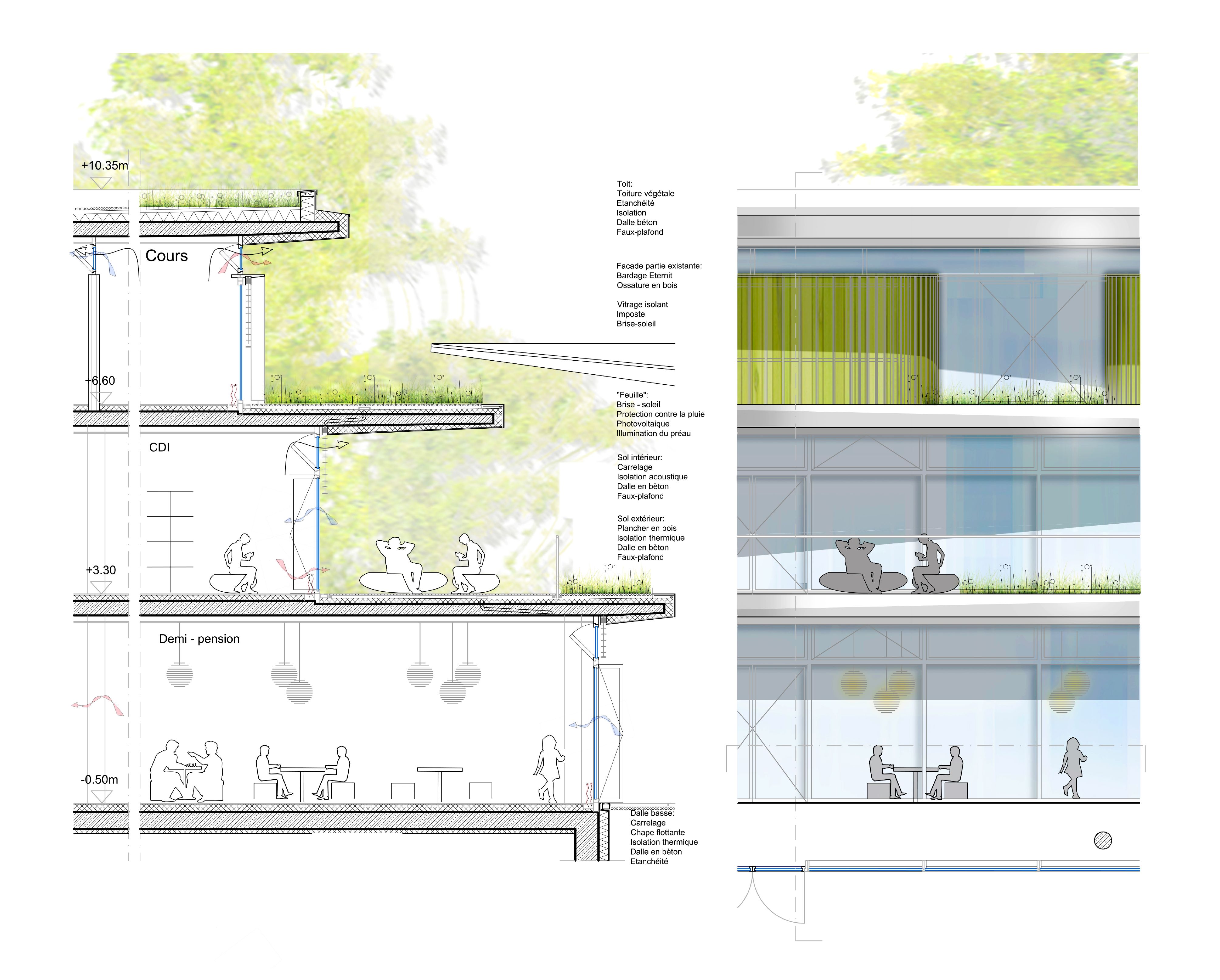 Le lycée Franco-Allemand est l’aboutissement d’une politique forte entre la France et l’Allemagne. De renommée internationale, l’établissement incarne l’excellence tant littéraire que scientifique et la bi-culturalité. Les locaux qui abritent le lycée et l’école primaire ne sont plus à la hauteur de l’ambition de l’équipe pédagogique ni des effectifs des élèves en augmentation constante. Au fil du temps, des bâtiments modulaires ont été rajoutés sur le site, du provisoire est devenu définitif. Le projet est ambitieux, il vise à requalifier le bâtiment existant, concevoir l’école élémentaire en harmonie avec le site, faire du parc l’écrin du lycée Franco-Allemand, lui donner une identité formelle et spatiale qui le distinguera du collège contigu Martin Luther King. Des bâtiments, ne sont conservées que les structures. Côté accès depuis la rue, une façade urbaine est proposée, l’entrée généreuse et abritée fait pénétrer le parvis à l’intérieur du hall, elle offre une large transparence vers les cours, le préau et le parc. L’entrée de l’établissement devient accueillante, évidente. La valorisation du site naturel contribue à sensibiliser les élèves à la nature et au paysage. Le vocabulaire architectural moins rigide qu’en façade d’accès, fait référence au végétal, il trouve son aboutissement dans les structures mi-feuilles mi-parasols qui couvrent les espaces extérieurs des cours pour créer les préaux et protéger les classes de la surchauffe d’été. L’édifice proposé va alors chercher les grandes lignes du paysage pour créer des relations fines avec son environnement, tisser des tensions contribuant ainsi à renforcer sa présence et d’établir des correspondances avec le contexte existant. L’escalier principal habite l’espace de l’atrium. La fluidité dedans-dehors fait pénétrer la lumière naturelle jusqu’au cœur des étages où des jours secondaires complémentaires sont créés pour les salles de classes. L’échelle du grand paysage est ainsi matérialisée dans le hall d’entrée par de grandes parois vitrées qui cadre l’environnement. Le morcellement des différents pôles de classes côté parc amorce l’échelle à venir de l’école élémentaire située un peu plus loin. Les circulations horizontales ne sont pas des couloirs linéaires, mais des espaces dont les dilatations sont propices à la rencontre, au vivre ensemble. Généreuses pour faciliter les croisements des différentes disciplines, les circulations ouvrent sur l’extérieur par des points de vue choisis. L’école élémentaire est à l’image du lycée, maillon fort du dispositif d’enseignement, mais séparée du lycée pour d’évidentes raisons fonctionnelles. Elle se compose entre les arbres existants conservés avec respect et douceur et est organisée autour d’un espace central distributif formant atrium. L’escalier principal met en relation les deux niveaux. Le hall trouve son prolongement dans la salle de motricité qui peut être isolée. Les circulations sont baignées de lumière naturelle, elles donnent à voir le paysage, sur tous les côtés. Par respect pour l’environnement, la quasi-totalité des espaces verts est conservée. L’élémentaire se love entre les massifs boisés, la création d’un rez-de-chaussée de l’élémentaire permet de disposer les véhicules nécessaires en toute discrétion au regard des espaces plantés, le projet ne créant pas de stationnement aérien supplémentaire. Le projet du lycée et de l’école élémentaire est clairement tourné vers le parc, il est en symbiose avec lui. Par ce choix fort, le projet se hisse au niveau des ambitions pédagogiques et culturelles de l’institution. Ce travail sur l’épaisseur et l’entre-deux permet l’intégration du paysage dans les bâtiments, l’abandon de l’urbanisme de géométrie et une acuité plus "sensible" portée au contexte. Par ses ondulations et sa volumétrie, notre projet s’ancre avec force sur un territoire avec lequel il établit de subtils liens. Misant sur la matérialité et sur une toiture expressive pour capturer l’environnement, le projet offre une lecture nouvelle du lycée Franco-Allemand. A la notion d’intégration, le projet préfère celle de « résonance » plus propice à définir la stratégie déployée pour restructurer ce lycée.