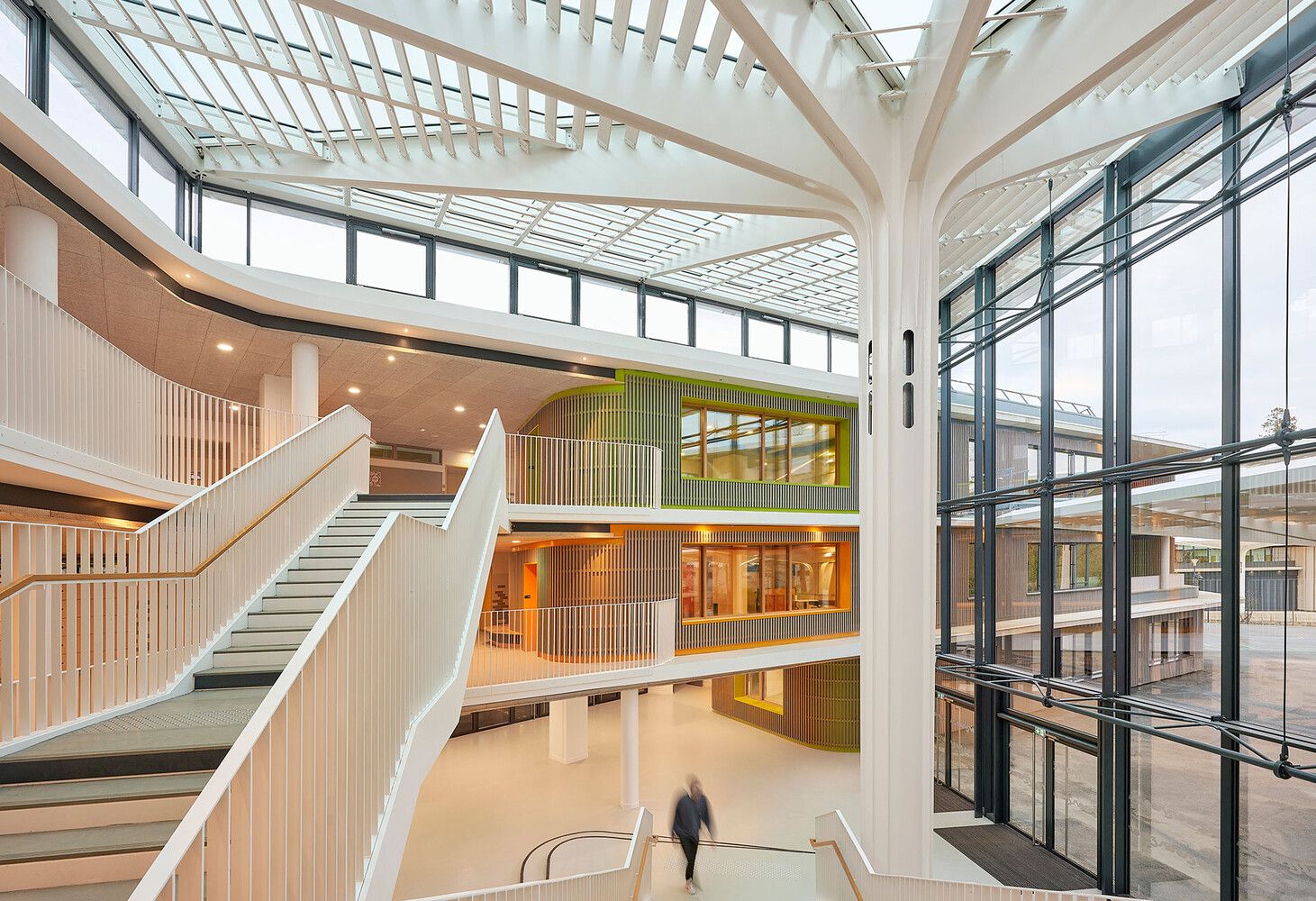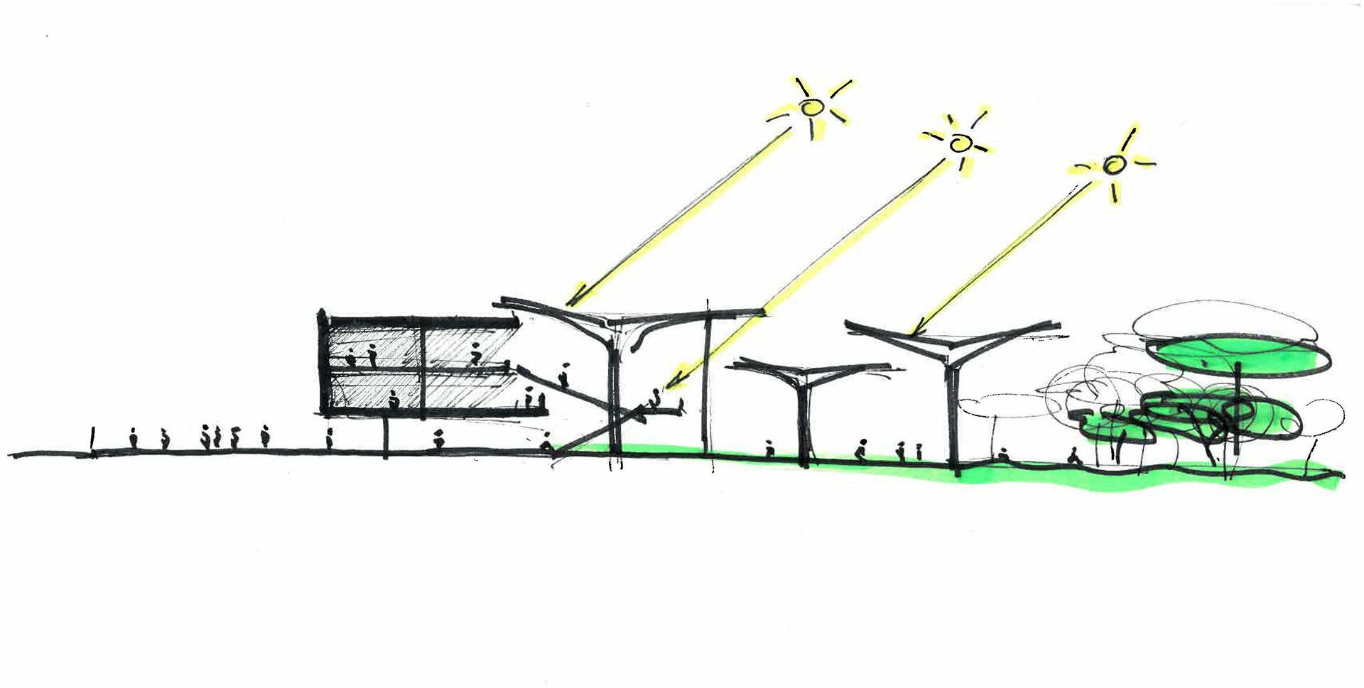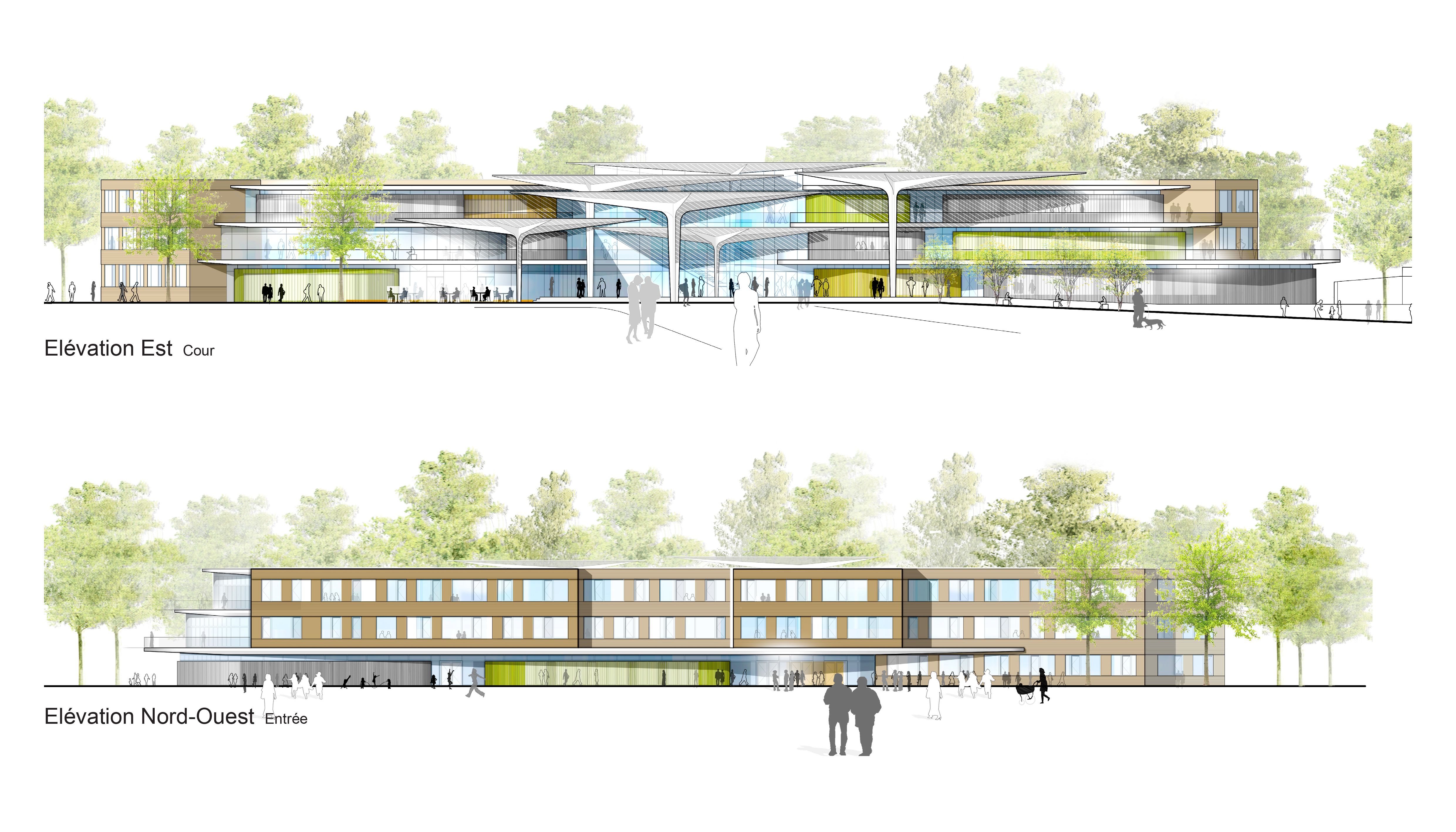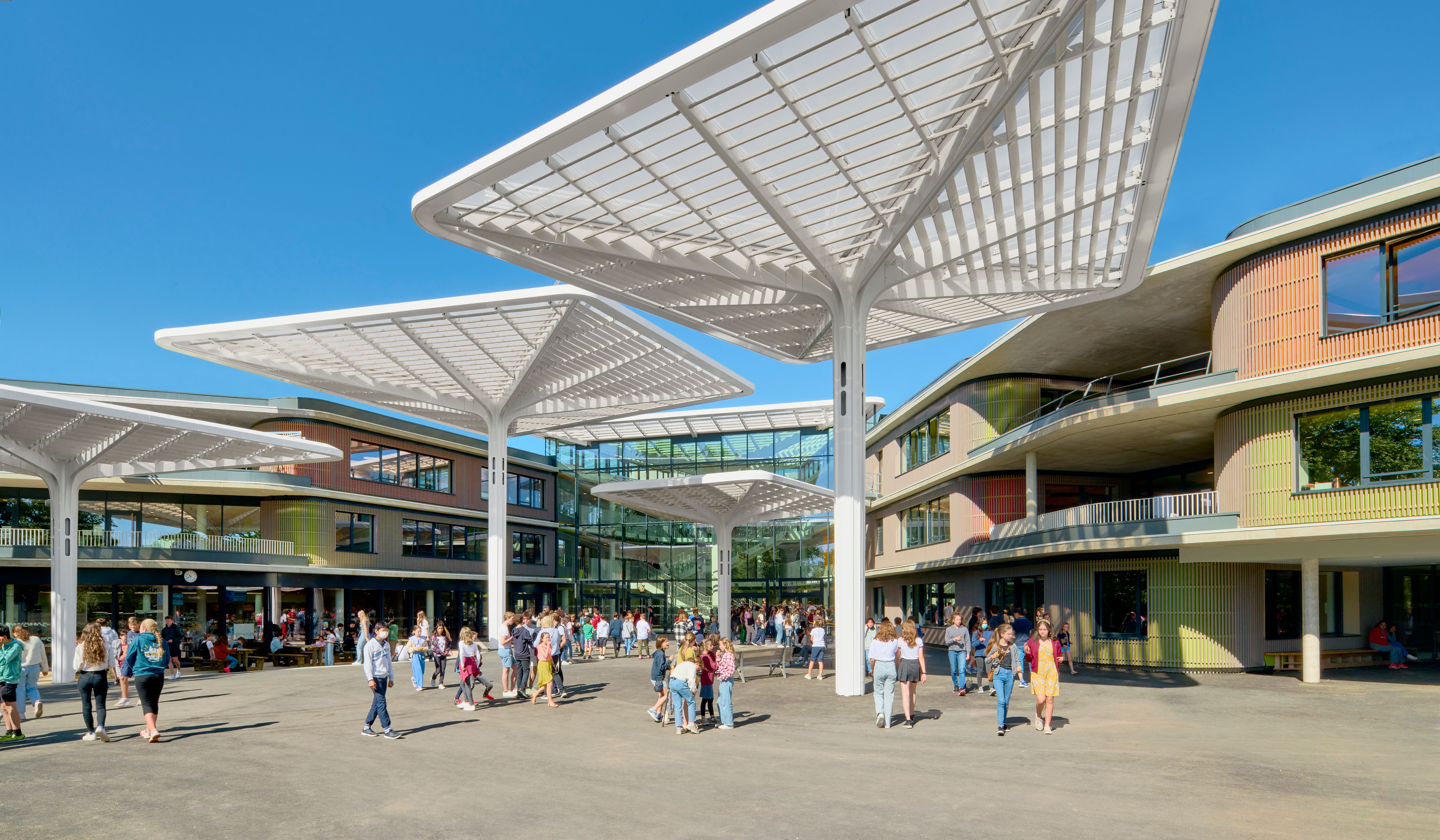 Le lycée Franco-Allemand est l’aboutissement d’une politique forte entre la France et l’Allemagne. De renommée internationale, l’établissement incarne l’excellence tant littéraire que scientifique et la bi-culturalité. Les locaux qui abritent le lycée et l’école primaire ne sont plus à la hauteur de l’ambition de l’équipe pédagogique ni des effectifs des élèves en augmentation constante. Au fil du temps, des bâtiments modulaires ont été rajoutés sur le site, du provisoire est devenu définitif. Le projet est ambitieux, il vise à requalifier le bâtiment existant, concevoir l’école élémentaire en harmonie avec le site, faire du parc l’écrin du lycée Franco-Allemand, lui donner une identité formelle et spatiale qui le distinguera du collège contigu Martin Luther King. Des bâtiments, ne sont conservées que les structures. Côté accès depuis la rue, une façade urbaine est proposée, l’entrée généreuse et abritée fait pénétrer le parvis à l’intérieur du hall, elle offre une large transparence vers les cours, le préau et le parc. L’entrée de l’établissement devient accueillante, évidente. La valorisation du site naturel contribue à sensibiliser les élèves à la nature et au paysage. Le vocabulaire architectural moins rigide qu’en façade d’accès, fait référence au végétal, il trouve son aboutissement dans les structures mi-feuilles mi-parasols qui couvrent les espaces extérieurs des cours pour créer les préaux et protéger les classes de la surchauffe d’été. L’édifice proposé va alors chercher les grandes lignes du paysage pour créer des relations fines avec son environnement, tisser des tensions contribuant ainsi à renforcer sa présence et d’établir des correspondances avec le contexte existant. L’escalier principal habite l’espace de l’atrium. La fluidité dedans-dehors fait pénétrer la lumière naturelle jusqu’au cœur des étages où des jours secondaires complémentaires sont créés pour les salles de classes. L’échelle du grand paysage est ainsi matérialisée dans le hall d’entrée par de grandes parois vitrées qui cadre l’environnement. Le morcellement des différents pôles de classes côté parc amorce l’échelle à venir de l’école élémentaire située un peu plus loin. Les circulations horizontales ne sont pas des couloirs linéaires, mais des espaces dont les dilatations sont propices à la rencontre, au vivre ensemble. Généreuses pour faciliter les croisements des différentes disciplines, les circulations ouvrent sur l’extérieur par des points de vue choisis. L’école élémentaire est à l’image du lycée, maillon fort du dispositif d’enseignement, mais séparée du lycée pour d’évidentes raisons fonctionnelles. Elle se compose entre les arbres existants conservés avec respect et douceur et est organisée autour d’un espace central distributif formant atrium. L’escalier principal met en relation les deux niveaux. Le hall trouve son prolongement dans la salle de motricité qui peut être isolée. Les circulations sont baignées de lumière naturelle, elles donnent à voir le paysage, sur tous les côtés. Par respect pour l’environnement, la quasi-totalité des espaces verts est conservée. L’élémentaire se love entre les massifs boisés, la création d’un rez-de-chaussée de l’élémentaire permet de disposer les véhicules nécessaires en toute discrétion au regard des espaces plantés, le projet ne créant pas de stationnement aérien supplémentaire. Le projet du lycée et de l’école élémentaire est clairement tourné vers le parc, il est en symbiose avec lui. Par ce choix fort, le projet se hisse au niveau des ambitions pédagogiques et culturelles de l’institution. Ce travail sur l’épaisseur et l’entre-deux permet l’intégration du paysage dans les bâtiments, l’abandon de l’urbanisme de géométrie et une acuité plus "sensible" portée au contexte. Par ses ondulations et sa volumétrie, notre projet s’ancre avec force sur un territoire avec lequel il établit de subtils liens. Misant sur la matérialité et sur une toiture expressive pour capturer l’environnement, le projet offre une lecture nouvelle du lycée Franco-Allemand. A la notion d’intégration, le projet préfère celle de « résonance » plus propice à définir la stratégie déployée pour restructurer ce lycée.