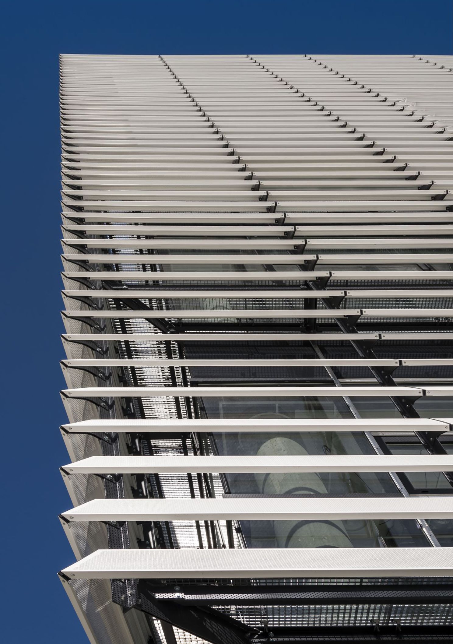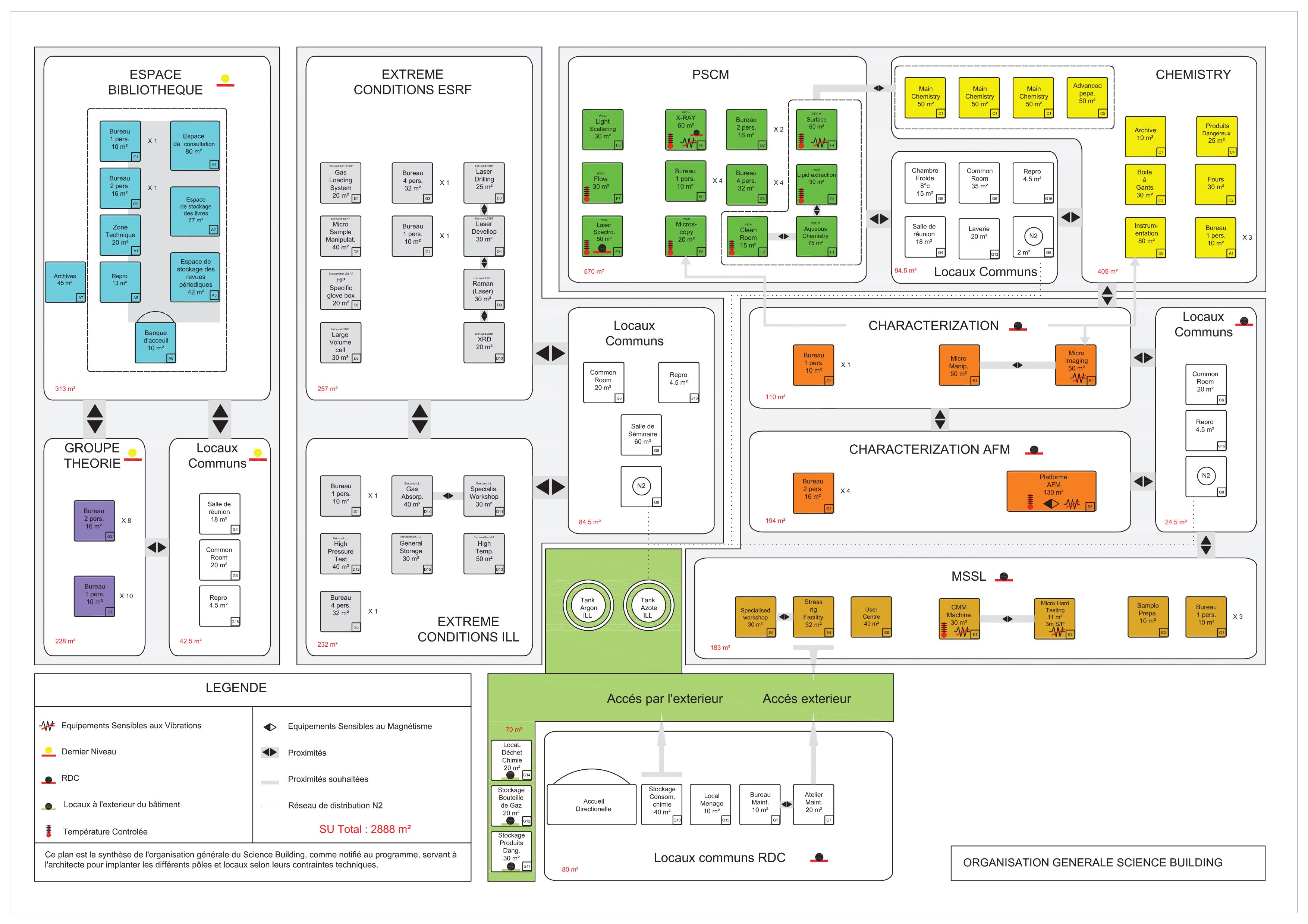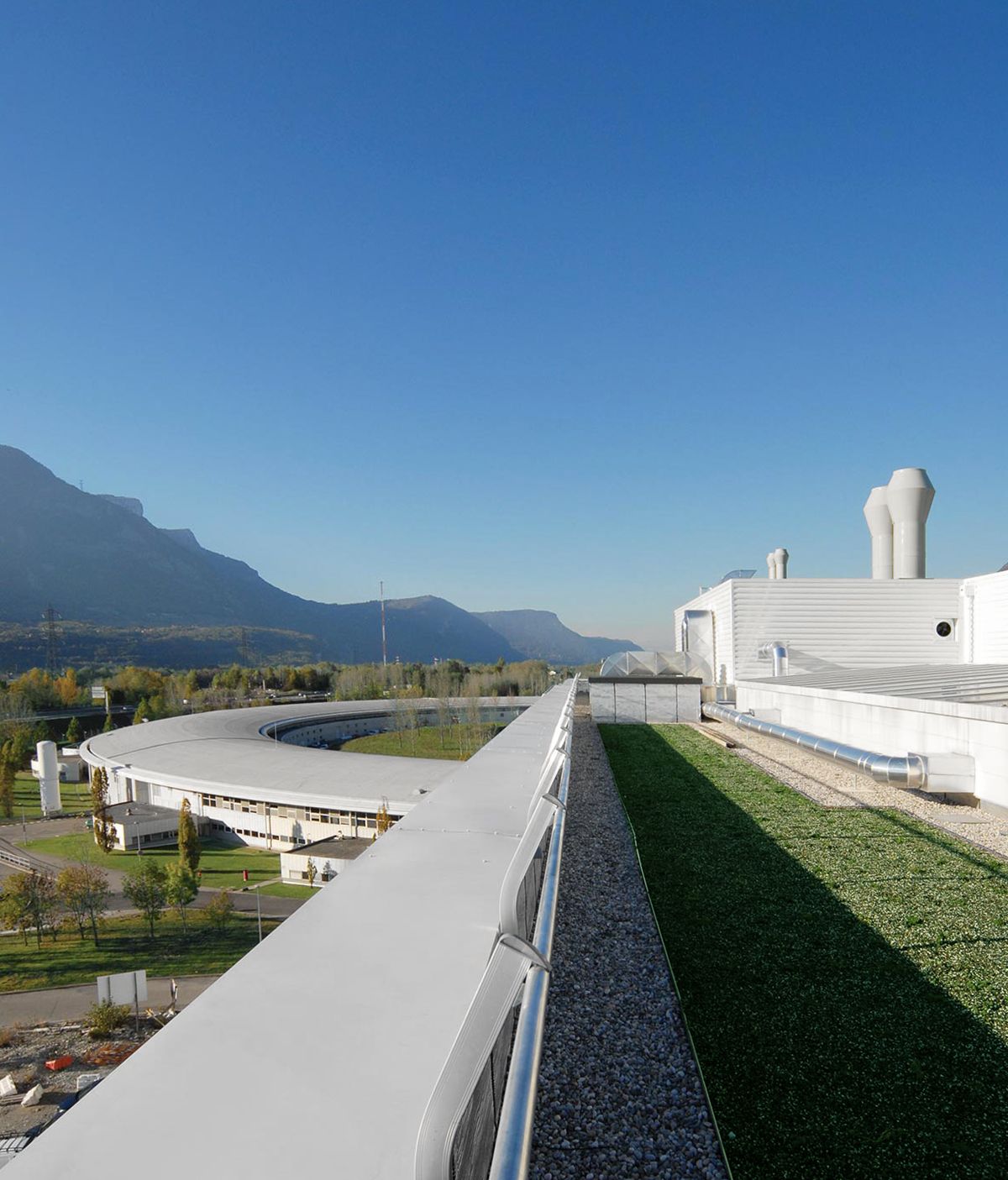 An der Spitze der Halbinsel des Polygone Scientifique präsentiert sich der monolithische Block des „Science Buildings“. Das Gebäude soll die Spitzentechnologie im Bereich der Erforschung von weicher Materie und Materalien unter extremen Bedingungen beispielhaft repräsentieren und wacht gleichsam über das gesamte Areal. Es fasst Bereiche für wissenschaftliche Forschung, Empfangsflächen und Büros in einer komplexen Anordnung zusammen. Die architektonische Herausforderung bestand darin, trotz der zahlreichen funktionalen Vorgaben, die Funktionen, Formen und Dimensionen gleichermaßen beeinflussen, ein homogenes Ensemble zu schaffen. Funktional wie architektonisch stellt das Gebäude eine Verbindung zwischen dem Neutronenreaktor ILL5 und dem Elektronenspeicherring des ESRF her. Formal entwickelt sich der Bau aus einem einfachen Quader, der durch das Spiel zwischen Massen und Fassadendurchbrüchen am Tag wie bei Nacht in Bewegung gehalten wird. Als beispielhaftes, modernes Forschungsinstitut soll das Gebäude die Baukultur unserer Epoche durch seinen innovativen und zukunftsweisenden Charakter repräsentieren. Realisiert wurde dieses Ziel in erster Linie durch die besondere Fassadengestaltung. Sie besteht auf den Etagenebenen aus hellen, perforierten Metallbändern, die regelmäßig an der Fassade angeordnet sind. Diese Elemente fungieren tagsüber vor opaken Flächen als Brüstungen und vor Fensterflächen als Sonnenschutz. Bei Nacht lassen sie das Science Building wie in weißes Licht gebadet erscheinen und verleihen ihm eine ruhige und reine Anmutung.
