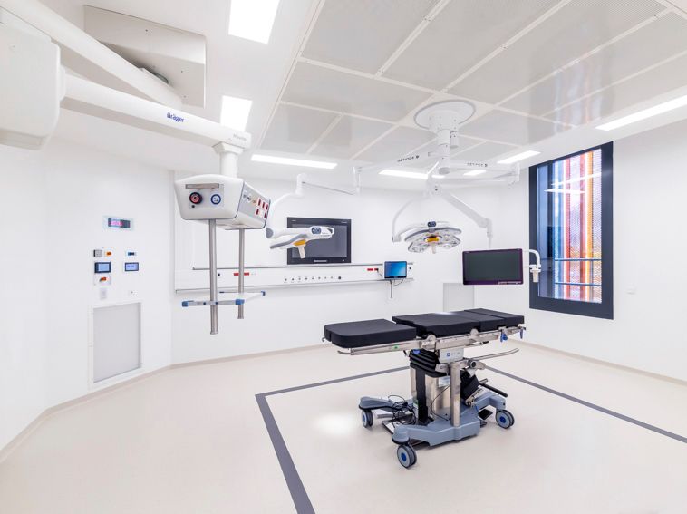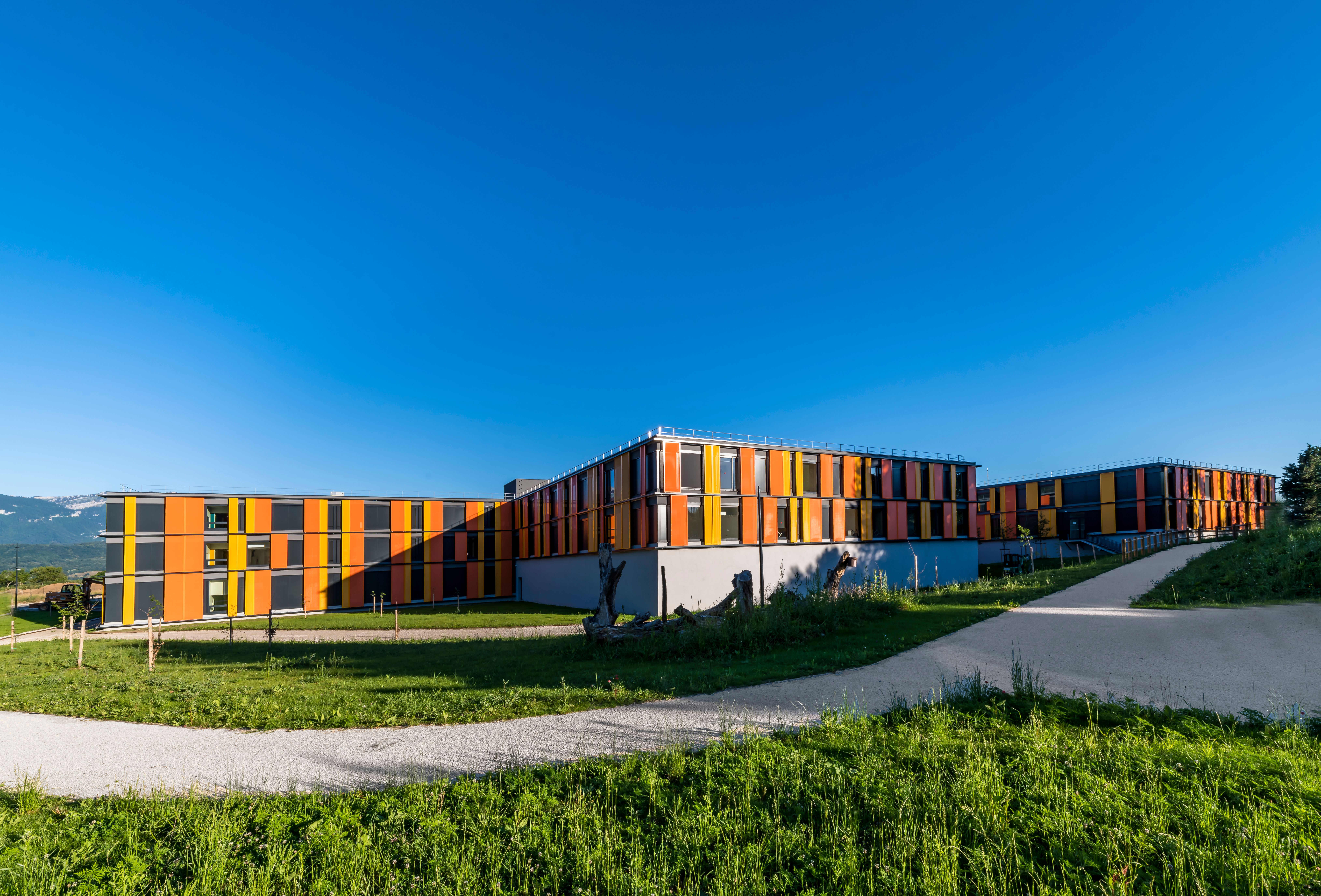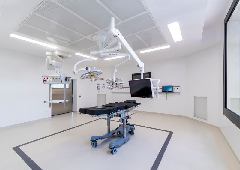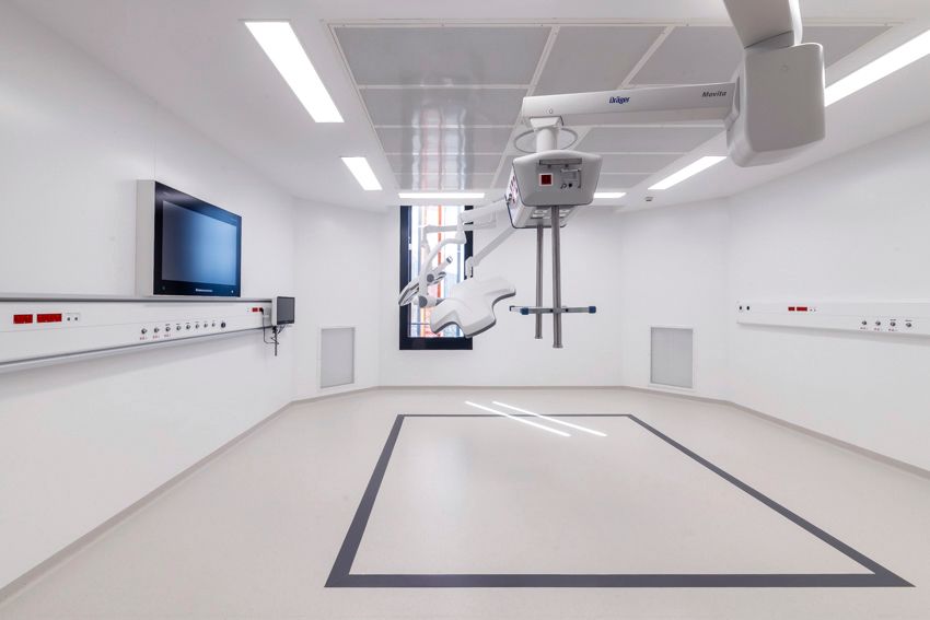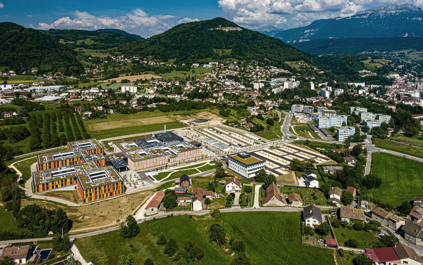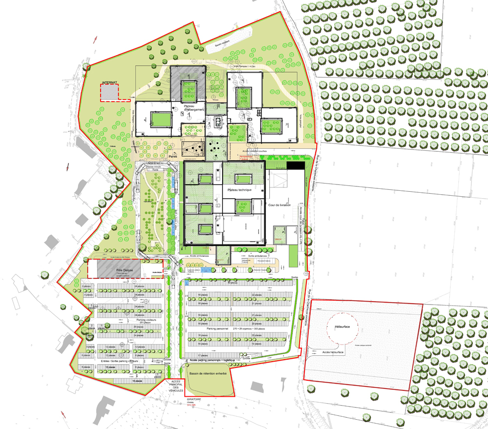Das neue Hospital Voiron dient der Grundversorgung der ostfranzösischen Kleinstadt nahe Grenoble. Die dörfliche Umgebung wird durch ein lockeres Gefüge von Baukörpern aufgenommen, die sich in ihrer Gestaltung zurücknehmen und durch eine additive Struktur künftige Erweiterungen ermöglichen. Durch die Lage des Grundstücks ist es möglich, den Krankenhausneubau wie eine kleine Stadt "auf der grünen Wiese" anzulegen. Der Behandlungstrakt ist über einen transparenten Zwischenbau mit zwei Bettenhäusern verbunden. Das etwas abgerückt stehende Versorgungszentrum wird unterirdisch angebunden. Bindeglied zwischen den einzelnen Baukörpern ist eine zweigeschossige Halle, über die auch der Hauptzugang zum Krankenhaus erfolgt. Eine von hier ausgehende "Magistrale" erschließt die Bettenhäuser, Untersuchungs- und Behandlungsbereiche. Durch eine zentrale Kernzone ist diese Achse zweigeteilt, so dass die Wegeführung von Schwerverletzten, Patienten und Besuchern getrennt verläuft. Die einzelnen Fachbereiche nutzen die "Magistrale" wie eine Straße mit dem nach dem Kooperationsmodell angeschlossenen Arztpraxen.
