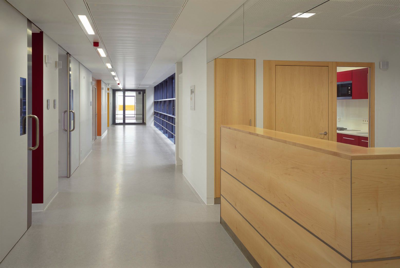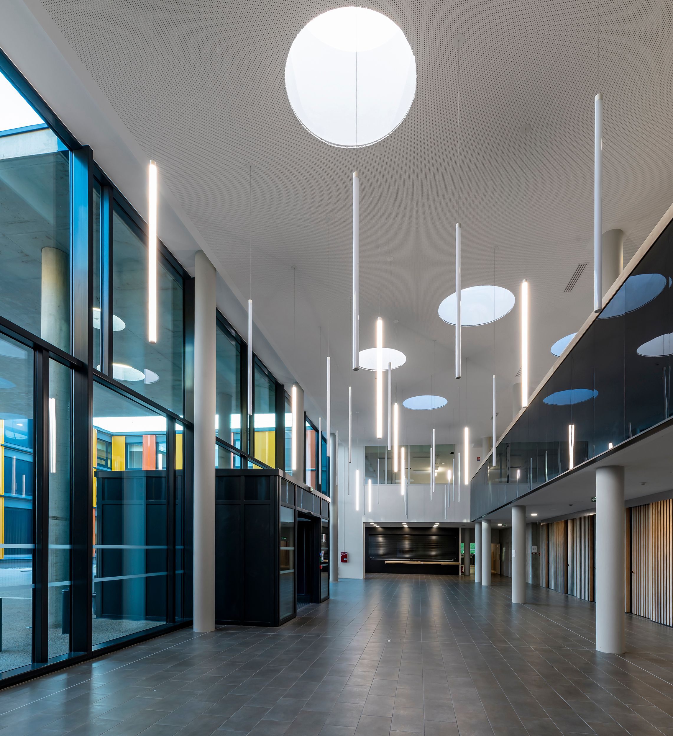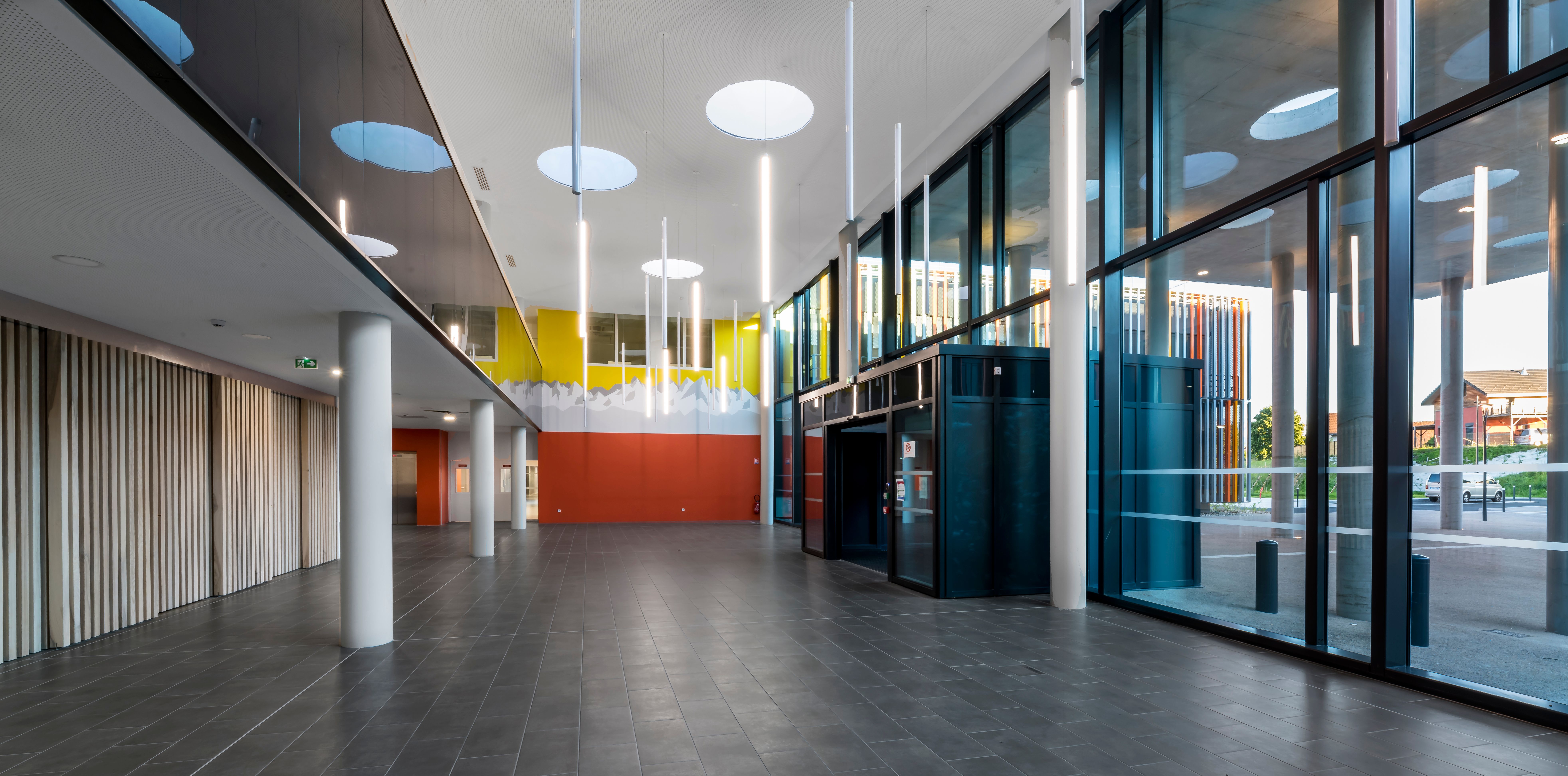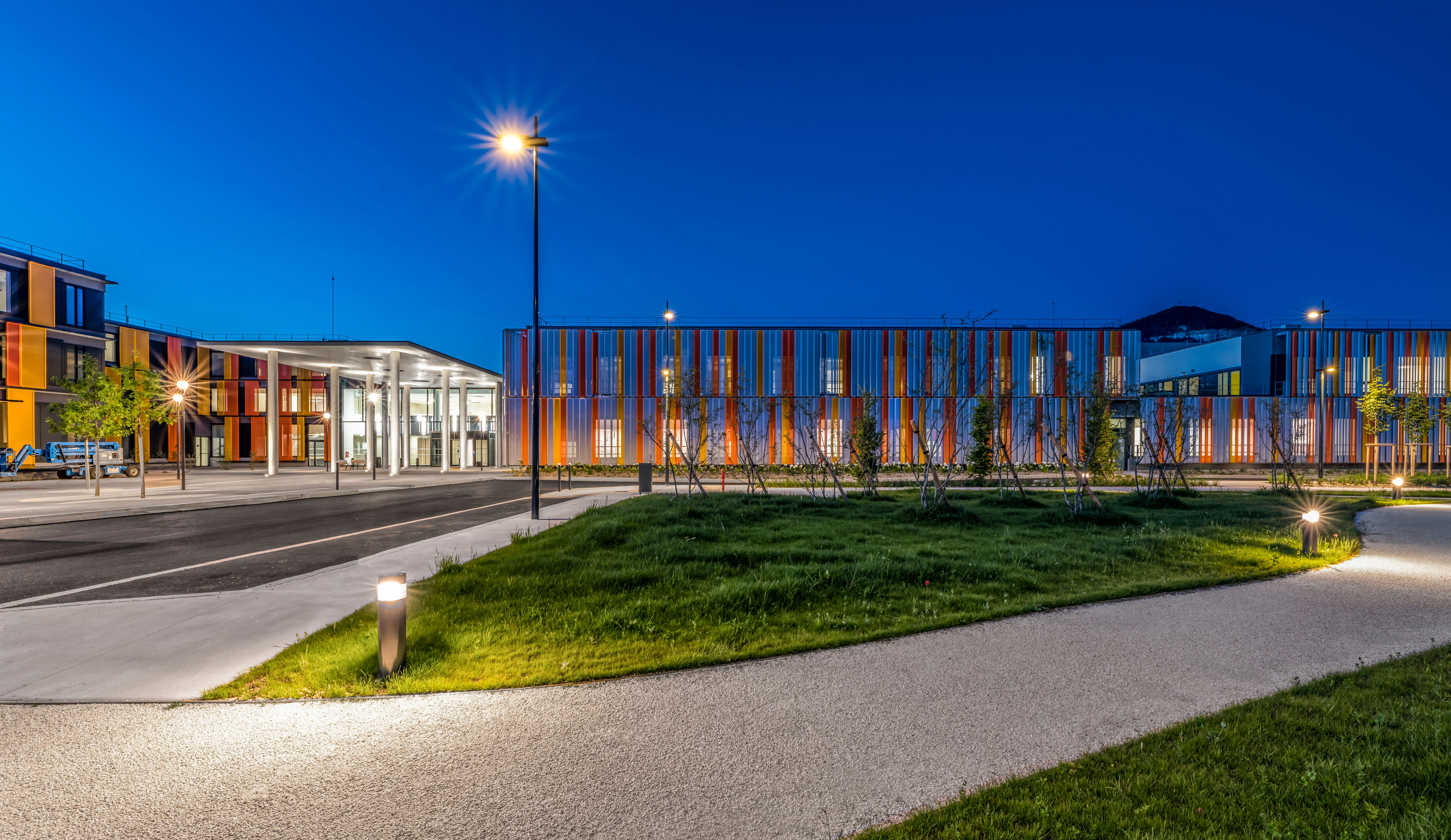 Das neue Hospital Voiron dient der Grundversorgung der ostfranzösischen Kleinstadt nahe Grenoble. Die dörfliche Umgebung wird durch ein lockeres Gefüge von Baukörpern aufgenommen, die sich in ihrer Gestaltung zurücknehmen und durch eine additive Struktur künftige Erweiterungen ermöglichen. Durch die Lage des Grundstücks ist es möglich, den Krankenhausneubau wie eine kleine Stadt "auf der grünen Wiese" anzulegen. Der Behandlungstrakt ist über einen transparenten Zwischenbau mit zwei Bettenhäusern verbunden. Das etwas abgerückt stehende Versorgungszentrum wird unterirdisch angebunden. Bindeglied zwischen den einzelnen Baukörpern ist eine zweigeschossige Halle, über die auch der Hauptzugang zum Krankenhaus erfolgt. Eine von hier ausgehende "Magistrale" erschließt die Bettenhäuser, Untersuchungs- und Behandlungsbereiche. Durch eine zentrale Kernzone ist diese Achse zweigeteilt, so dass die Wegeführung von Schwerverletzten, Patienten und Besuchern getrennt verläuft. Die einzelnen Fachbereiche nutzen die "Magistrale" wie eine Straße mit dem nach dem Kooperationsmodell angeschlossenen Arztpraxen.