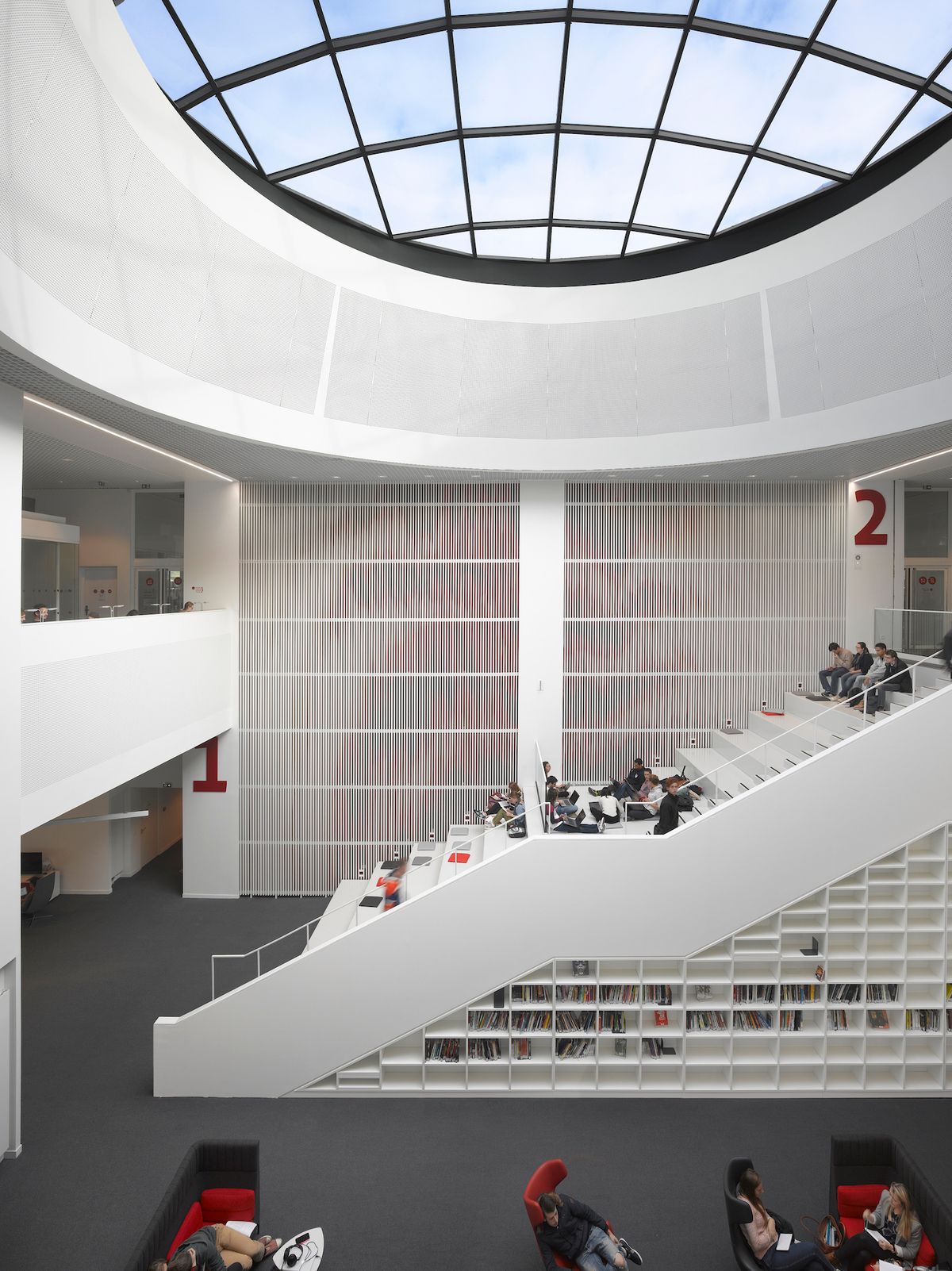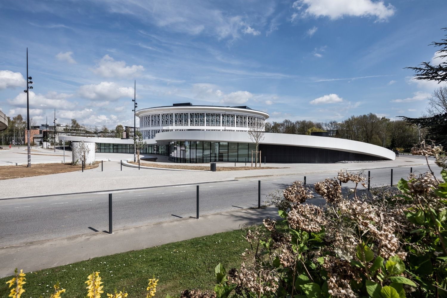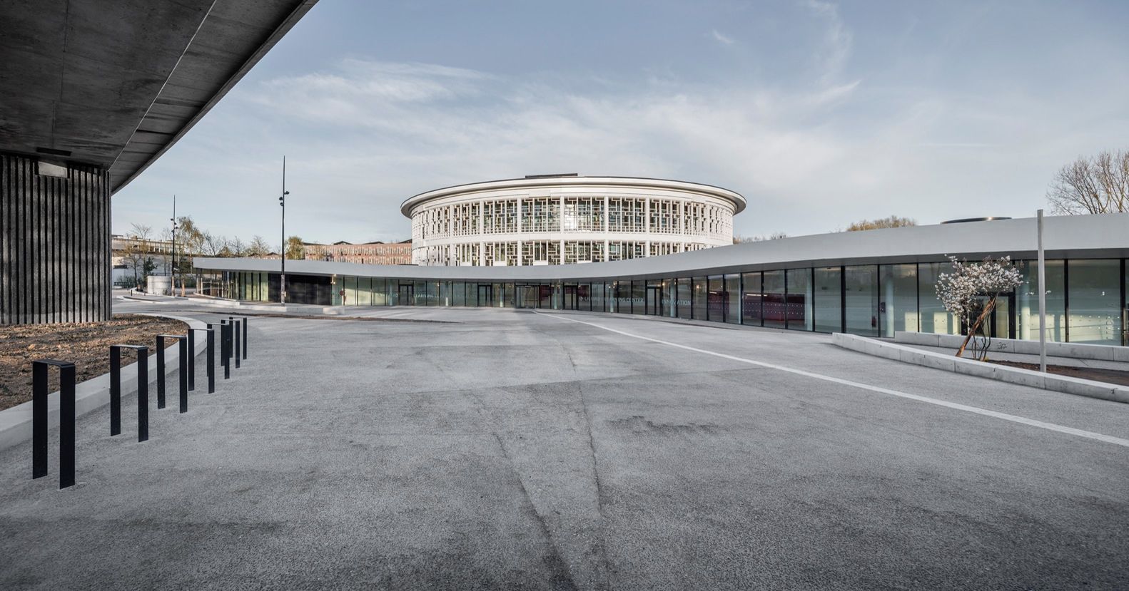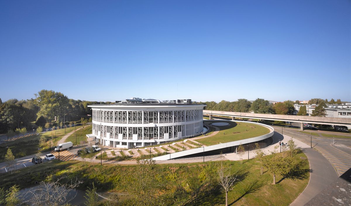 Zukunftsgerichtete Bildung erfordert zeitgemäße Konzepte, insbesondere die Erneuerung der universitären Infrastruktur, zu deren Entwicklung das französische Bildungsministerium maßgeblich beigetragen hat. Die Arbeiten zur Einrichtung und Erweiterung des "Learning Center Innovation" fallen in den Rahmen dieses Programms. Das Gebäude, in dem die derzeitige Bibliothek untergebracht ist, wurde 1965 von dem Architekten Noël Lemaresquier, einem Schüler von Le Corbusier, entworfen und ist strukturell gealtert. Ausschlaggebend war der Umgang mit der perfekten Kreisform des bestehenden Gebäudes und der Fassade, die erhalten bleiben sollte. Wir verzichteten daher auf eine typische Erweiterung des Gebäudes und bevorzugten stattdessen den Ausdruck einer landschaftlichen Lösung: Ein großes Landschaftselement umgibt das Volumen, schafft einen neuen Haupteingang und integriert die neuen Räume in das Konzept. Dieses Landschaftsplateau umgibt die Rotunde und hebt sich durch konzentrische Lichtstrahlen von ihr ab. Ein geschwungenes Dach beherbergt den neuen Empfangsbereich und die Nebenflächen, wobei alle Etagen durch eine Halle mit dem bestehenden Gebäude verbunden sind. Die traditionelle Bibliothek wird so in ein "Lernzentrum" umgewandelt. Die Organisation der Zugänge und die neuen Funktionen unter dem Plateau sind als "alt" und "neu" lesbar: Ein Oberlichtbereich verschiebt die landschaftliche Basis des bestehenden zylindrischen Volumens und nutzt das Lichtband als Schwelle zwischen dem alten und dem neuen Körper. Eine große Halle, die die Eingangsebene mit dem Obergeschoss verbindet, verbindet beide miteinander. Die bestehende Fassade wird weder zerbrochen noch verunstaltet. Die Form des bestehenden Gebäudes - die Geometrie des Kreises - dient als Gestaltungselement zwischen dem alten und dem neuen Körper. Die Kreisform wird wiederholt, skaliert und gegeneinander verschoben. Dadurch werden neue Räume mit unterschiedlichen Funktionen, architektonischen Qualitäten, Tiefen und Beleuchtungsstärken definiert. Die Aufteilung der Innenräume folgt der Komposition zwischen dem bestehenden Gebäude und dem neuen Landschaftsplateau. Während die weitläufigen Lesebereiche und Buchhandlungen im bestehenden Gebäude organisiert sind, werden Funktionen wie der Veranstaltungsbereich und das mit neuen Technologien beladene Xperium öffentlich in der Basis positioniert. Im digitalen Zeitalter lösen sich die Grenzen auf; die klassische Bibliothek ist überholt; digitale Medien und Interaktion gewinnen an Bedeutung und bewirken die Auflösung der räumlichen Grenzen in den Lernzonen. Das Gebäude entwirft eine Wissenslandschaft, die eine zentrale Halle als Kommunikationsraum umschließt. Verschiedene Lerninstitutionen verschmelzen miteinander und schaffen Räume mit multifunktionaler Nutzung, die den Nutzern flexibel einsetzbare Räume bieten. Die Arbeit mit der Innenfassade des kreisförmigen Gebäudes ermöglicht eine Erweiterung der Bibliothek in den Außenraum.
