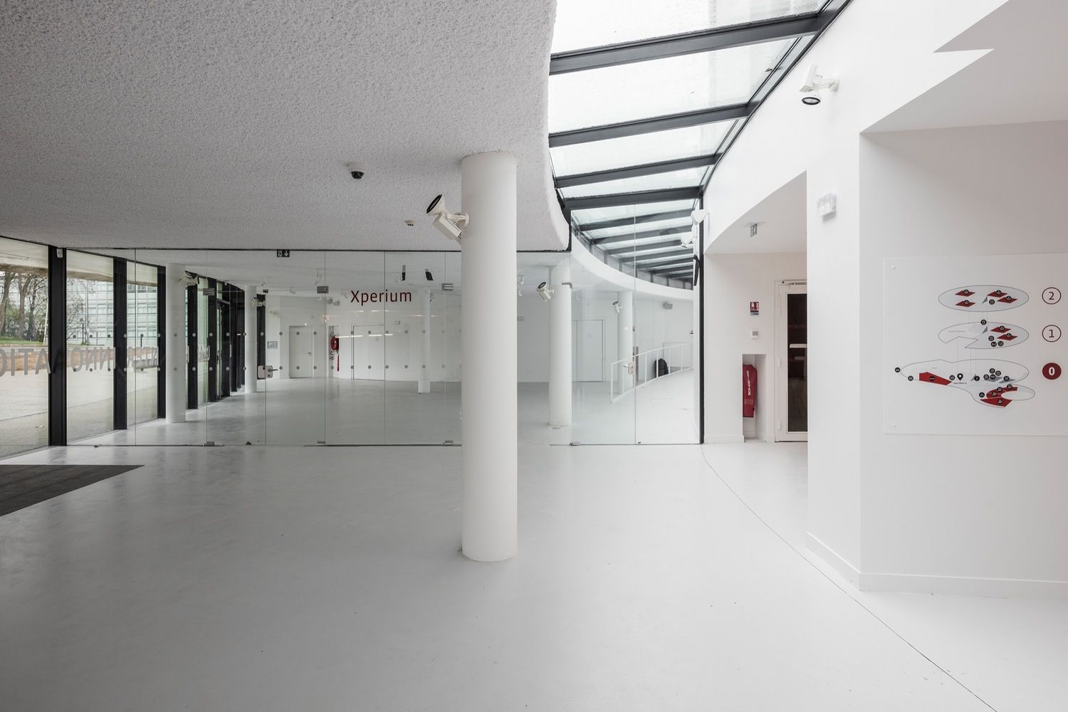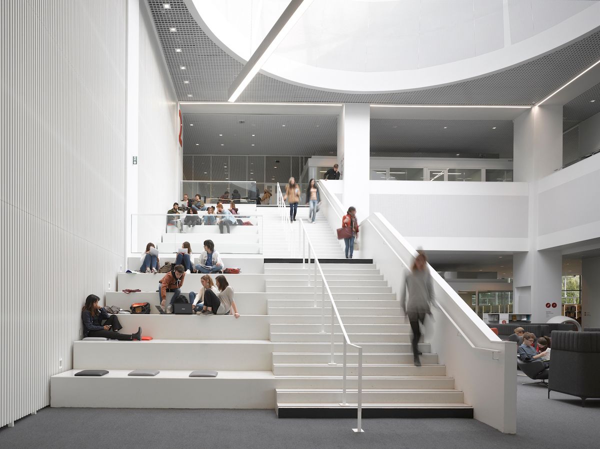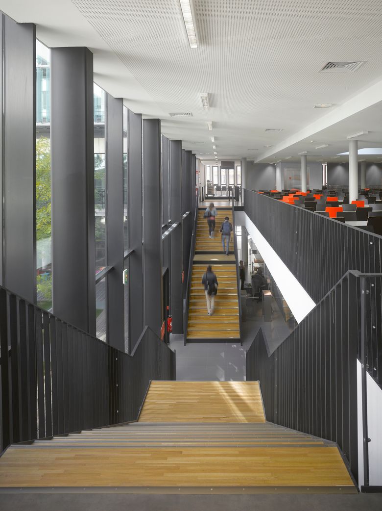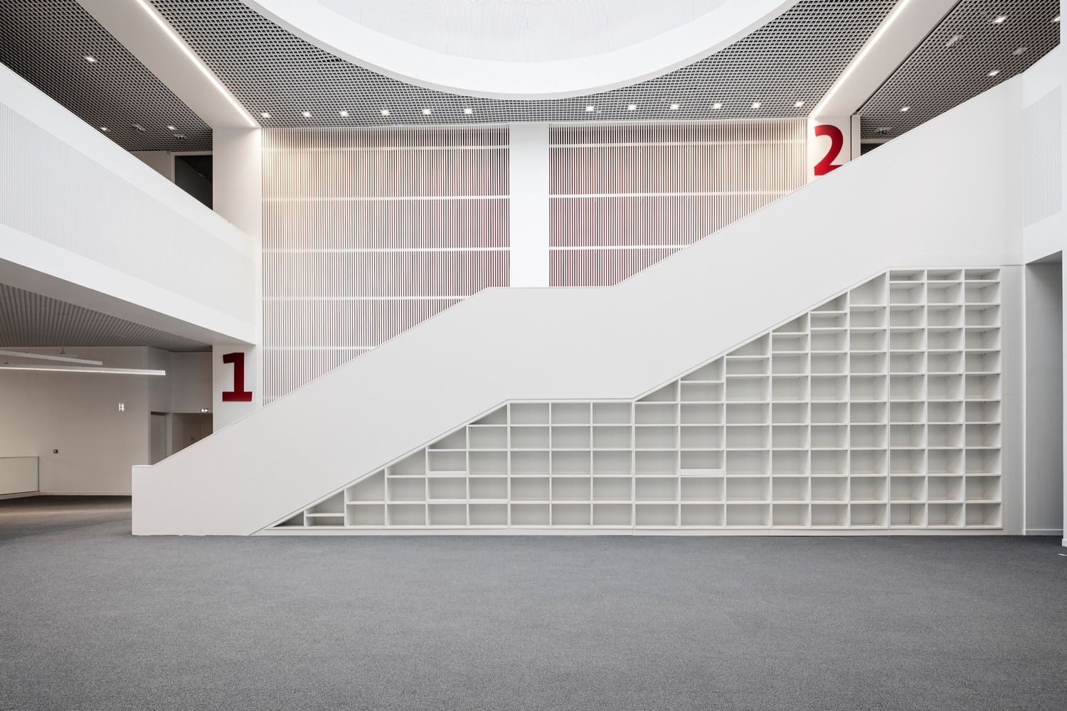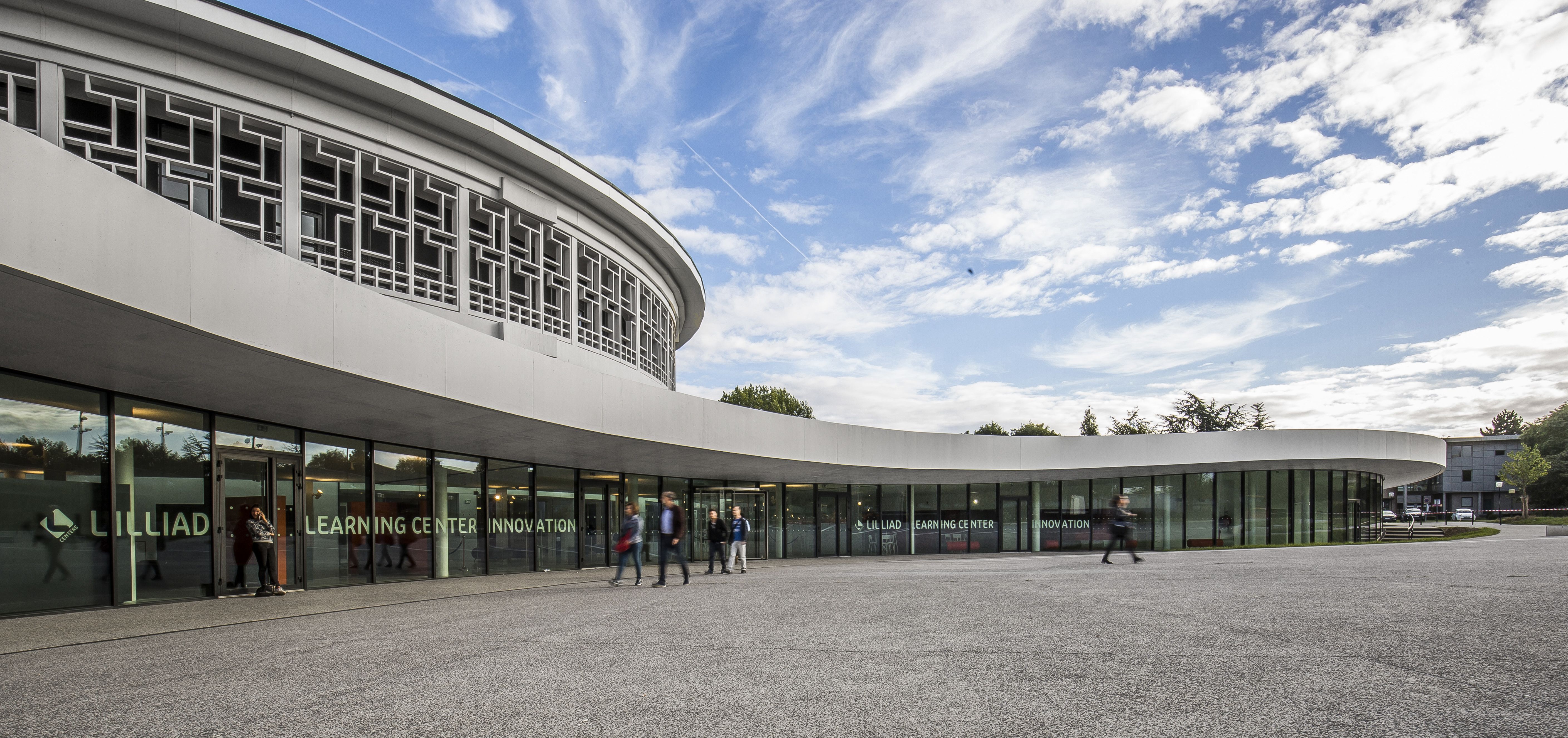 Zukunftsgerichtete Bildung erfordert zeitgemäße Konzepte, insbesondere die Erneuerung der universitären Infrastruktur, zu deren Entwicklung das französische Bildungsministerium maßgeblich beigetragen hat. Die Arbeiten zur Einrichtung und Erweiterung des "Learning Center Innovation" fallen in den Rahmen dieses Programms. Das Gebäude, in dem die derzeitige Bibliothek untergebracht ist, wurde 1965 von dem Architekten Noël Lemaresquier, einem Schüler von Le Corbusier, entworfen und ist strukturell gealtert. Ausschlaggebend war der Umgang mit der perfekten Kreisform des bestehenden Gebäudes und der Fassade, die erhalten bleiben sollte. Wir verzichteten daher auf eine typische Erweiterung des Gebäudes und bevorzugten stattdessen den Ausdruck einer landschaftlichen Lösung: Ein großes Landschaftselement umgibt das Volumen, schafft einen neuen Haupteingang und integriert die neuen Räume in das Konzept. Dieses Landschaftsplateau umgibt die Rotunde und hebt sich durch konzentrische Lichtstrahlen von ihr ab. Ein geschwungenes Dach beherbergt den neuen Empfangsbereich und die Nebenflächen, wobei alle Etagen durch eine Halle mit dem bestehenden Gebäude verbunden sind. Die traditionelle Bibliothek wird so in ein "Lernzentrum" umgewandelt. Die Organisation der Zugänge und die neuen Funktionen unter dem Plateau sind als "alt" und "neu" lesbar: Ein Oberlichtbereich verschiebt die landschaftliche Basis des bestehenden zylindrischen Volumens und nutzt das Lichtband als Schwelle zwischen dem alten und dem neuen Körper. Eine große Halle, die die Eingangsebene mit dem Obergeschoss verbindet, verbindet beide miteinander. Die bestehende Fassade wird weder zerbrochen noch verunstaltet. Die Form des bestehenden Gebäudes - die Geometrie des Kreises - dient als Gestaltungselement zwischen dem alten und dem neuen Körper. Die Kreisform wird wiederholt, skaliert und gegeneinander verschoben. Dadurch werden neue Räume mit unterschiedlichen Funktionen, architektonischen Qualitäten, Tiefen und Beleuchtungsstärken definiert. Die Aufteilung der Innenräume folgt der Komposition zwischen dem bestehenden Gebäude und dem neuen Landschaftsplateau. Während die weitläufigen Lesebereiche und Buchhandlungen im bestehenden Gebäude organisiert sind, werden Funktionen wie der Veranstaltungsbereich und das mit neuen Technologien beladene Xperium öffentlich in der Basis positioniert. Im digitalen Zeitalter lösen sich die Grenzen auf; die klassische Bibliothek ist überholt; digitale Medien und Interaktion gewinnen an Bedeutung und bewirken die Auflösung der räumlichen Grenzen in den Lernzonen. Das Gebäude entwirft eine Wissenslandschaft, die eine zentrale Halle als Kommunikationsraum umschließt. Verschiedene Lerninstitutionen verschmelzen miteinander und schaffen Räume mit multifunktionaler Nutzung, die den Nutzern flexibel einsetzbare Räume bieten. Die Arbeit mit der Innenfassade des kreisförmigen Gebäudes ermöglicht eine Erweiterung der Bibliothek in den Außenraum.
