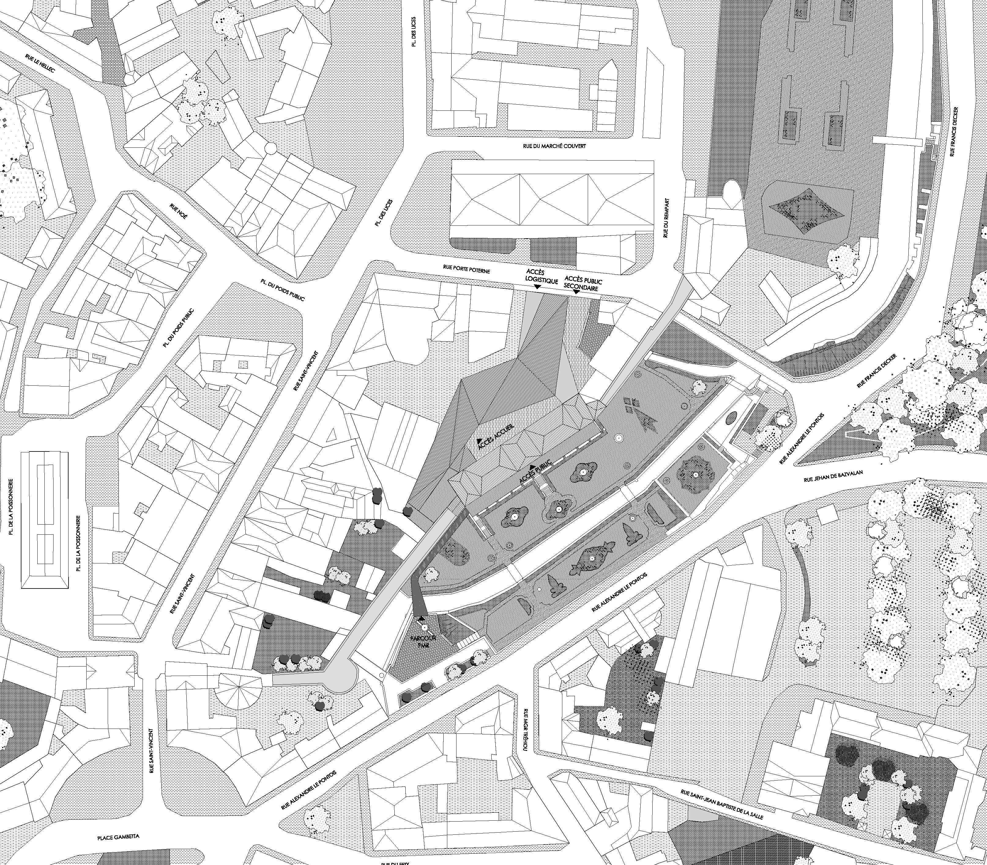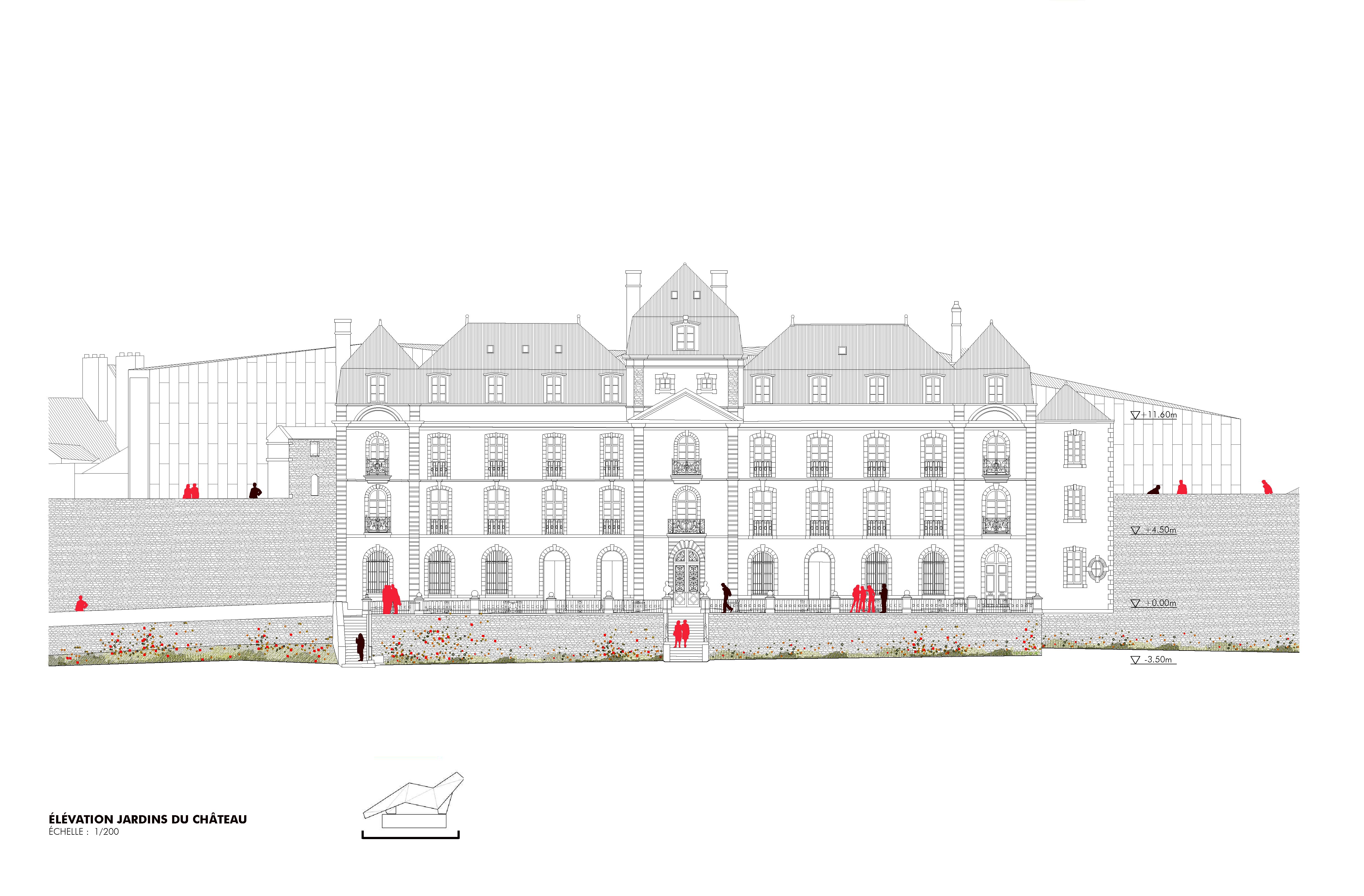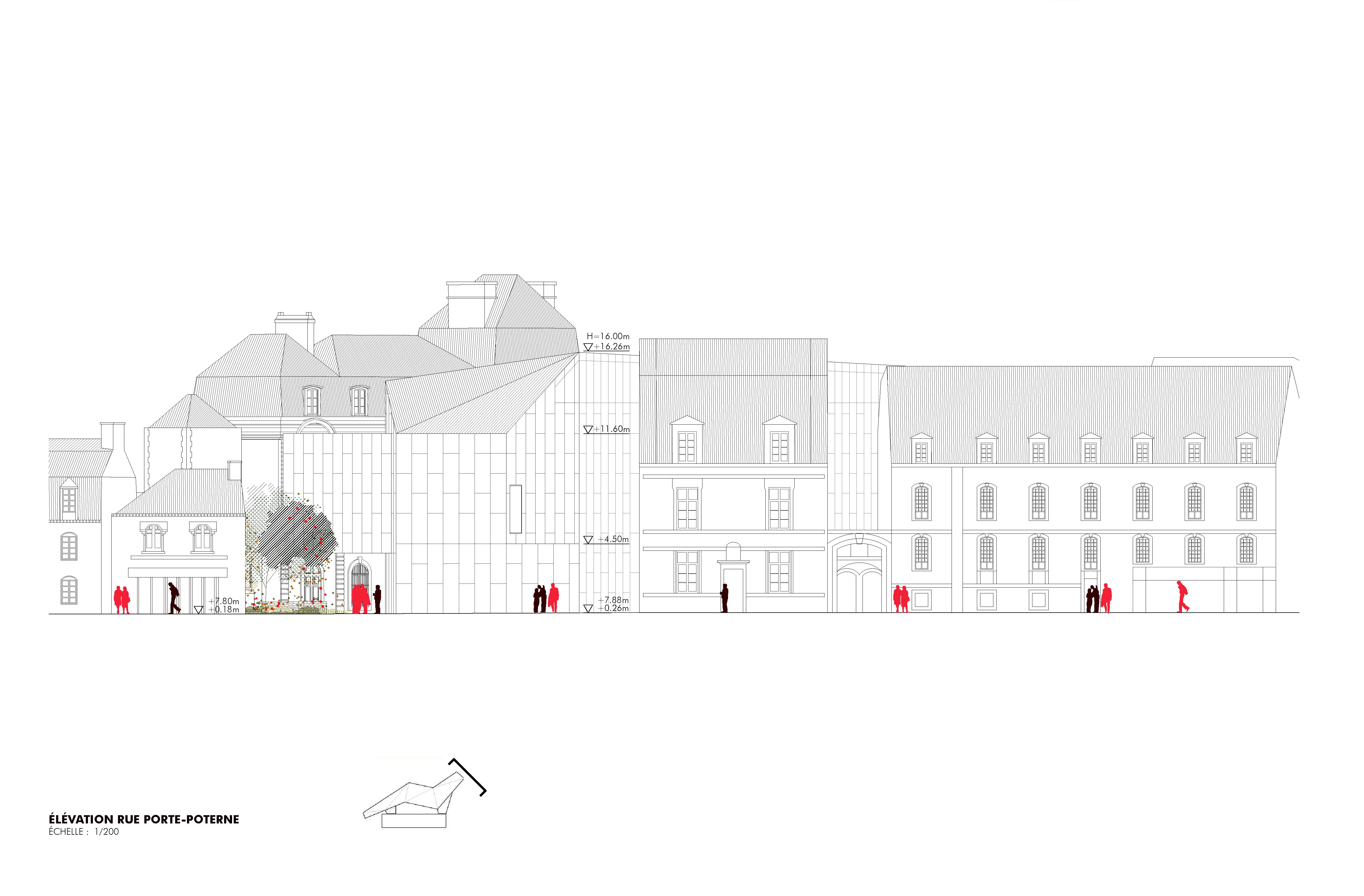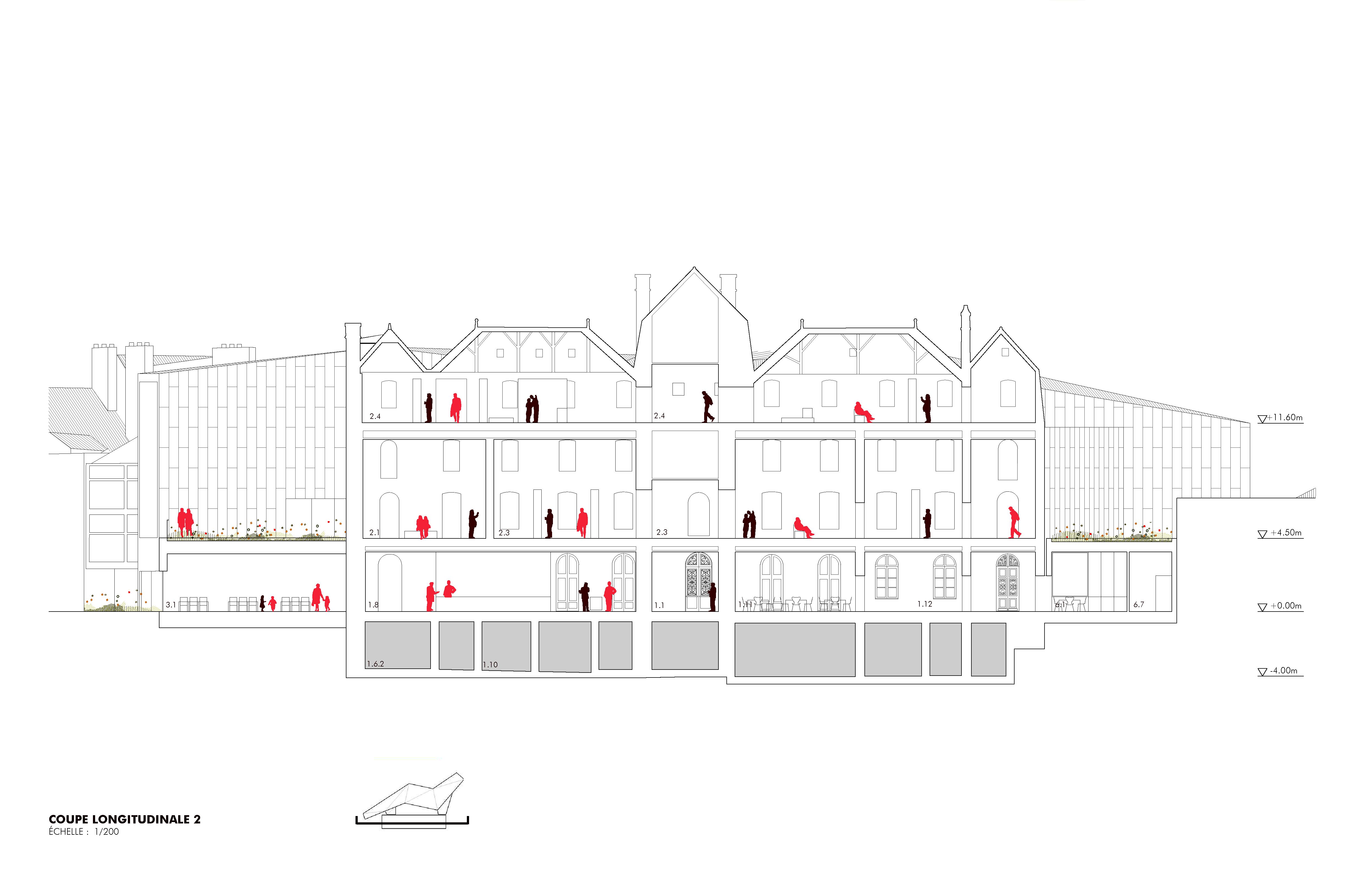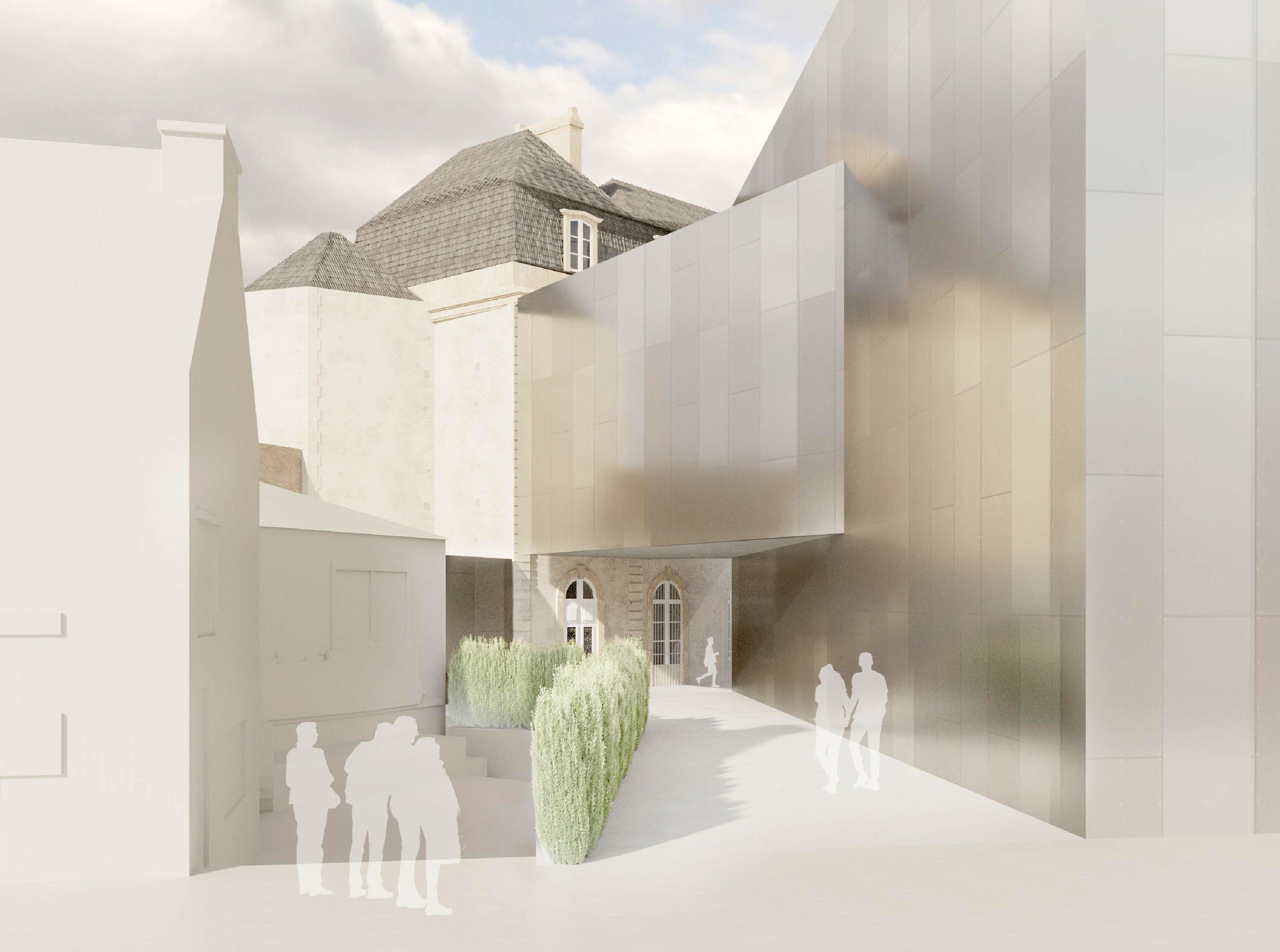 Das Projekt betrifft die Restaurierung und Umstrukturierung des Château de l'Hermine, eines historischen Denkmals der Stadt Vannes, sowie die Realisierung Erweiterungsbaus, um das neue Museum der Schönen Künste zu beherbergen, das das derzeitige Museum "La Cohue" ersetzt. Das Projekt für die Einrichtung des Museums der Schönen Künste ermöglicht die Aufwertung des Château de l'Hermine. Das Projekt entstand aus dem Wunsch heraus, das einzigartige Stadtbild des Schlosses zu erhalten und eine harmonische Beziehung zwischen der Erweiterung und dem historischen Gebäude zu schaffen. Das neue Volumen entwickelt sich innerhalb des geplanten Grundrisses, passt sich den funktionalen Bedürfnissen und Proportionen der Umgebung an. Es erinnert in der Geometrie seines Daches und seiner eigenen Form an die charakteristischen Dächer der mittelalterlichen Stadt. Das historische Gebäude beherbergt im Erdgeschoss den Buchladen und die Cafeteria und in den oberen Stockwerken einen Teil der Dauerausstellungen, während der Erweiterungsbau, der auf dem derzeitigen Schlosshof errichtet wird, die Wechselausstellungen, den anderen Teil der Dauerausstellungen sowie Logistik- und Verwaltungsbereiche beherbergt. Der Erweiterungsbau wird sich durch seine Materialität außerhalb des Museumsgeländes in den Himmel der Stadt Vannes einfügen, wobei die visuelle Dominanz des Schlosses gewahrt bleibt. Dieser Vorschlag berücksichtigt die Größe der Umgebung und das kulturelle Erbe des Standorts und ist sich der Rolle der zeitgenössischen Architektur in Bezug auf die Gegenwart, Vergangenheit und Zukunft der Stadt bewusst. Die Frage der klimatischen Behandlung der Räume ist bei einem Museumsprojekt, das in ein bestehendes Gebäude integriert wird, von grundlegender Bedeutung, da es gilt, die Erhaltung der Werke mit einer perfekten Beherrschung der klimatischen Aspekte und den Zwängen eines bestehenden Gebäudes in Einklang zu bringen. Aus diesem Grund sind Umweltaspekte so wichtig. So besteht die Strategie für dieses Projekt darin, die hygienische Lufterneuerung von der Klimakontrolle der Räume zu trennen, es wurden biologische Materialien bevorzugt und das Projekt zielt darauf ab, die RE 2020-Schwellenwerte 2022 für die Erweiterung und NF HQE Bâtiment tertiaire rénovation 2015 zu erfüllen.