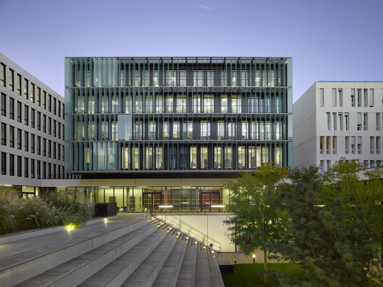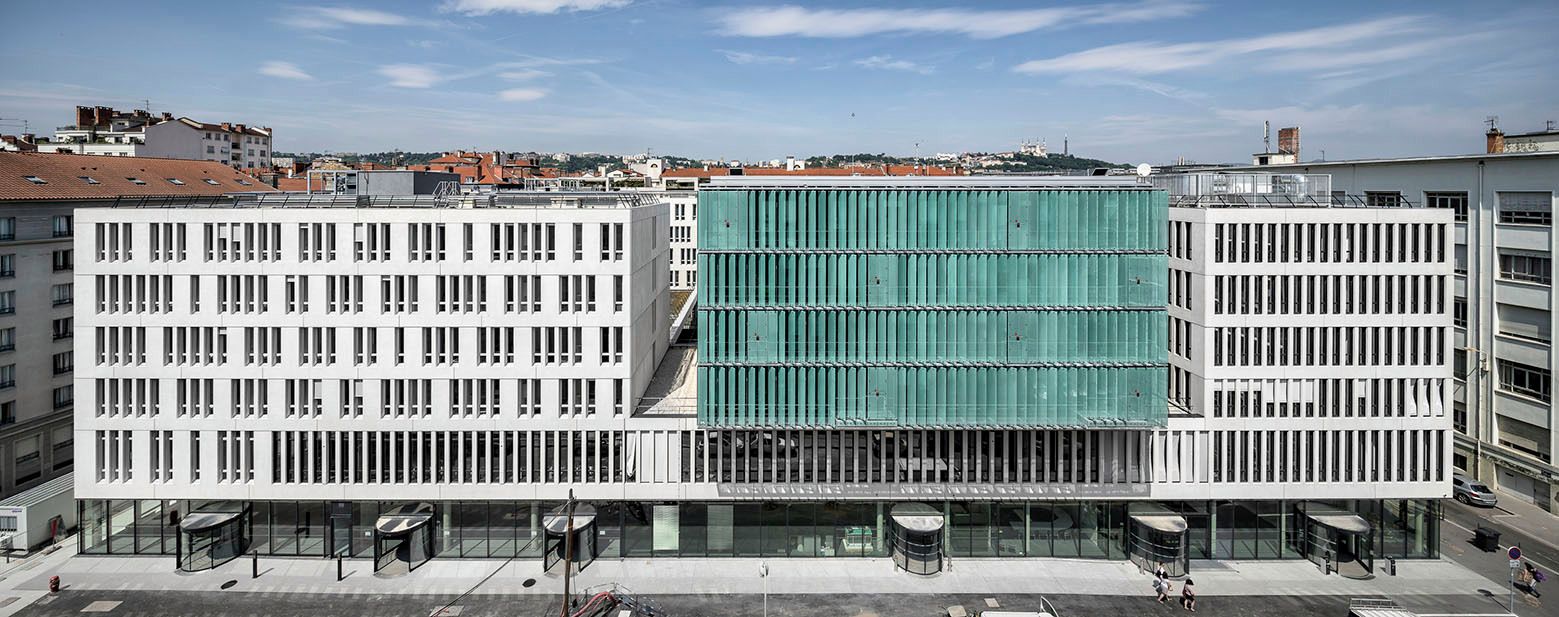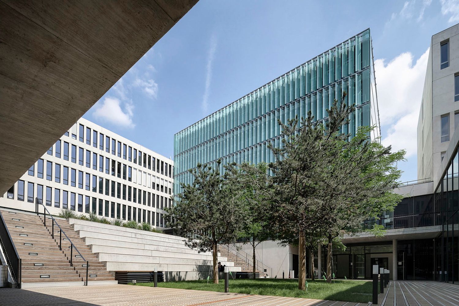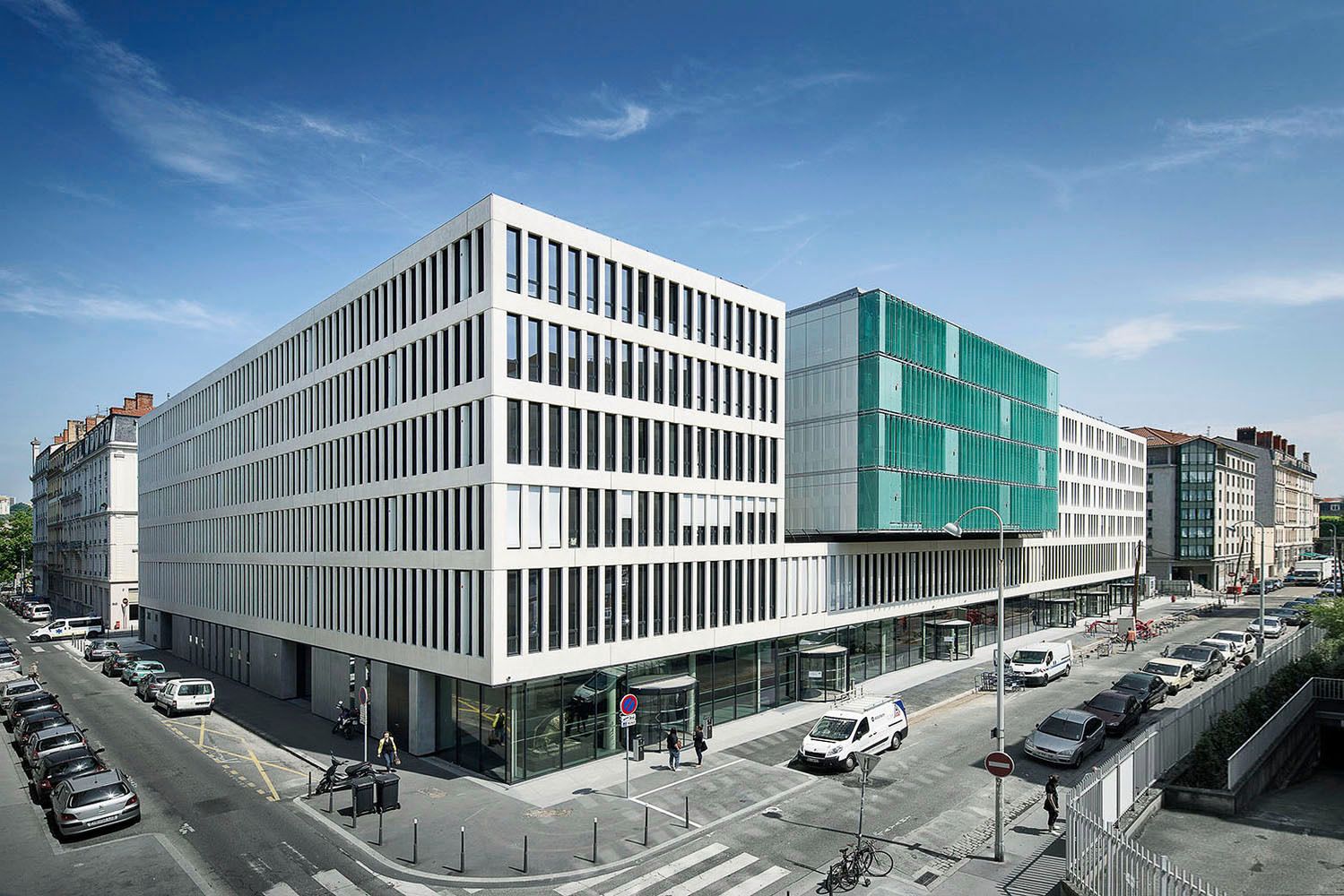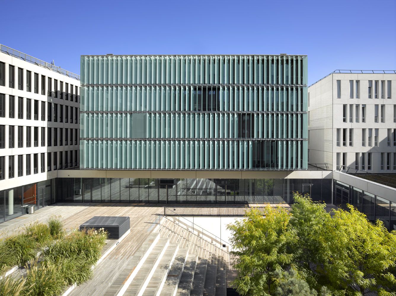 Das neue Universitätszentrum am östlichen Ufer der Rhône im französischen Lyon besteht aus insgesamt fünf Gebäudeeinheiten: dem Institut für Technologie IUT für ungefähr 900 Studierende, der Verwaltung für Forschung und Hochschulwesen PRES, einer Mensa für knapp 1900 Essen, einem Studentenwohnheim für 200 Betten und dem Internationalen Haus der Sprachen und Kulturen. Ringförmig um einen introvertiert gestalteten Innenhof angeordnet, bilden die einzelnen Bausteine zur stadtgewandten Seite trotz funktionaler Trennung eine homogene Einheit. Hofseitig entsteht jedoch ein Wechselspiel der einzelnen Volumen. Der Gedanke eines öffentlichen Ortes der Kommunikation und des Austauschs scheint sich hier indirekt auch auf die Interaktion der einzelnen Baukörper zu übertragen. Abgestufte Terrassenbereiche, eine große Freitreppe und Vor- und Rücksprünge der einzelnen Körper kreieren ein großzügiges Forum mit Aufenthaltsqualität. Die Fassade bilden helle Betonsandwichelemente mit sich in schmalen Abständen wiederholenden Linsen. Ein integrierter Sonnenschutz und der Verzicht auf additive Elemente wie Fensterbänke sollen eine klare einheitliche Struktur entstehen lassen. Homogene Materialien und deren Farbgebung schaffen einen ausgewogenen Dialog mit der Umgebung. Als Herzstück und bewusster Kontrast fungiert ein gläserner Kubus über dem Hauptzugang an der Rue de Pasteur. Mit einer Hülle aus verstellbaren, vertikalen Glaslamellen und einer divergenten Größe, im Vergleich zu den anderen Bausteinen, bildet er das i-Tüpfelchen des Ensembles. So als würde er über dem Komplex schweben und durch die gläserne Fassade das gesamte Areal im Blick haben, beherbergt er den Kopf des Ensembles – die Verwaltung für Forschung und Hochschulwesen. Während sich im Erdgeschoss die öffentlichen Bereiche wie Foyer, Mensa und die Hörsäle ansiedeln, sind die oberen Geschosse für Büros, Seminarräume und Studentenwohnungen reserviert. Mittelpunkt bildet hier das abgesenkte Auditorium, welches auf seinem Dach im ersten Obergeschoss eine großzügige Terrasse ausbildet und sich über Sitzstufen mit dem Innenhof verbindet. Während sich das Ensemble in seiner Gebäudeform geradlinig der Umgebung und der Blockstruktur anpasst, entsteht im Innenhof eine natürlichere, offenere Raumsituation, die zum Verweilen einlädt – ein Wechselspiel, mit dem die Architekten eine glaubwürdige Antwort auf die nicht ganz leichte Bauaufgabe geben.
