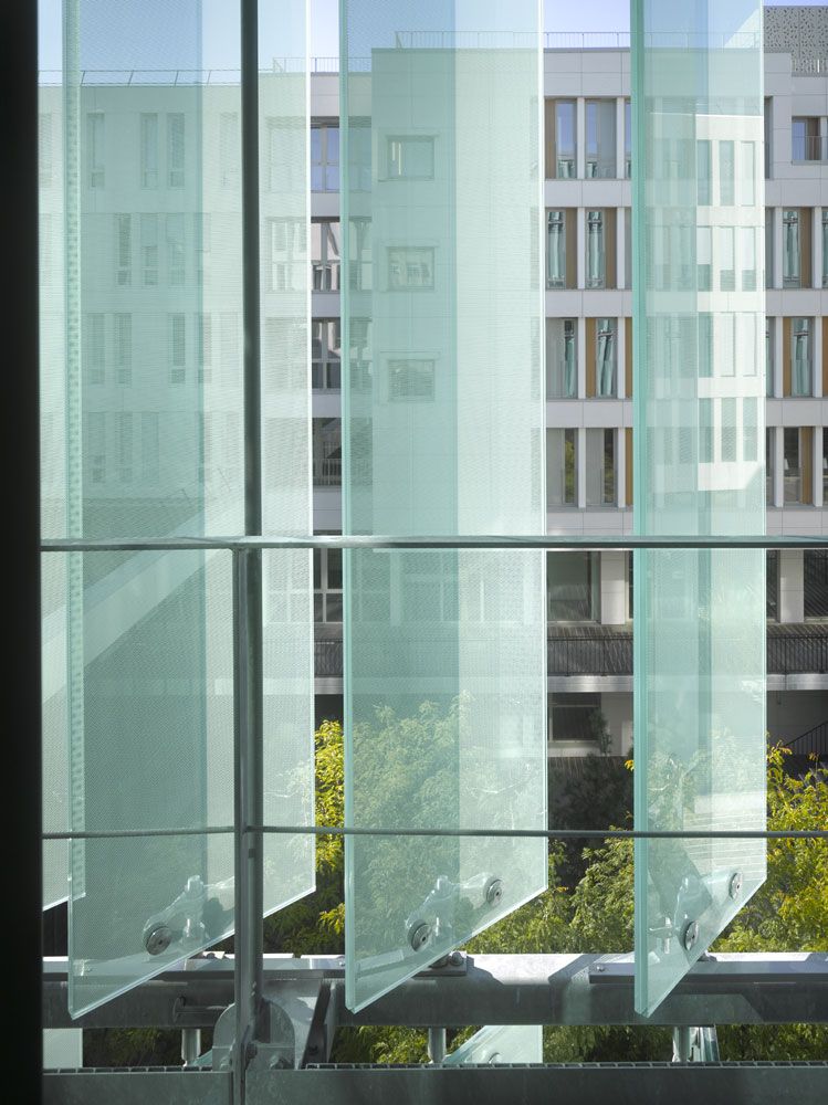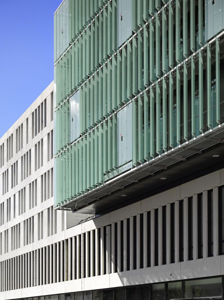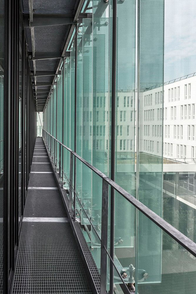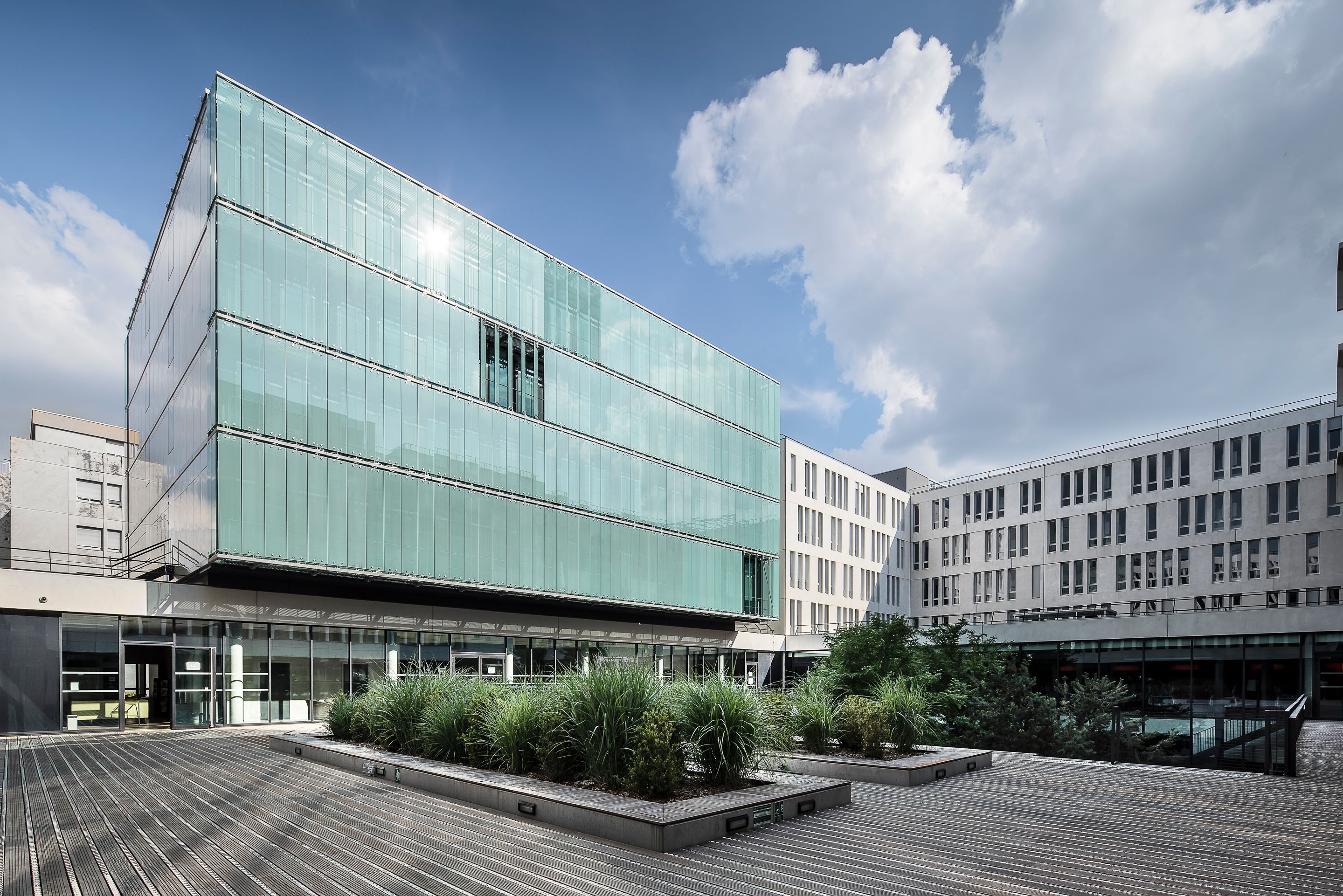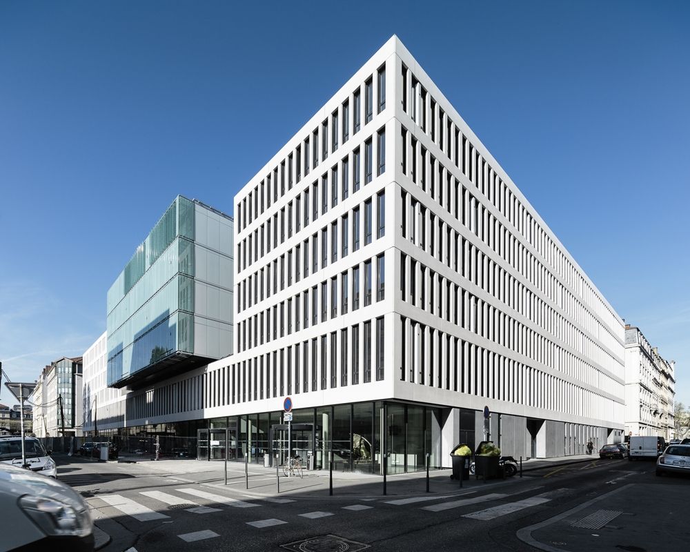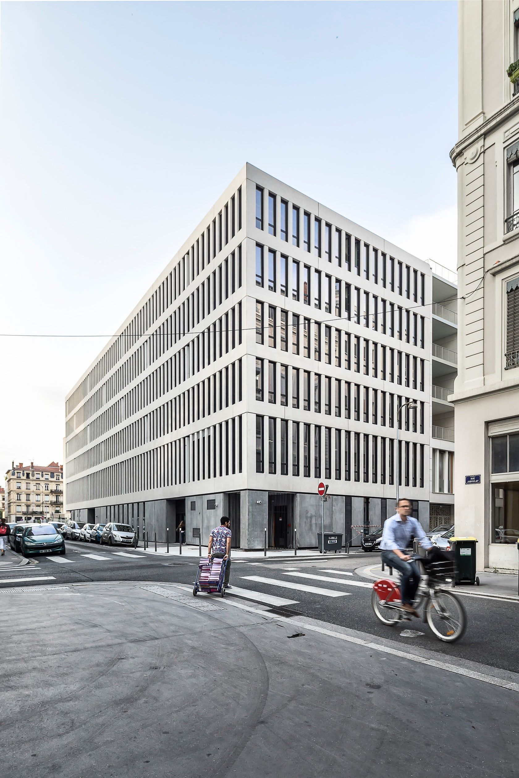 Das neue Universitätszentrum am östlichen Ufer der Rhône im französischen Lyon besteht aus insgesamt fünf Gebäudeeinheiten: dem Institut für Technologie IUT für ungefähr 900 Studierende, der Verwaltung für Forschung und Hochschulwesen PRES, einer Mensa für knapp 1900 Essen, einem Studentenwohnheim für 200 Betten und dem Internationalen Haus der Sprachen und Kulturen. Ringförmig um einen introvertiert gestalteten Innenhof angeordnet, bilden die einzelnen Bausteine zur stadtgewandten Seite trotz funktionaler Trennung eine homogene Einheit. Hofseitig entsteht jedoch ein Wechselspiel der einzelnen Volumen. Der Gedanke eines öffentlichen Ortes der Kommunikation und des Austauschs scheint sich hier indirekt auch auf die Interaktion der einzelnen Baukörper zu übertragen. Abgestufte Terrassenbereiche, eine große Freitreppe und Vor- und Rücksprünge der einzelnen Körper kreieren ein großzügiges Forum mit Aufenthaltsqualität. Die Fassade bilden helle Betonsandwichelemente mit sich in schmalen Abständen wiederholenden Linsen. Ein integrierter Sonnenschutz und der Verzicht auf additive Elemente wie Fensterbänke sollen eine klare einheitliche Struktur entstehen lassen. Homogene Materialien und deren Farbgebung schaffen einen ausgewogenen Dialog mit der Umgebung. Als Herzstück und bewusster Kontrast fungiert ein gläserner Kubus über dem Hauptzugang an der Rue de Pasteur. Mit einer Hülle aus verstellbaren, vertikalen Glaslamellen und einer divergenten Größe, im Vergleich zu den anderen Bausteinen, bildet er das i-Tüpfelchen des Ensembles. So als würde er über dem Komplex schweben und durch die gläserne Fassade das gesamte Areal im Blick haben, beherbergt er den Kopf des Ensembles – die Verwaltung für Forschung und Hochschulwesen. Während sich im Erdgeschoss die öffentlichen Bereiche wie Foyer, Mensa und die Hörsäle ansiedeln, sind die oberen Geschosse für Büros, Seminarräume und Studentenwohnungen reserviert. Mittelpunkt bildet hier das abgesenkte Auditorium, welches auf seinem Dach im ersten Obergeschoss eine großzügige Terrasse ausbildet und sich über Sitzstufen mit dem Innenhof verbindet. Während sich das Ensemble in seiner Gebäudeform geradlinig der Umgebung und der Blockstruktur anpasst, entsteht im Innenhof eine natürlichere, offenere Raumsituation, die zum Verweilen einlädt – ein Wechselspiel, mit dem die Architekten eine glaubwürdige Antwort auf die nicht ganz leichte Bauaufgabe geben.