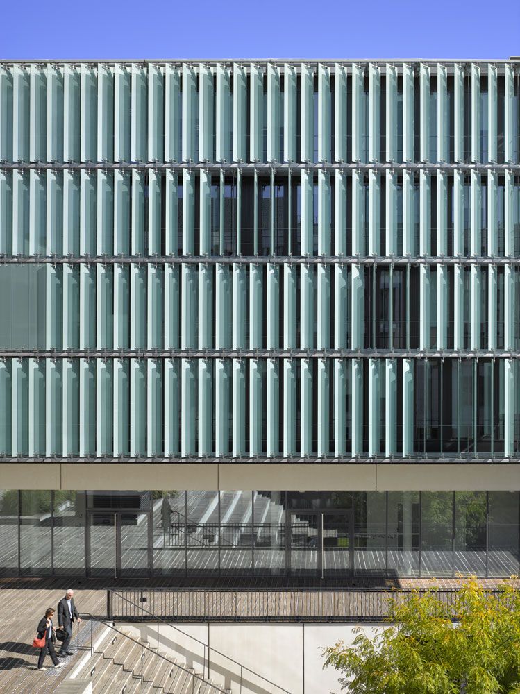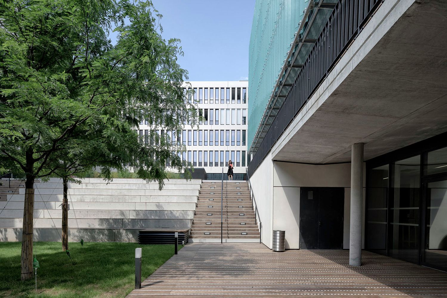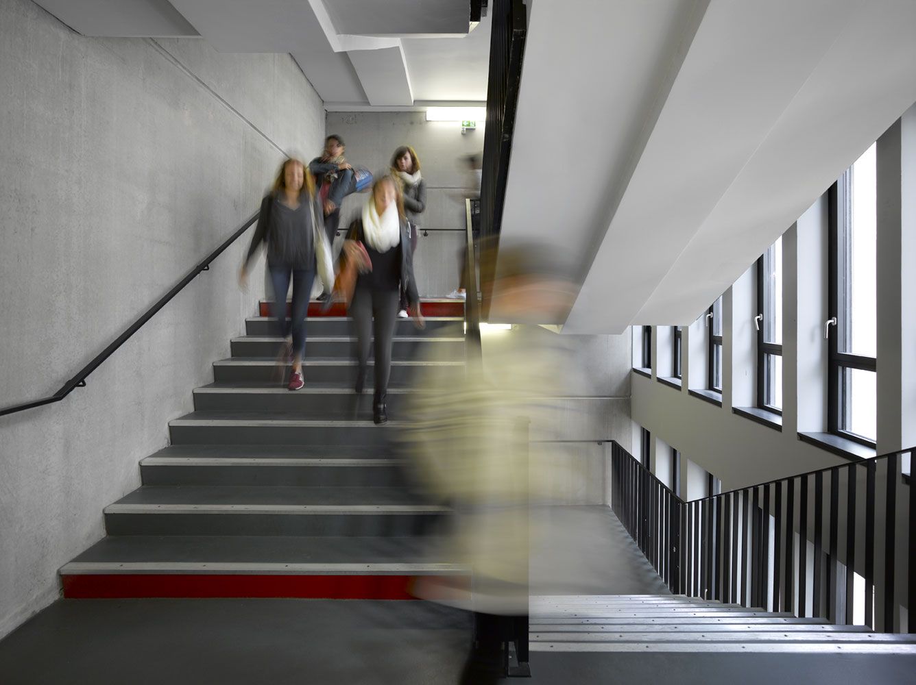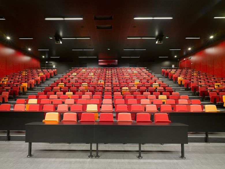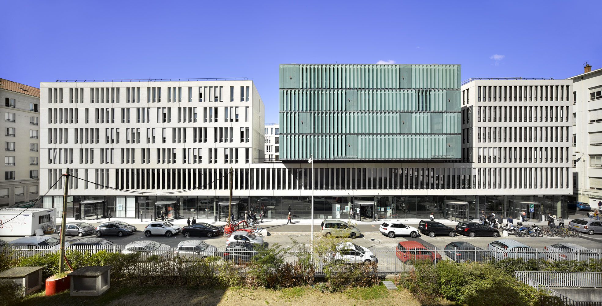 Das neue Universitätszentrum am östlichen Ufer der Rhône im französischen Lyon besteht aus insgesamt fünf Gebäudeeinheiten: dem Institut für Technologie IUT für ungefähr 900 Studierende, der Verwaltung für Forschung und Hochschulwesen PRES, einer Mensa für knapp 1900 Essen, einem Studentenwohnheim für 200 Betten und dem Internationalen Haus der Sprachen und Kulturen. Ringförmig um einen introvertiert gestalteten Innenhof angeordnet, bilden die einzelnen Bausteine zur stadtgewandten Seite trotz funktionaler Trennung eine homogene Einheit. Hofseitig entsteht jedoch ein Wechselspiel der einzelnen Volumen. Der Gedanke eines öffentlichen Ortes der Kommunikation und des Austauschs scheint sich hier indirekt auch auf die Interaktion der einzelnen Baukörper zu übertragen. Abgestufte Terrassenbereiche, eine große Freitreppe und Vor- und Rücksprünge der einzelnen Körper kreieren ein großzügiges Forum mit Aufenthaltsqualität. Die Fassade bilden helle Betonsandwichelemente mit sich in schmalen Abständen wiederholenden Linsen. Ein integrierter Sonnenschutz und der Verzicht auf additive Elemente wie Fensterbänke sollen eine klare einheitliche Struktur entstehen lassen. Homogene Materialien und deren Farbgebung schaffen einen ausgewogenen Dialog mit der Umgebung. Als Herzstück und bewusster Kontrast fungiert ein gläserner Kubus über dem Hauptzugang an der Rue de Pasteur. Mit einer Hülle aus verstellbaren, vertikalen Glaslamellen und einer divergenten Größe, im Vergleich zu den anderen Bausteinen, bildet er das i-Tüpfelchen des Ensembles. So als würde er über dem Komplex schweben und durch die gläserne Fassade das gesamte Areal im Blick haben, beherbergt er den Kopf des Ensembles – die Verwaltung für Forschung und Hochschulwesen. Während sich im Erdgeschoss die öffentlichen Bereiche wie Foyer, Mensa und die Hörsäle ansiedeln, sind die oberen Geschosse für Büros, Seminarräume und Studentenwohnungen reserviert. Mittelpunkt bildet hier das abgesenkte Auditorium, welches auf seinem Dach im ersten Obergeschoss eine großzügige Terrasse ausbildet und sich über Sitzstufen mit dem Innenhof verbindet. Während sich das Ensemble in seiner Gebäudeform geradlinig der Umgebung und der Blockstruktur anpasst, entsteht im Innenhof eine natürlichere, offenere Raumsituation, die zum Verweilen einlädt – ein Wechselspiel, mit dem die Architekten eine glaubwürdige Antwort auf die nicht ganz leichte Bauaufgabe geben.