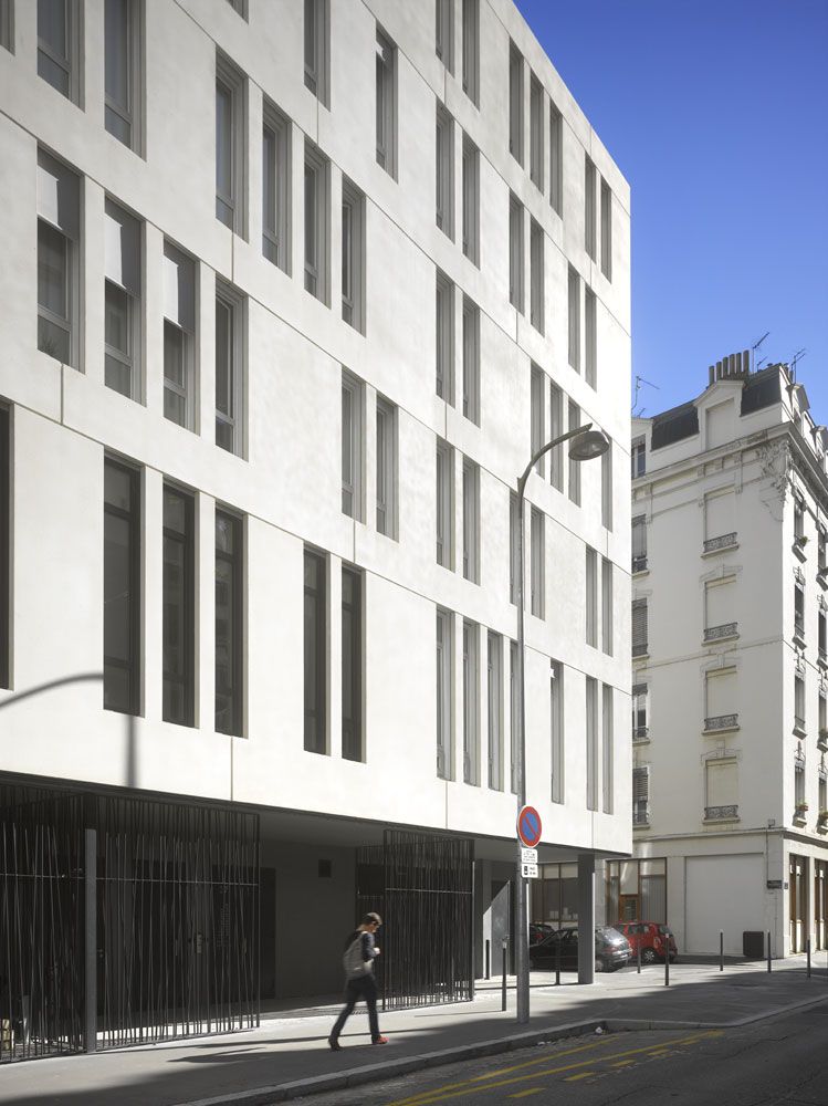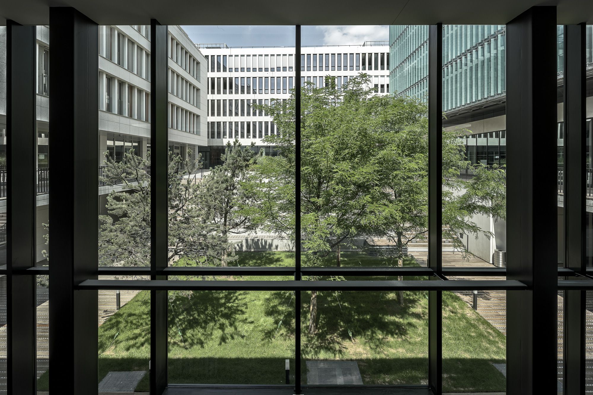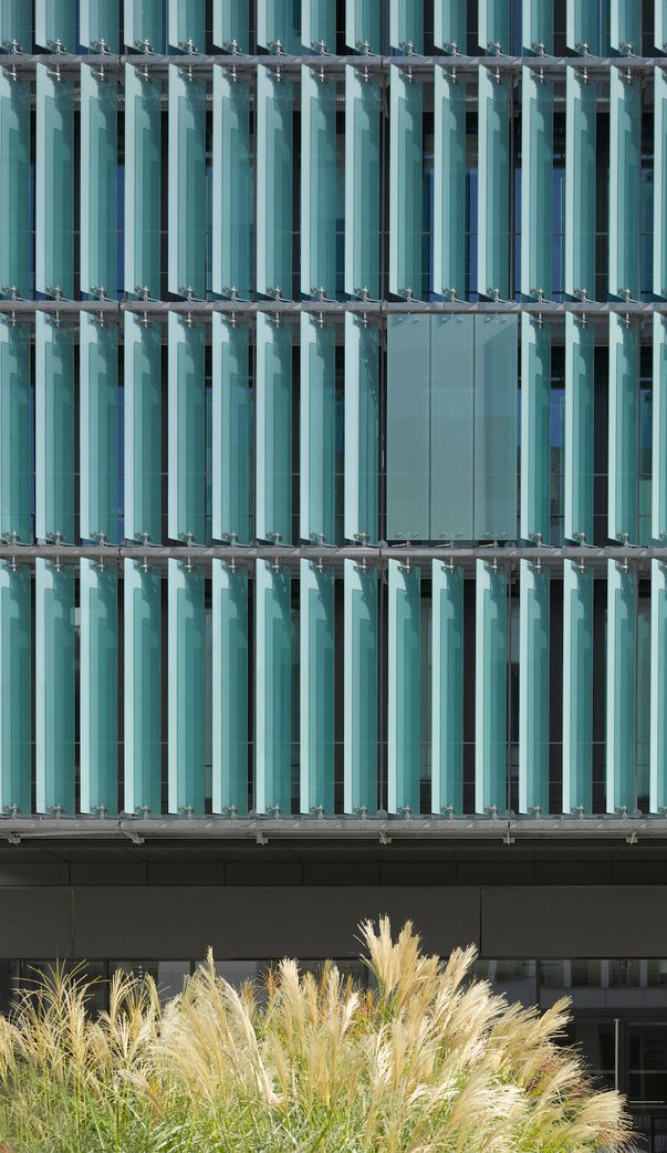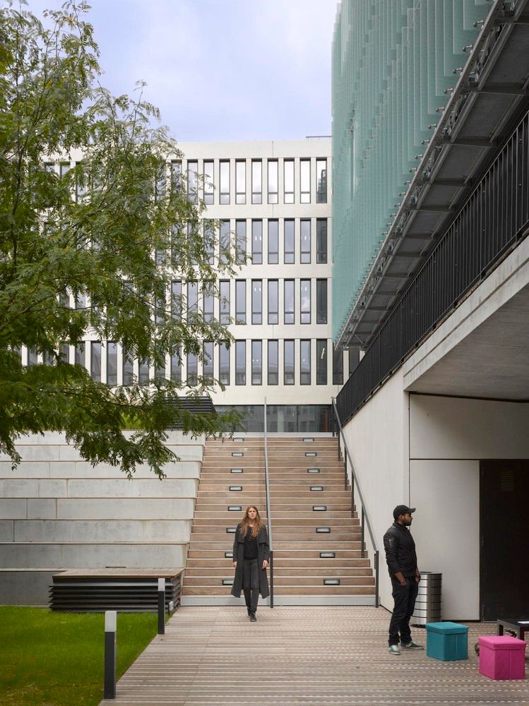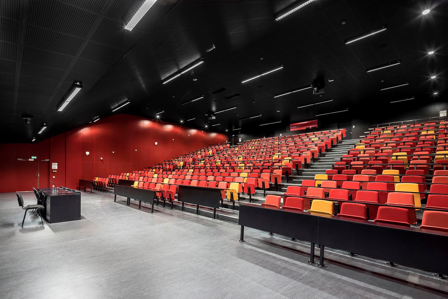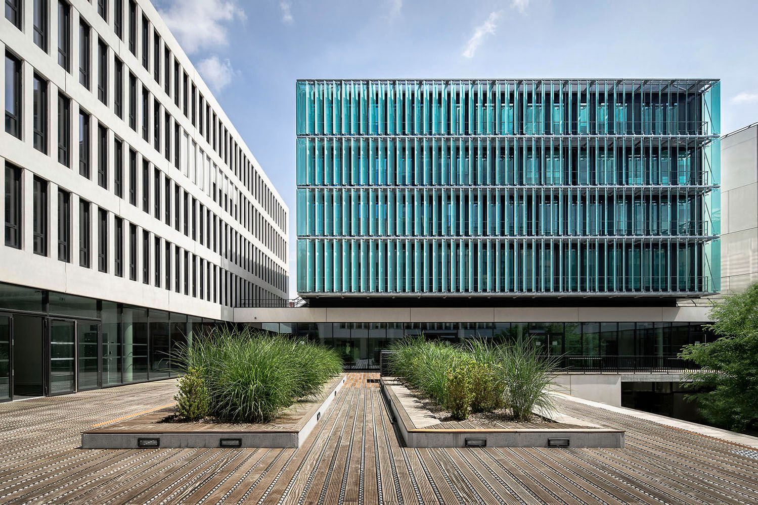 Das neue Universitätszentrum am östlichen Ufer der Rhône im französischen Lyon besteht aus insgesamt fünf Gebäudeeinheiten: dem Institut für Technologie IUT für ungefähr 900 Studierende, der Verwaltung für Forschung und Hochschulwesen PRES, einer Mensa für knapp 1900 Essen, einem Studentenwohnheim für 200 Betten und dem Internationalen Haus der Sprachen und Kulturen. Ringförmig um einen introvertiert gestalteten Innenhof angeordnet, bilden die einzelnen Bausteine zur stadtgewandten Seite trotz funktionaler Trennung eine homogene Einheit. Hofseitig entsteht jedoch ein Wechselspiel der einzelnen Volumen. Der Gedanke eines öffentlichen Ortes der Kommunikation und des Austauschs scheint sich hier indirekt auch auf die Interaktion der einzelnen Baukörper zu übertragen. Abgestufte Terrassenbereiche, eine große Freitreppe und Vor- und Rücksprünge der einzelnen Körper kreieren ein großzügiges Forum mit Aufenthaltsqualität. Die Fassade bilden helle Betonsandwichelemente mit sich in schmalen Abständen wiederholenden Linsen. Ein integrierter Sonnenschutz und der Verzicht auf additive Elemente wie Fensterbänke sollen eine klare einheitliche Struktur entstehen lassen. Homogene Materialien und deren Farbgebung schaffen einen ausgewogenen Dialog mit der Umgebung. Als Herzstück und bewusster Kontrast fungiert ein gläserner Kubus über dem Hauptzugang an der Rue de Pasteur. Mit einer Hülle aus verstellbaren, vertikalen Glaslamellen und einer divergenten Größe, im Vergleich zu den anderen Bausteinen, bildet er das i-Tüpfelchen des Ensembles. So als würde er über dem Komplex schweben und durch die gläserne Fassade das gesamte Areal im Blick haben, beherbergt er den Kopf des Ensembles – die Verwaltung für Forschung und Hochschulwesen. Während sich im Erdgeschoss die öffentlichen Bereiche wie Foyer, Mensa und die Hörsäle ansiedeln, sind die oberen Geschosse für Büros, Seminarräume und Studentenwohnungen reserviert. Mittelpunkt bildet hier das abgesenkte Auditorium, welches auf seinem Dach im ersten Obergeschoss eine großzügige Terrasse ausbildet und sich über Sitzstufen mit dem Innenhof verbindet. Während sich das Ensemble in seiner Gebäudeform geradlinig der Umgebung und der Blockstruktur anpasst, entsteht im Innenhof eine natürlichere, offenere Raumsituation, die zum Verweilen einlädt – ein Wechselspiel, mit dem die Architekten eine glaubwürdige Antwort auf die nicht ganz leichte Bauaufgabe geben.