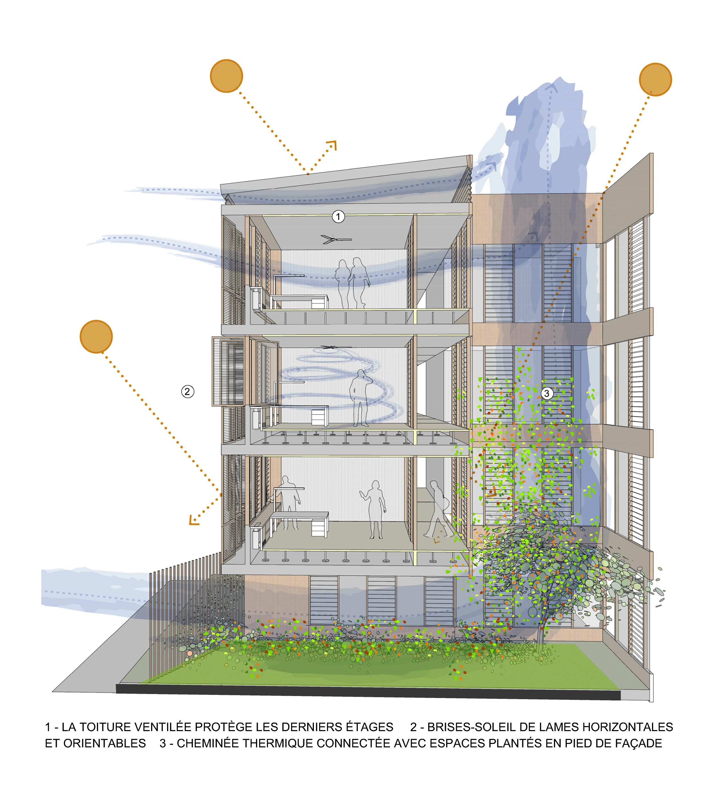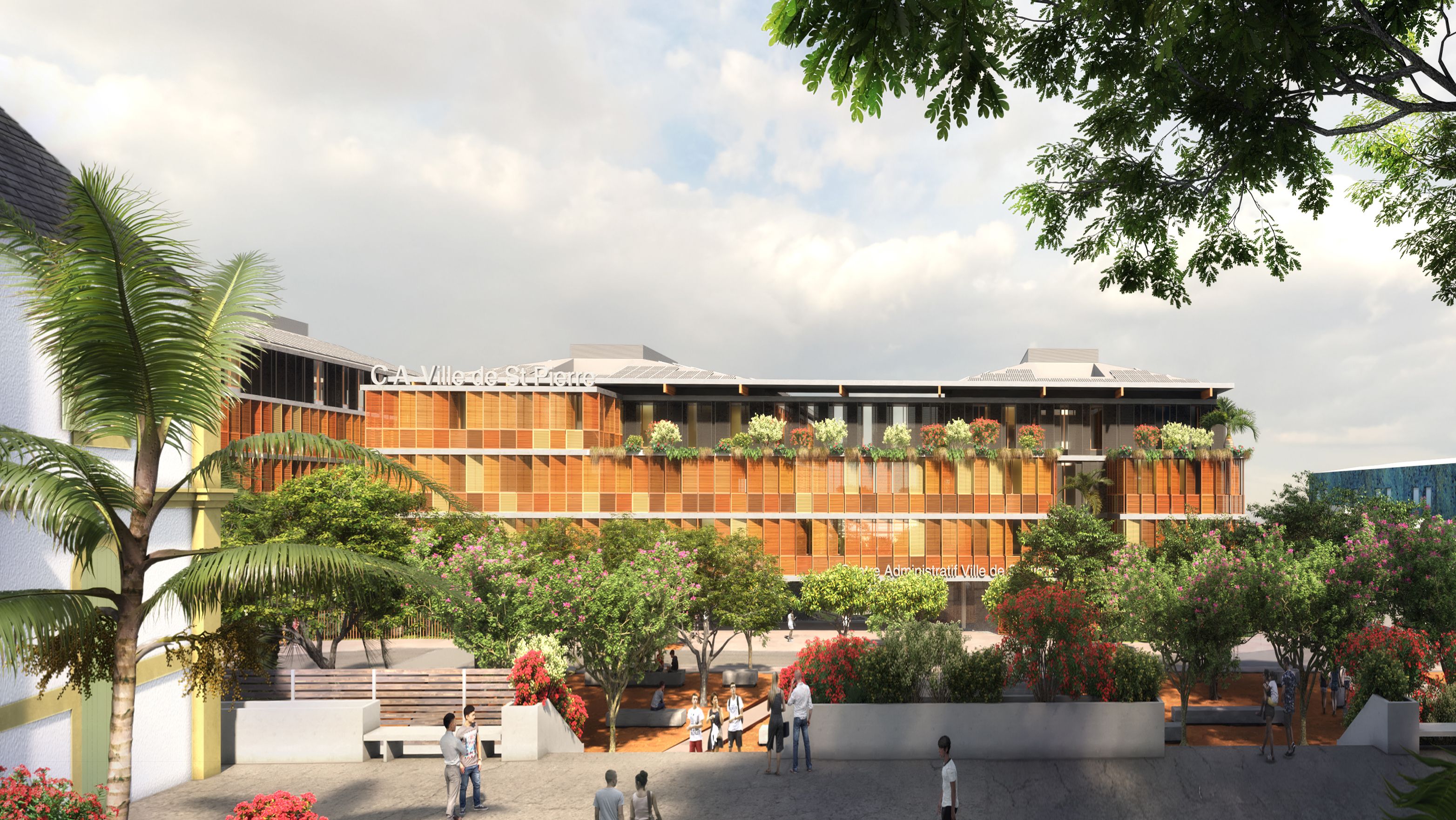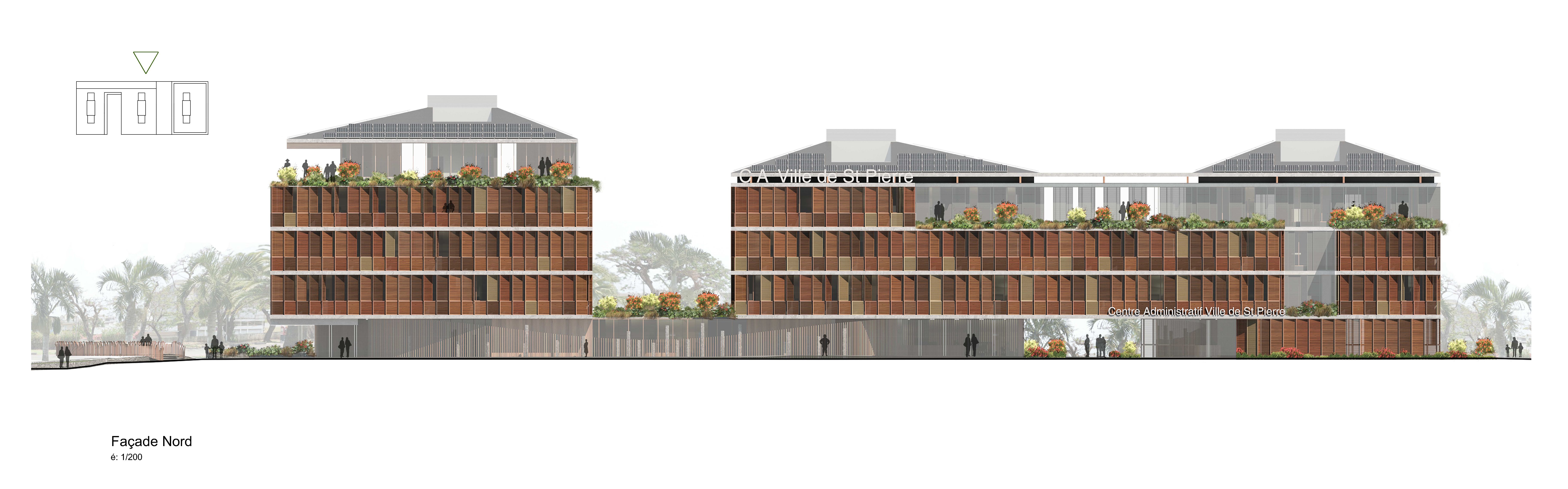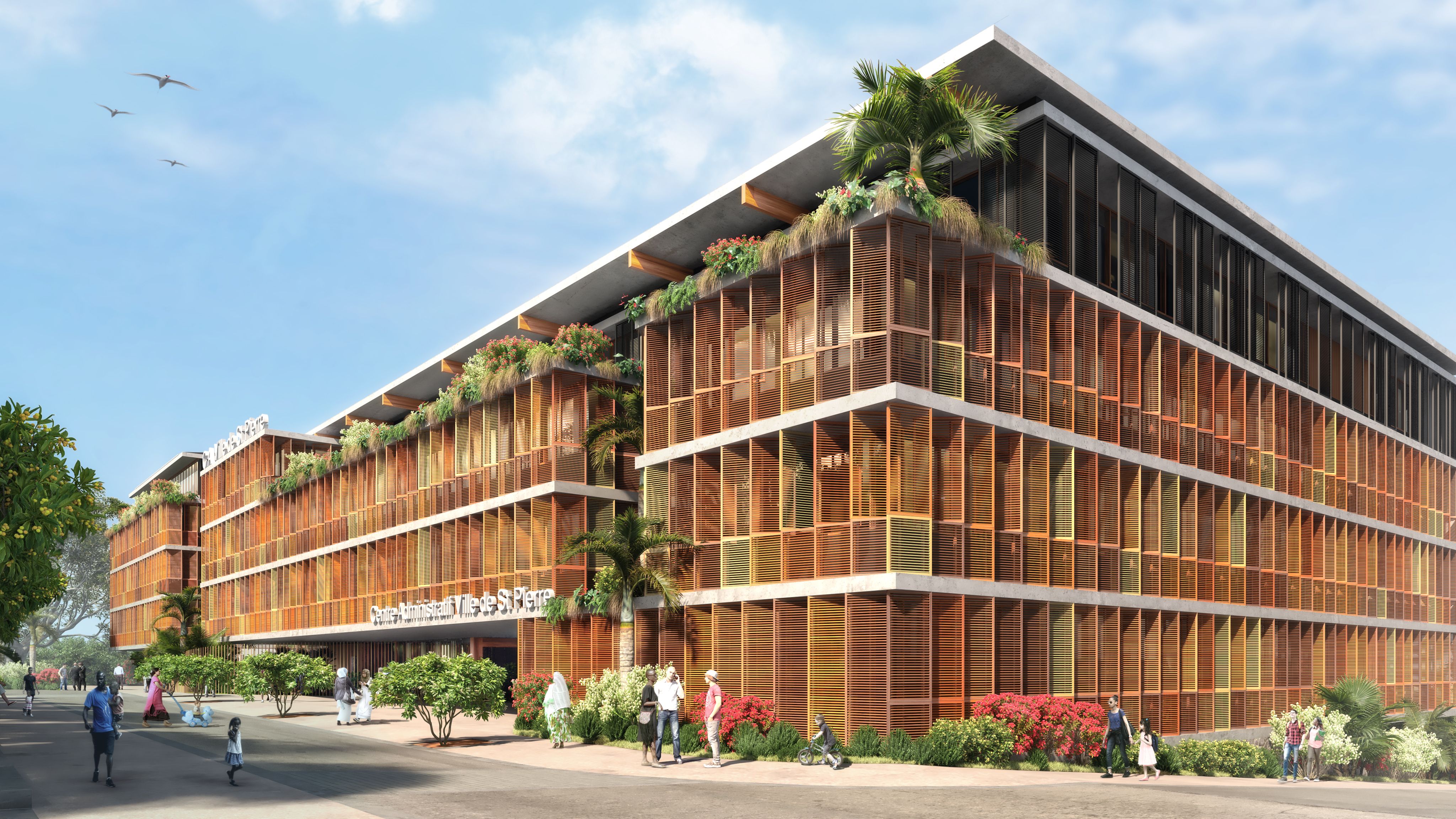 Die von der SPL unterstützte Stadt Saint-Pierre möchte die verschiedenen kommunalen Dienstleistungen, die auf verschiedene Standorte verteilt sind, zusammenführen, um die Betriebskosten zu senken und die Organisation der Dienstleistungen zu verbessern. Das Projekt im Herzen der Stadt und in der Nähe des historischen Rathauses ist als Flaggschiff konzipiert. Ziel ist es, einen neuen öffentlichen Platz zu schaffen, eine wahre Promenade mit grünen Gärten. Die Gebäude beherbergen verschiedene Verwaltungsabteilungen, Archiv- und Reprografie-Räumlichkeiten, eine Polizeistation, ein Panorama-Restaurant sowie Parkplätze. Das Gebäude ist in zwei funktionale Schichten unterteilt, die über den gesamten Standort verteilt sind, um die Zentralität des Ortes auszudrücken, und die Vielzahl der Funktionen aufzuzeigen. Der Vorplatz ist mit dekorativem Beton belegt und ist übersichtlich und minimalistisch in seiner Form, um die Architektur und Pflanzenformen zur Geltung zu bringen. Er wird von einem Skelettzaun eingerahmt, der durch seine geschwungene Form Passanten einlädt, die Verwaltungsstadt zu betreten und im landschaftlich gestalteten Durchgang die Insel zu überqueren. In jedem der Gebäude sind die Räumlichkeiten um zwei Terrassen herum angeordnet, die die Rolle eines thermischen Schornsteins spielen und den Durchquerungscharakter aller Räumlichkeiten sicherstellen, wodurch deren Funktion bei der natürlichen Belüftung gefördert wird. Die Nord-, Ost- und Westfassaden sind mit einer Doppelhaut mit Sonnenschutz in horizontalen Lamellen versehen. Die Öffnungen an der Vorderseite, auf den Terrassen und auf den Fluren sind mit Luftschlitzen versehen, um die Belüftung zu erleichtern. Mit Ausnahme von Räumen, die einer besonderen Behandlung bedürfen (Serverraum, Küchenvorbereitungsraum, Müllraum usw.) und sanitären Einrichtungen mit CMV, werden alle Räume 7 Monate im Jahr unter Verwendung von einem Kühlsystem natürlich ventiliert. Die Installation von Photovoltaikmodulen mit 210 kWp deckt 100% des Strombedarfs ab und entspricht der Solaranlage für Warmwasser. Sichtbares Holz wird für die Fassaden verwendet sowie eine abwechslungsreiche Vegetation im Freien. Für alle Funktionen (Büro, Restaurant) werden Abfallräume bereitgestellt, die eine Mülltrennung an der Quelle ermöglichen, und das Abwasser des Restaurants wird durch einen Fettabscheider geleitet. Der Trinkwasserverbrauch wird durch die Installation von Durchflussbegrenzern sowie durch die Beleuchtung mit Präsenzmeldern begrenzt.
