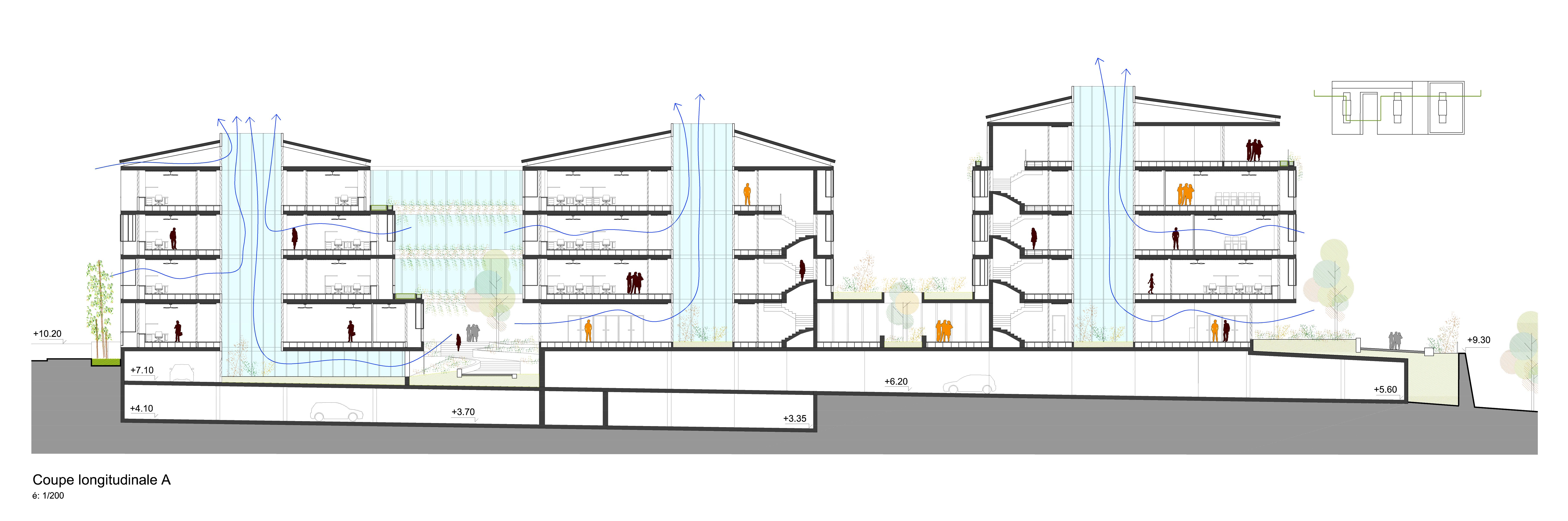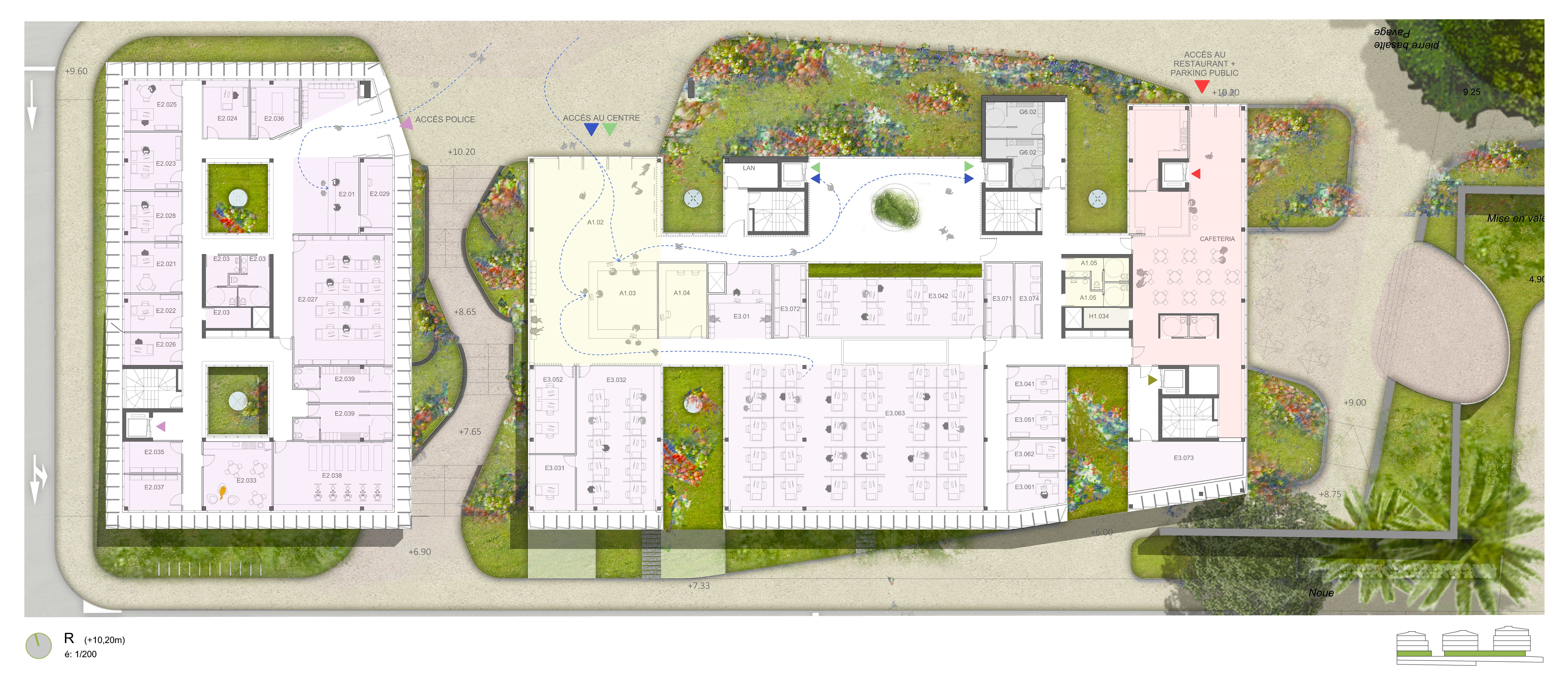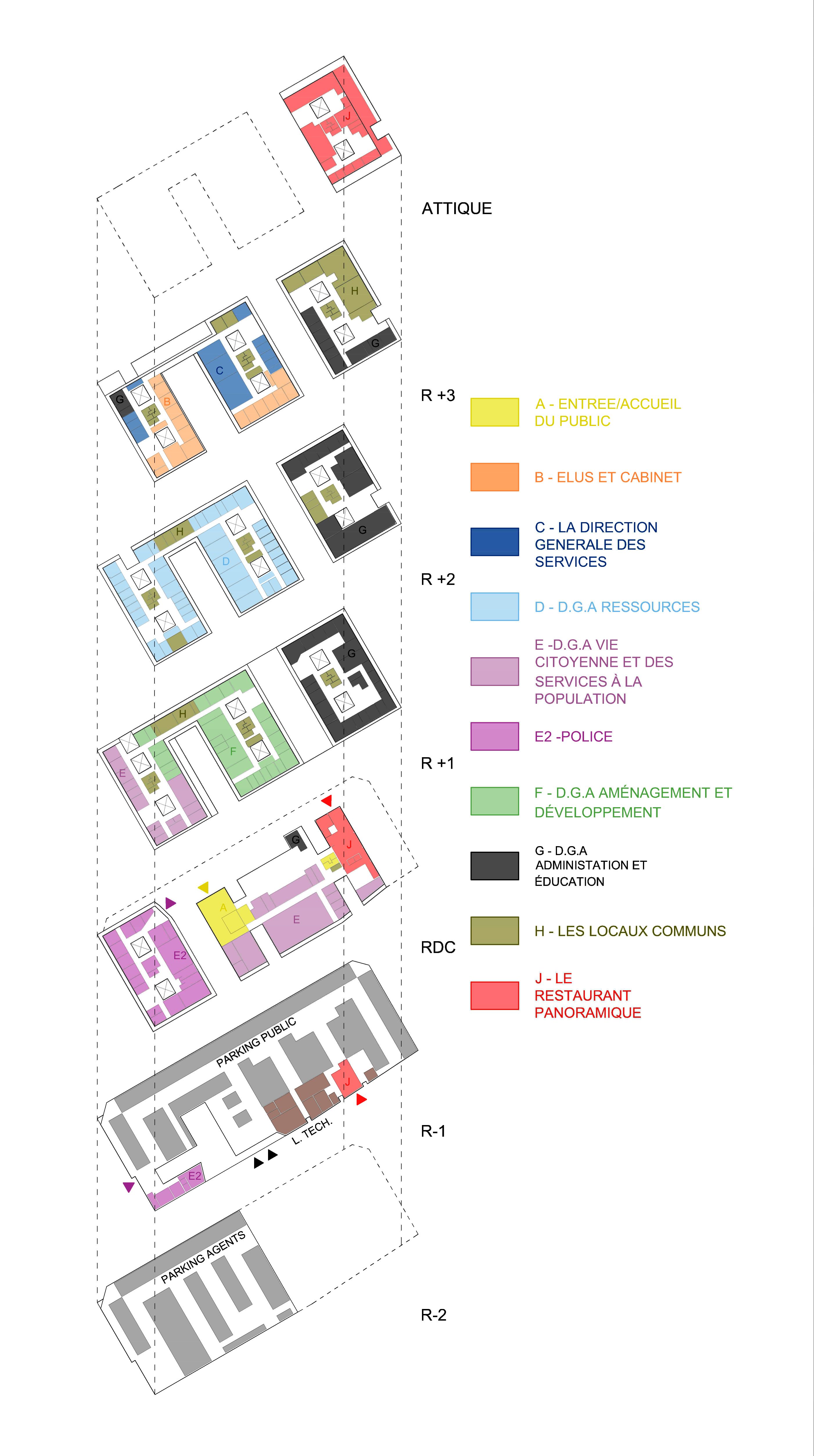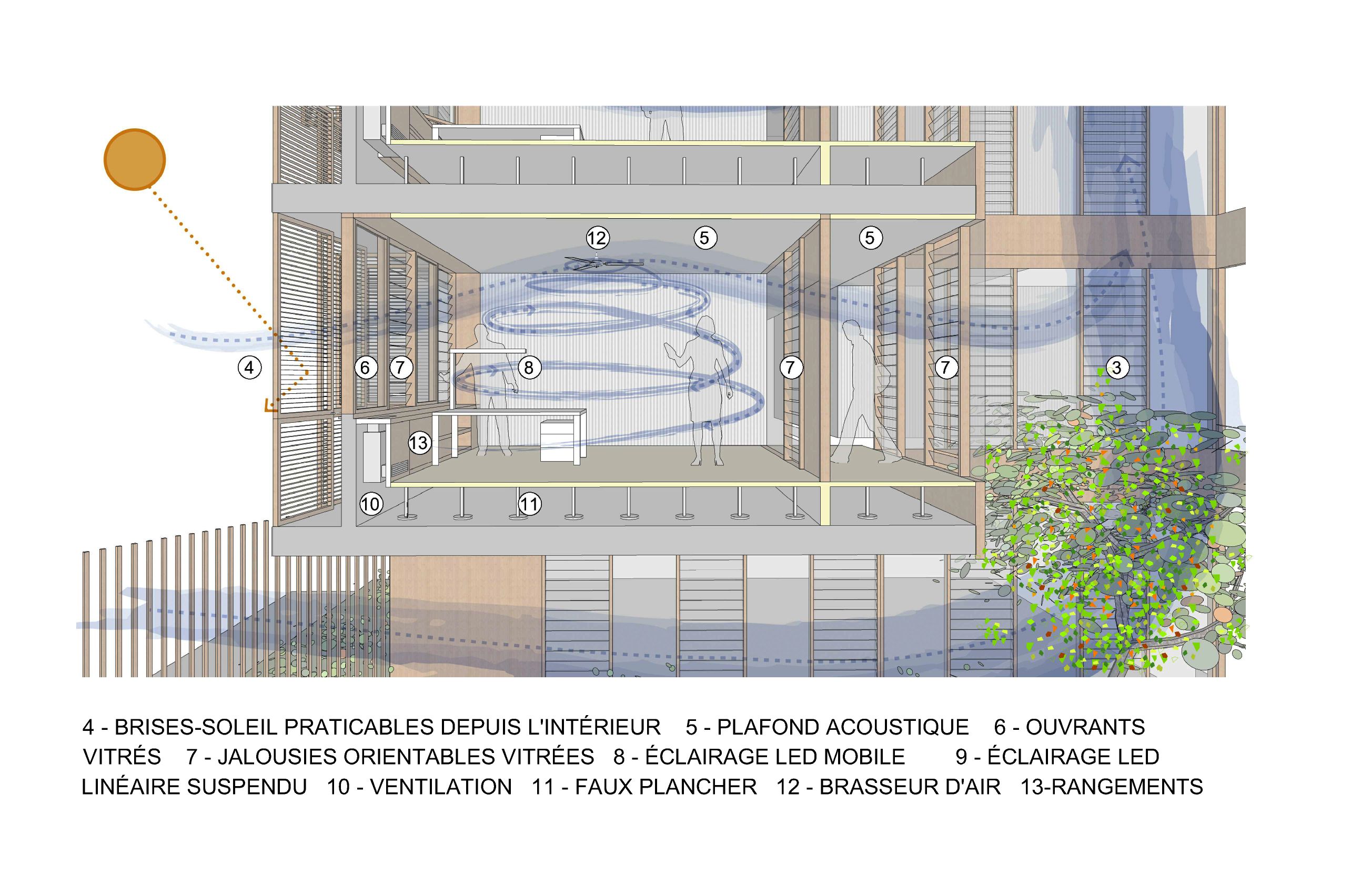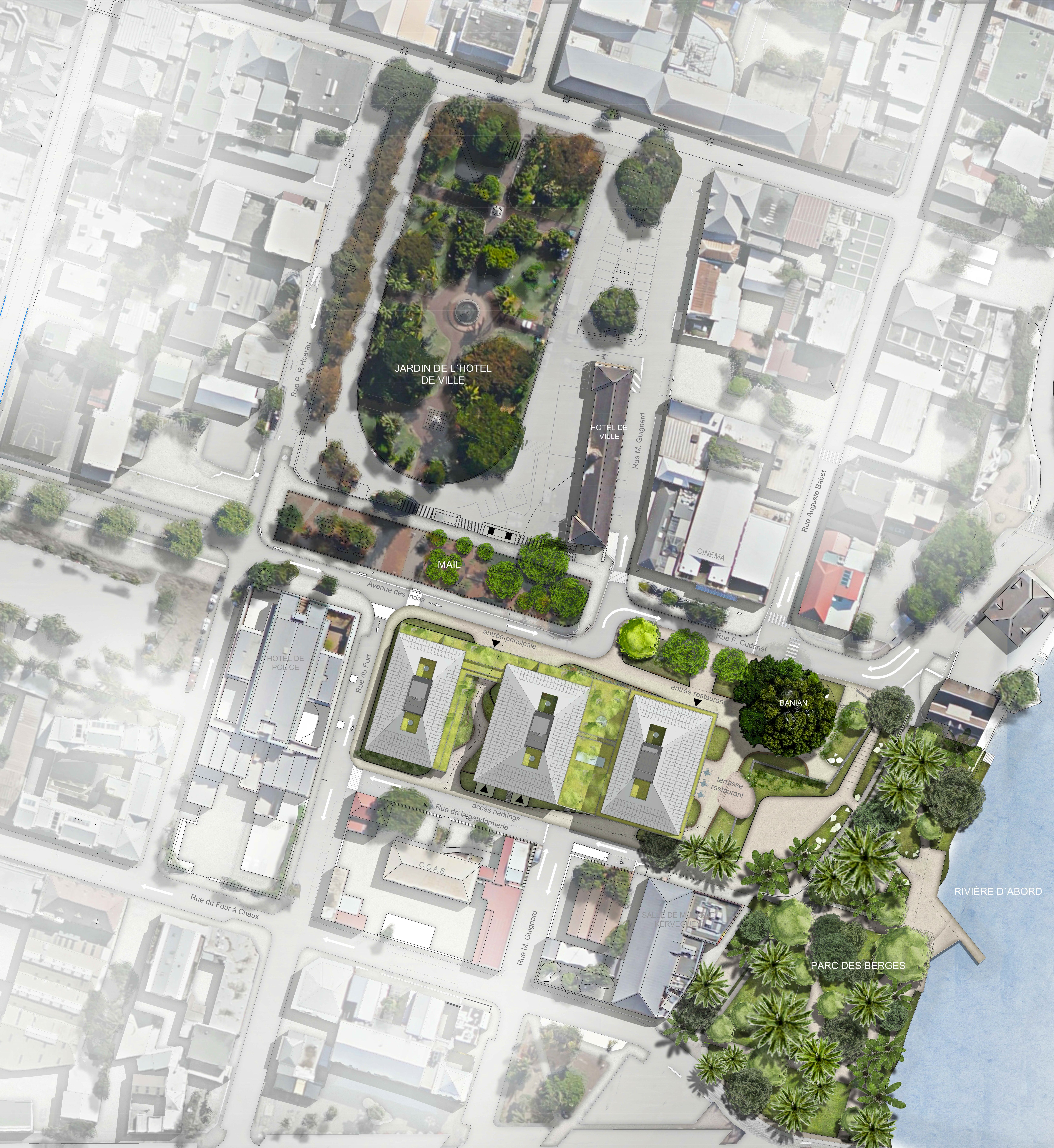 Die von der SPL unterstützte Stadt Saint-Pierre möchte die verschiedenen kommunalen Dienstleistungen, die auf verschiedene Standorte verteilt sind, zusammenführen, um die Betriebskosten zu senken und die Organisation der Dienstleistungen zu verbessern. Das Projekt im Herzen der Stadt und in der Nähe des historischen Rathauses ist als Flaggschiff konzipiert. Ziel ist es, einen neuen öffentlichen Platz zu schaffen, eine wahre Promenade mit grünen Gärten. Die Gebäude beherbergen verschiedene Verwaltungsabteilungen, Archiv- und Reprografie-Räumlichkeiten, eine Polizeistation, ein Panorama-Restaurant sowie Parkplätze. Das Gebäude ist in zwei funktionale Schichten unterteilt, die über den gesamten Standort verteilt sind, um die Zentralität des Ortes auszudrücken, und die Vielzahl der Funktionen aufzuzeigen. Der Vorplatz ist mit dekorativem Beton belegt und ist übersichtlich und minimalistisch in seiner Form, um die Architektur und Pflanzenformen zur Geltung zu bringen. Er wird von einem Skelettzaun eingerahmt, der durch seine geschwungene Form Passanten einlädt, die Verwaltungsstadt zu betreten und im landschaftlich gestalteten Durchgang die Insel zu überqueren. In jedem der Gebäude sind die Räumlichkeiten um zwei Terrassen herum angeordnet, die die Rolle eines thermischen Schornsteins spielen und den Durchquerungscharakter aller Räumlichkeiten sicherstellen, wodurch deren Funktion bei der natürlichen Belüftung gefördert wird. Die Nord-, Ost- und Westfassaden sind mit einer Doppelhaut mit Sonnenschutz in horizontalen Lamellen versehen. Die Öffnungen an der Vorderseite, auf den Terrassen und auf den Fluren sind mit Luftschlitzen versehen, um die Belüftung zu erleichtern. Mit Ausnahme von Räumen, die einer besonderen Behandlung bedürfen (Serverraum, Küchenvorbereitungsraum, Müllraum usw.) und sanitären Einrichtungen mit CMV, werden alle Räume 7 Monate im Jahr unter Verwendung von einem Kühlsystem natürlich ventiliert. Die Installation von Photovoltaikmodulen mit 210 kWp deckt 100% des Strombedarfs ab und entspricht der Solaranlage für Warmwasser. Sichtbares Holz wird für die Fassaden verwendet sowie eine abwechslungsreiche Vegetation im Freien. Für alle Funktionen (Büro, Restaurant) werden Abfallräume bereitgestellt, die eine Mülltrennung an der Quelle ermöglichen, und das Abwasser des Restaurants wird durch einen Fettabscheider geleitet. Der Trinkwasserverbrauch wird durch die Installation von Durchflussbegrenzern sowie durch die Beleuchtung mit Präsenzmeldern begrenzt.