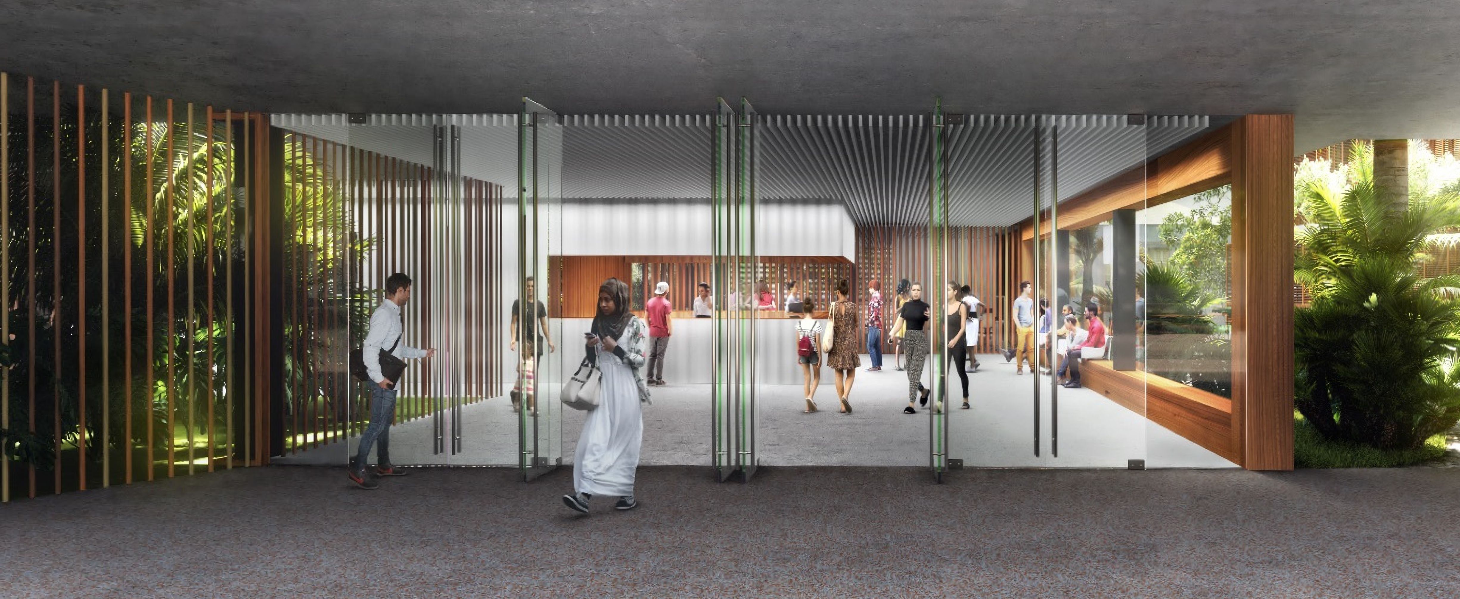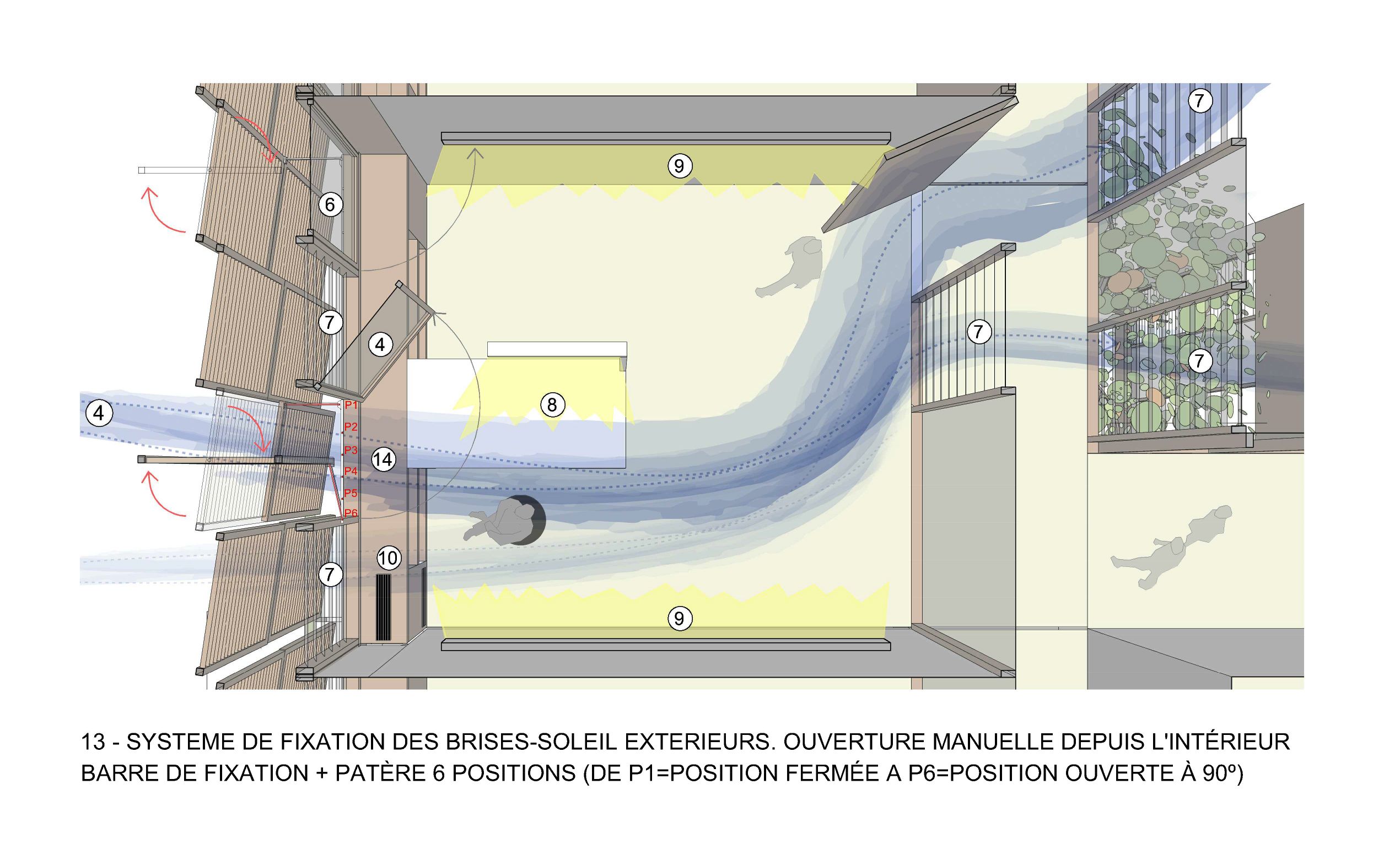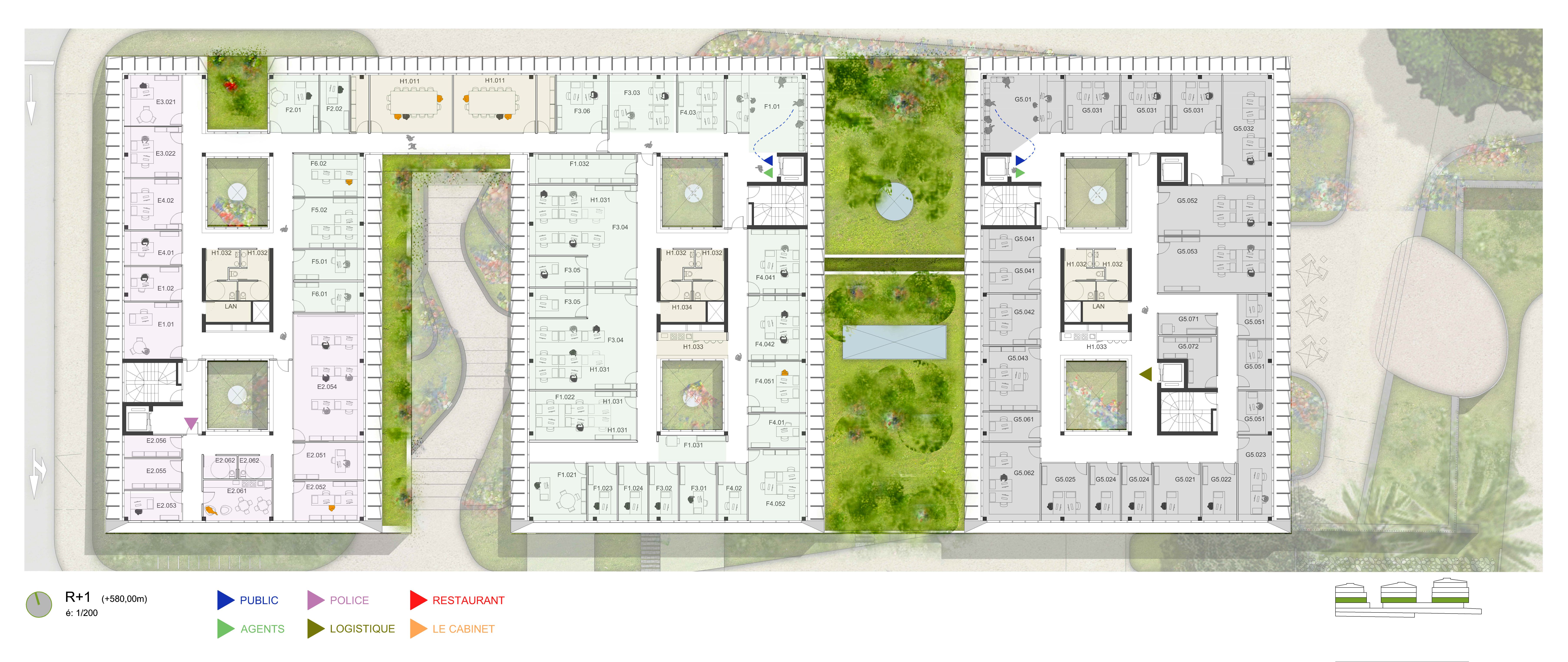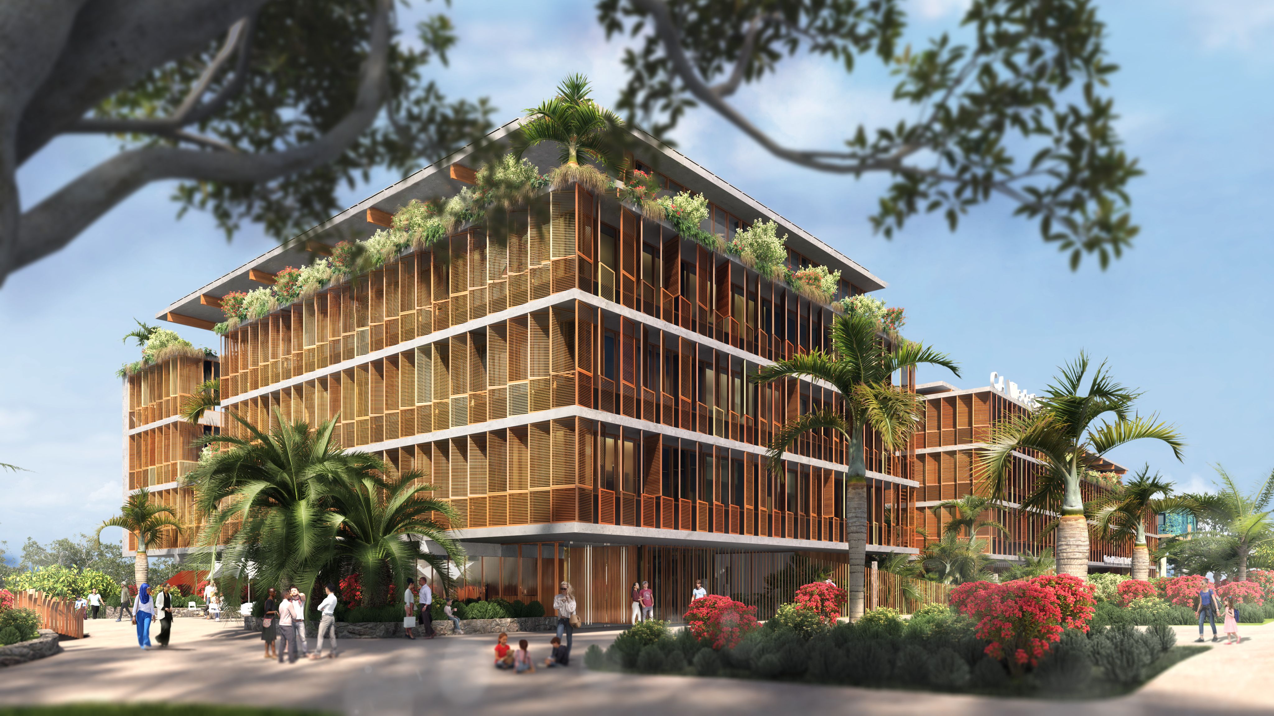 Die von der SPL unterstützte Stadt Saint-Pierre möchte die verschiedenen kommunalen Dienstleistungen, die auf verschiedene Standorte verteilt sind, zusammenführen, um die Betriebskosten zu senken und die Organisation der Dienstleistungen zu verbessern. Das Projekt im Herzen der Stadt und in der Nähe des historischen Rathauses ist als Flaggschiff konzipiert. Ziel ist es, einen neuen öffentlichen Platz zu schaffen, eine wahre Promenade mit grünen Gärten. Die Gebäude beherbergen verschiedene Verwaltungsabteilungen, Archiv- und Reprografie-Räumlichkeiten, eine Polizeistation, ein Panorama-Restaurant sowie Parkplätze. Das Gebäude ist in zwei funktionale Schichten unterteilt, die über den gesamten Standort verteilt sind, um die Zentralität des Ortes auszudrücken, und die Vielzahl der Funktionen aufzuzeigen. Der Vorplatz ist mit dekorativem Beton belegt und ist übersichtlich und minimalistisch in seiner Form, um die Architektur und Pflanzenformen zur Geltung zu bringen. Er wird von einem Skelettzaun eingerahmt, der durch seine geschwungene Form Passanten einlädt, die Verwaltungsstadt zu betreten und im landschaftlich gestalteten Durchgang die Insel zu überqueren. In jedem der Gebäude sind die Räumlichkeiten um zwei Terrassen herum angeordnet, die die Rolle eines thermischen Schornsteins spielen und den Durchquerungscharakter aller Räumlichkeiten sicherstellen, wodurch deren Funktion bei der natürlichen Belüftung gefördert wird. Die Nord-, Ost- und Westfassaden sind mit einer Doppelhaut mit Sonnenschutz in horizontalen Lamellen versehen. Die Öffnungen an der Vorderseite, auf den Terrassen und auf den Fluren sind mit Luftschlitzen versehen, um die Belüftung zu erleichtern. Mit Ausnahme von Räumen, die einer besonderen Behandlung bedürfen (Serverraum, Küchenvorbereitungsraum, Müllraum usw.) und sanitären Einrichtungen mit CMV, werden alle Räume 7 Monate im Jahr unter Verwendung von einem Kühlsystem natürlich ventiliert. Die Installation von Photovoltaikmodulen mit 210 kWp deckt 100% des Strombedarfs ab und entspricht der Solaranlage für Warmwasser. Sichtbares Holz wird für die Fassaden verwendet sowie eine abwechslungsreiche Vegetation im Freien. Für alle Funktionen (Büro, Restaurant) werden Abfallräume bereitgestellt, die eine Mülltrennung an der Quelle ermöglichen, und das Abwasser des Restaurants wird durch einen Fettabscheider geleitet. Der Trinkwasserverbrauch wird durch die Installation von Durchflussbegrenzern sowie durch die Beleuchtung mit Präsenzmeldern begrenzt.